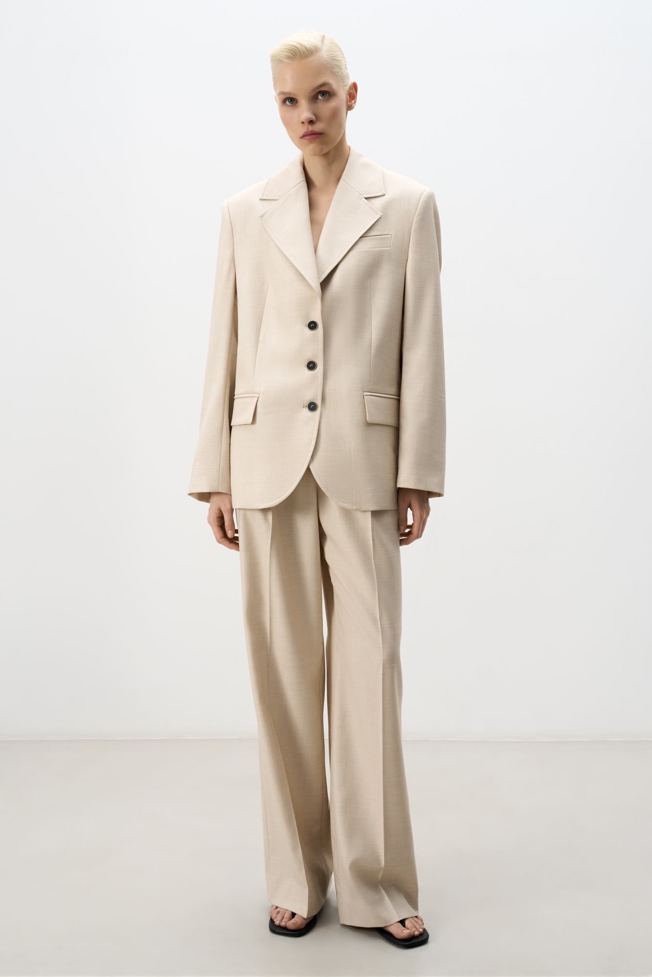 Однобортный жакет из шерсти. Модель свободного силуэта с лацканами, боковыми карманами с клапанами и карманом на груди. Застежка на три пуговицы. Изделие выполнено на подкладке. Дополнить образ можно брюками или юбкой.