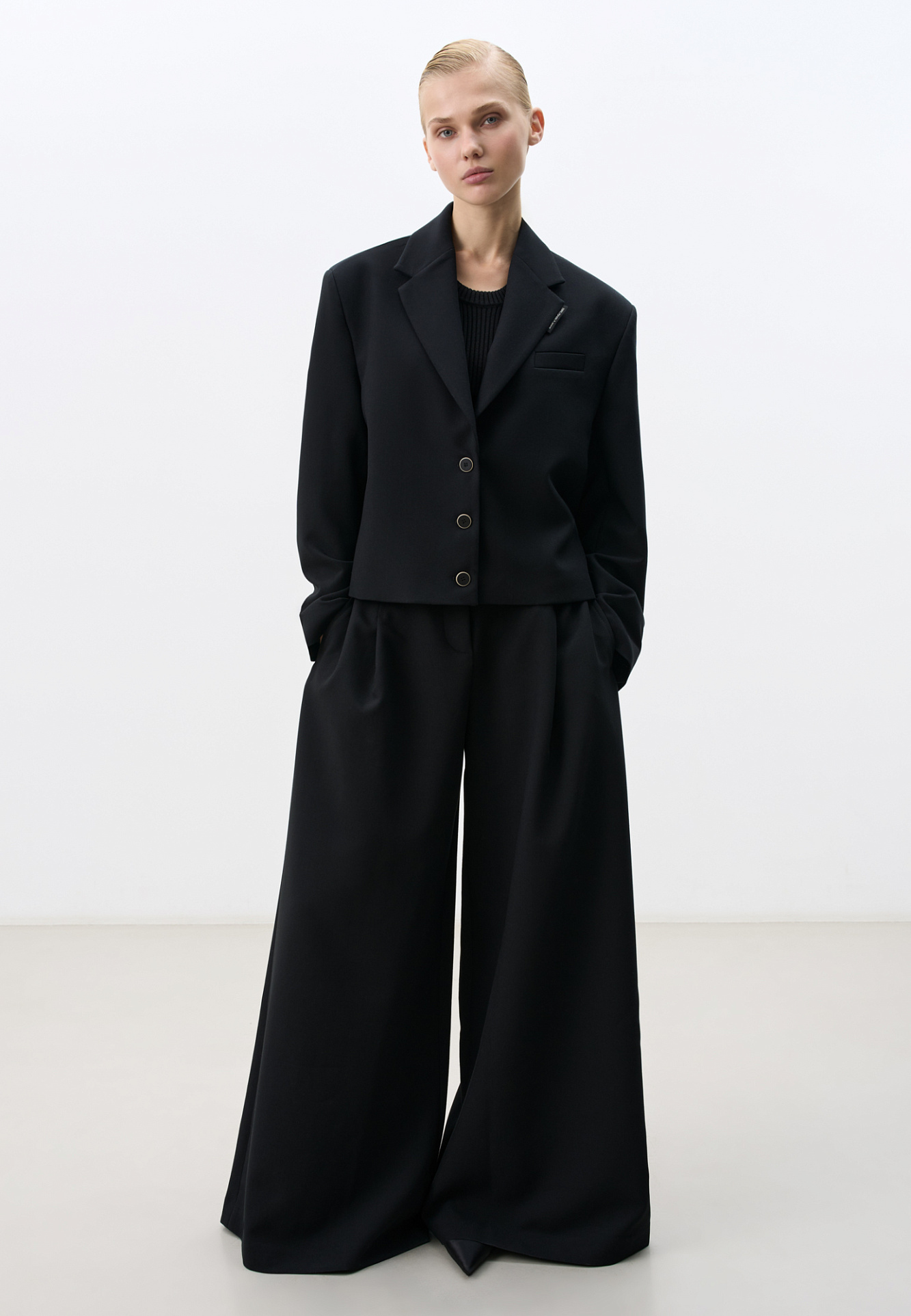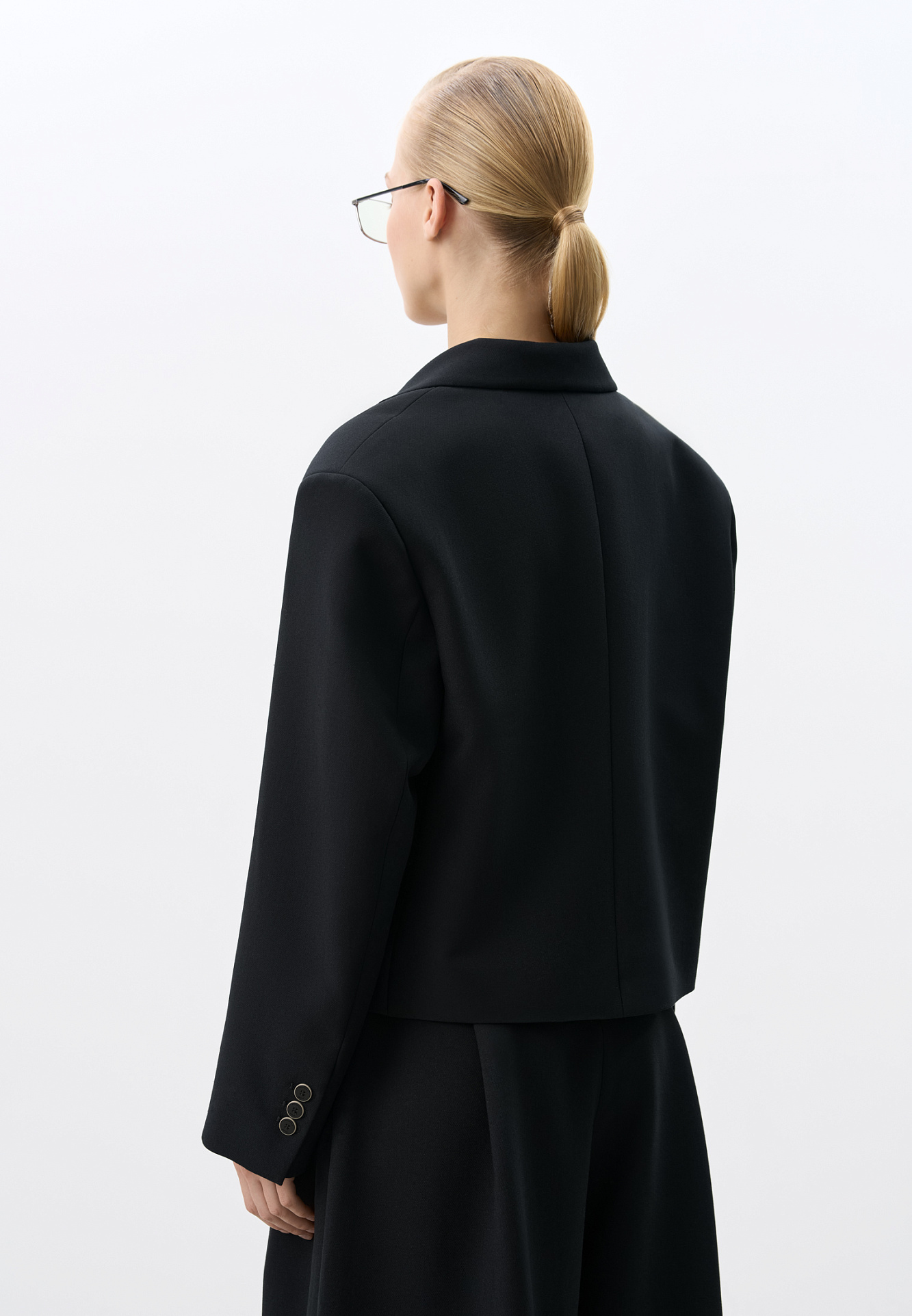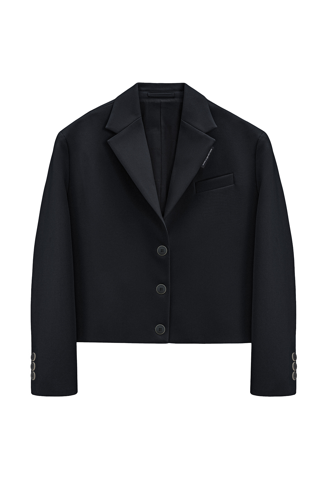 Укороченный жакет из поливискозы. Модель прямого кроя с классическим отложным воротником, карманом на груди и пуговицами на манжетах. Изделие на подкладке. Застежка на пуговицы.
