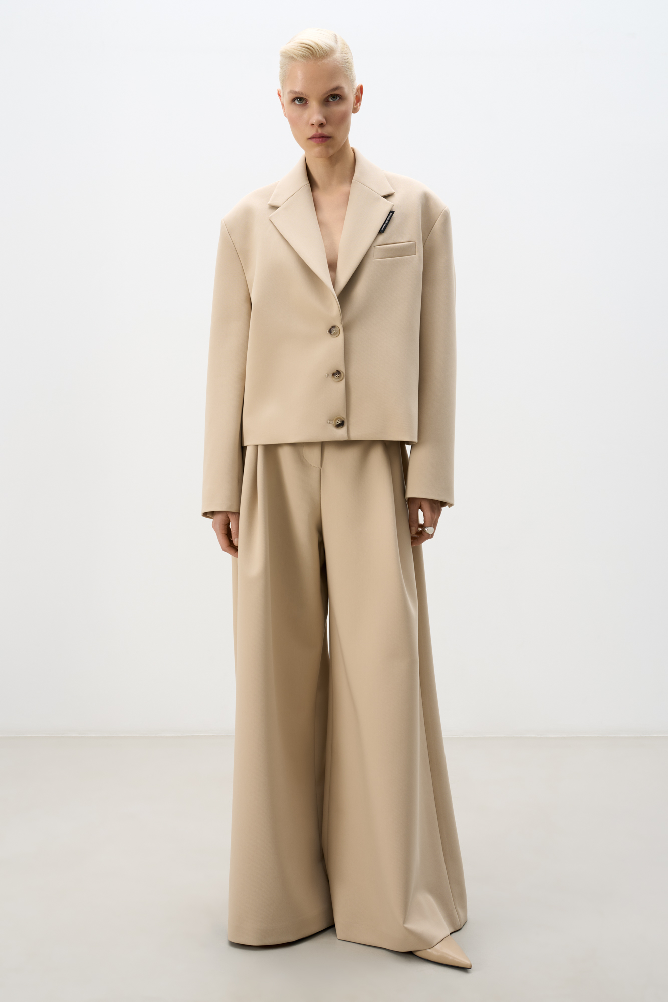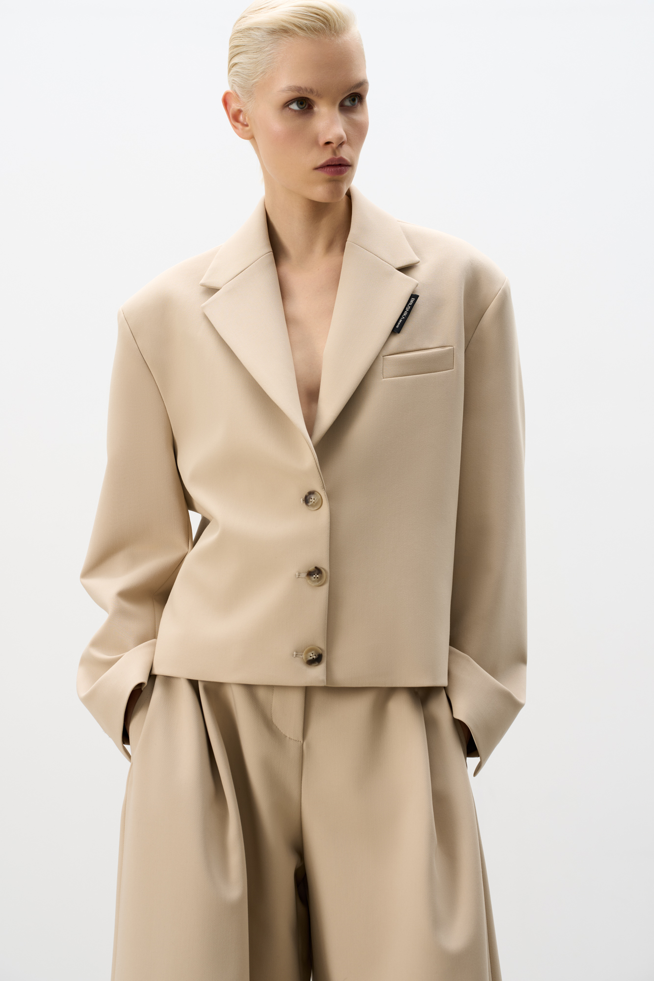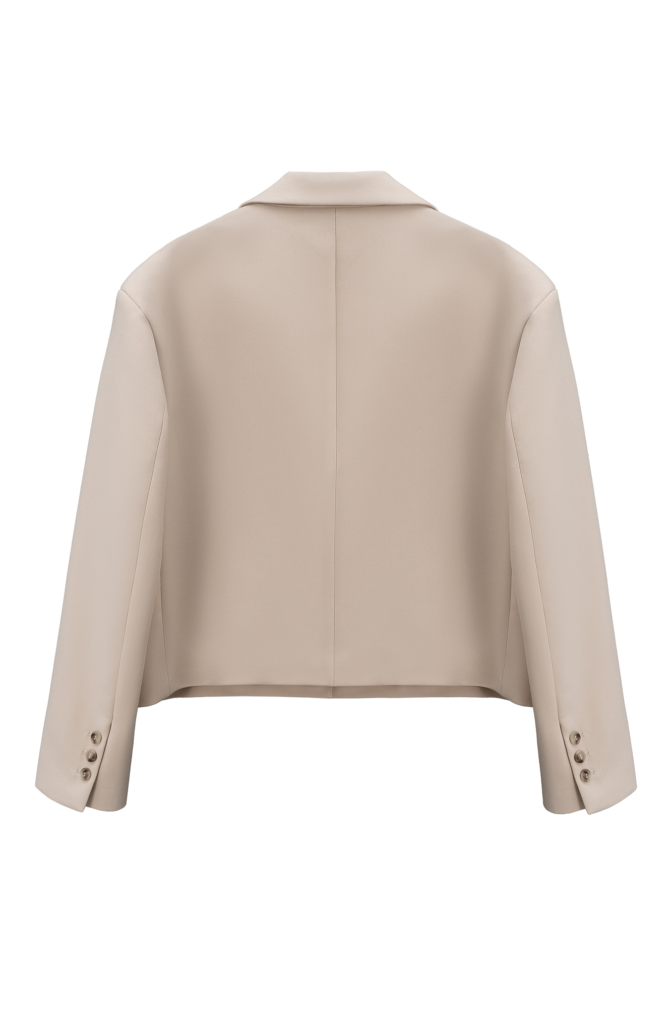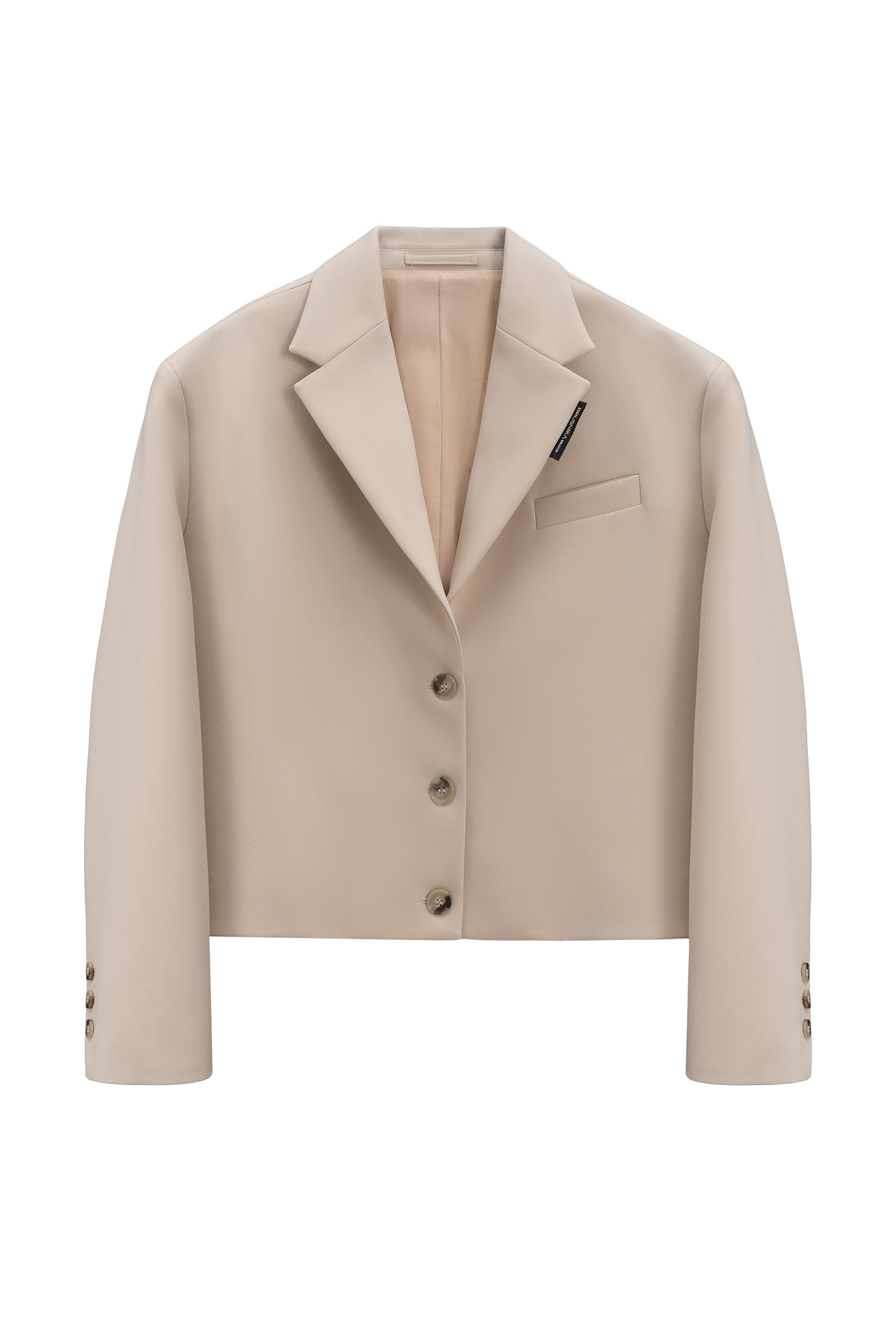Укороченный жакет из поливискозы. Модель прямого кроя с классическим отложным воротником, карманом на груди и пуговицами на манжетах. Изделие на подкладке. Застежка на пуговицы.
