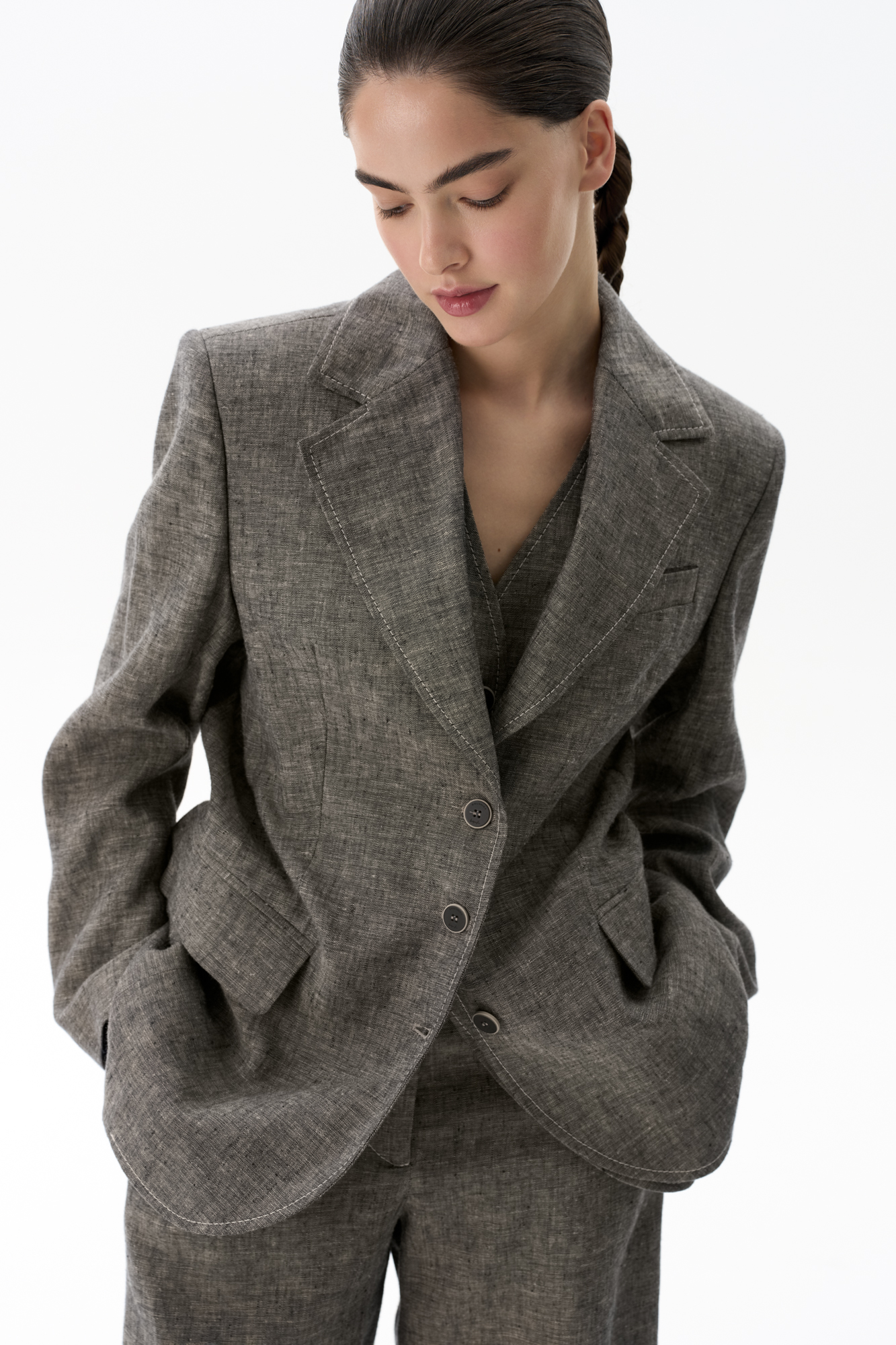 Однобортный жакет из 100% льна. Модель приталенного силуэта, с классическим английским воротником, нагрудным карманом, боковыми прорезными карманами с клапанами и отстрочкой контрастного цвета. Застежка на три пуговицы. Изделие без подкладки.