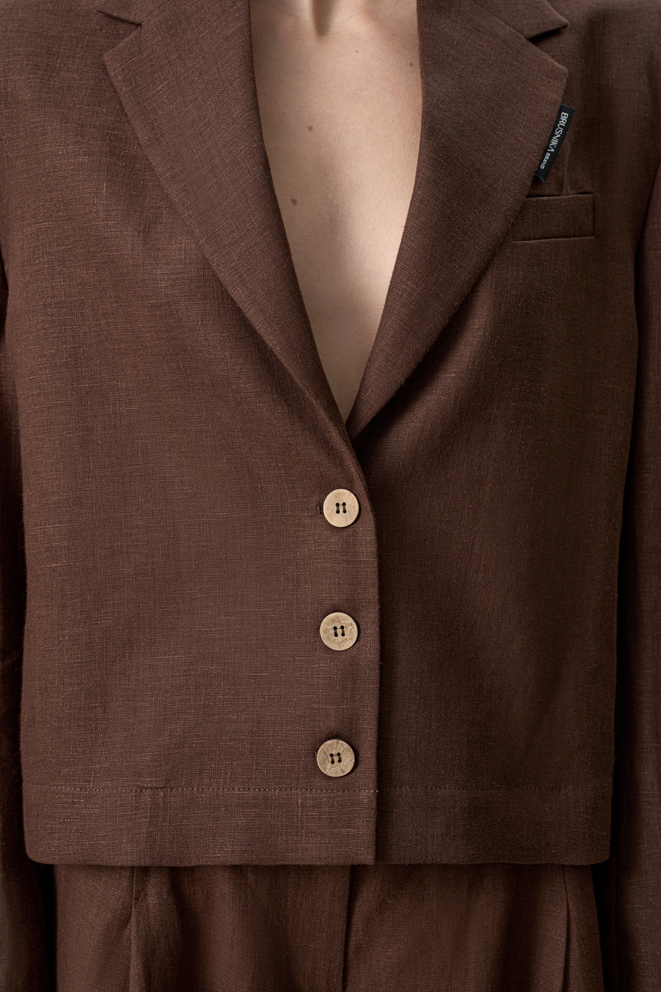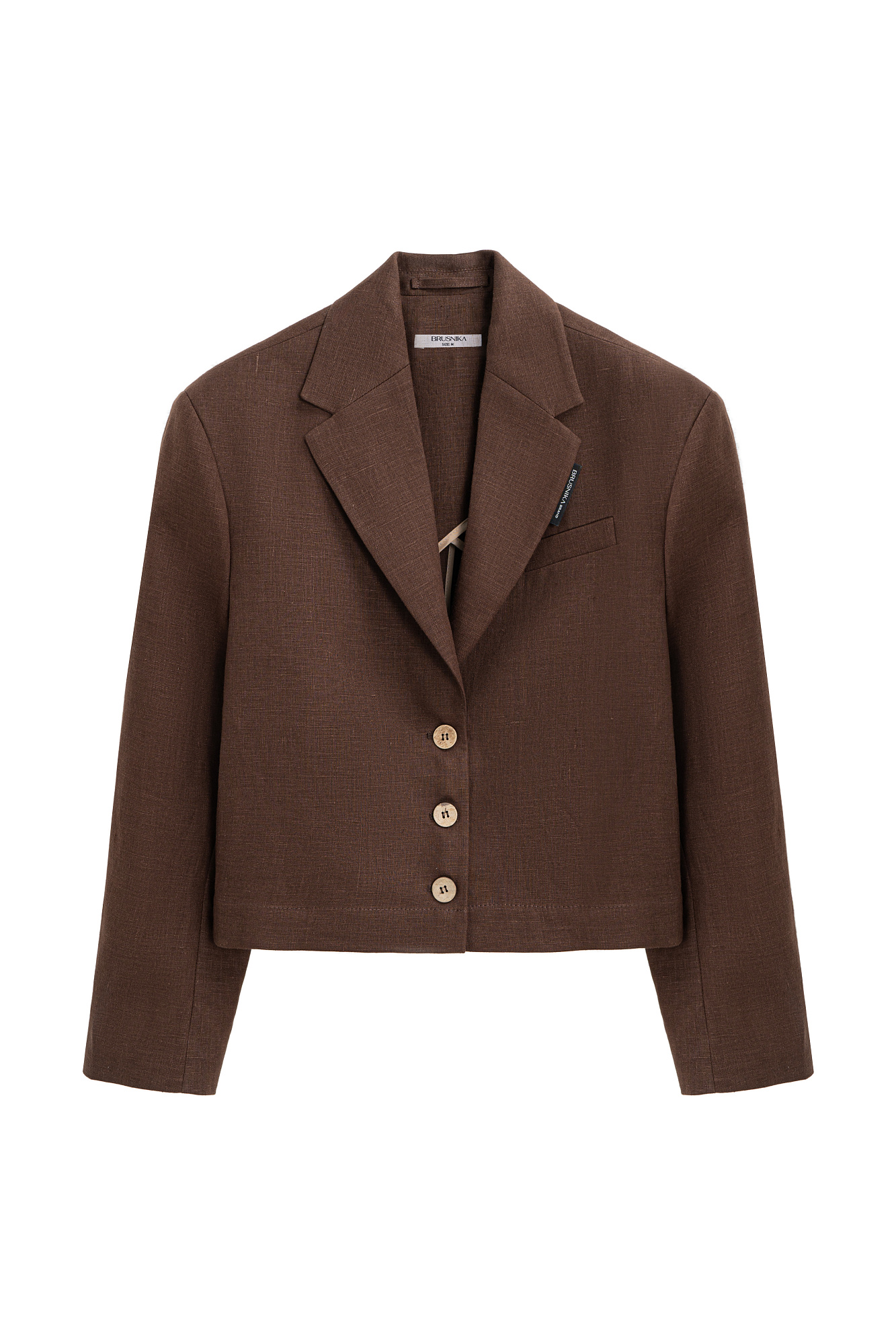 Укороченный жакет из 100% льна. Модель прямого кроя с классическим отложным воротником, карманом на груди и пуговицами на манжетах. Изделие на подкладке. Застежка на три пуговицы. Брендированный ярлык на лацкане.