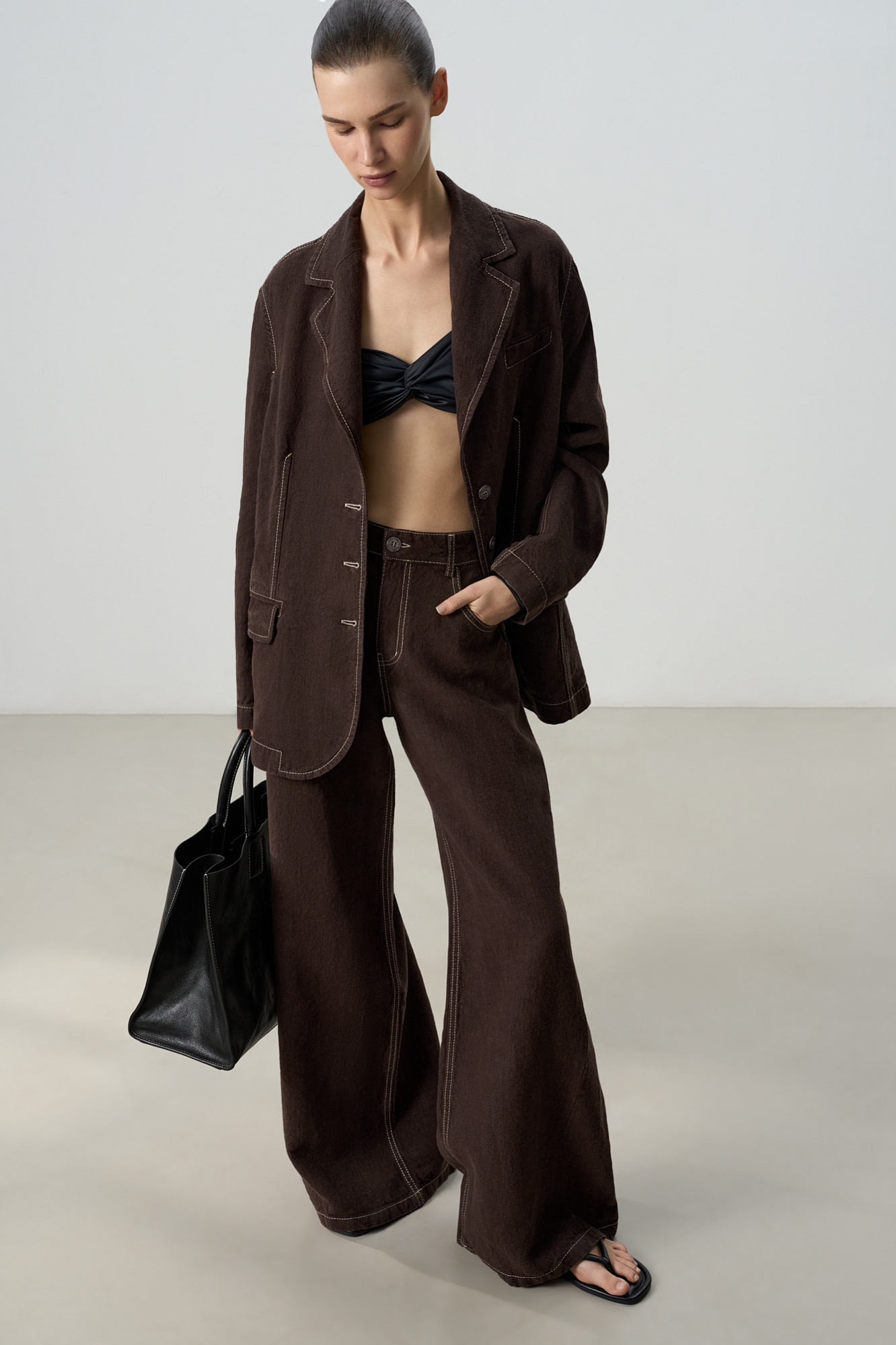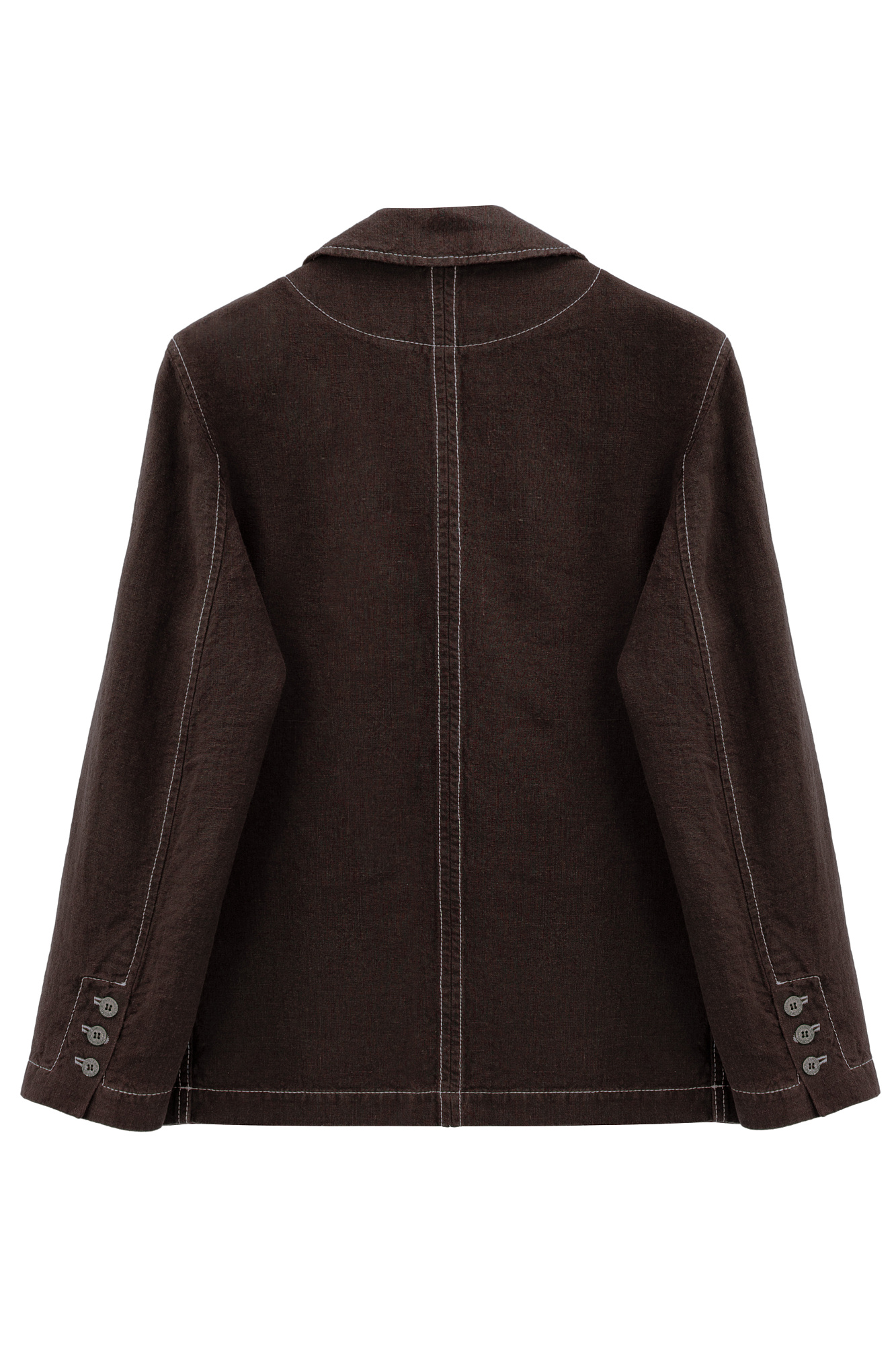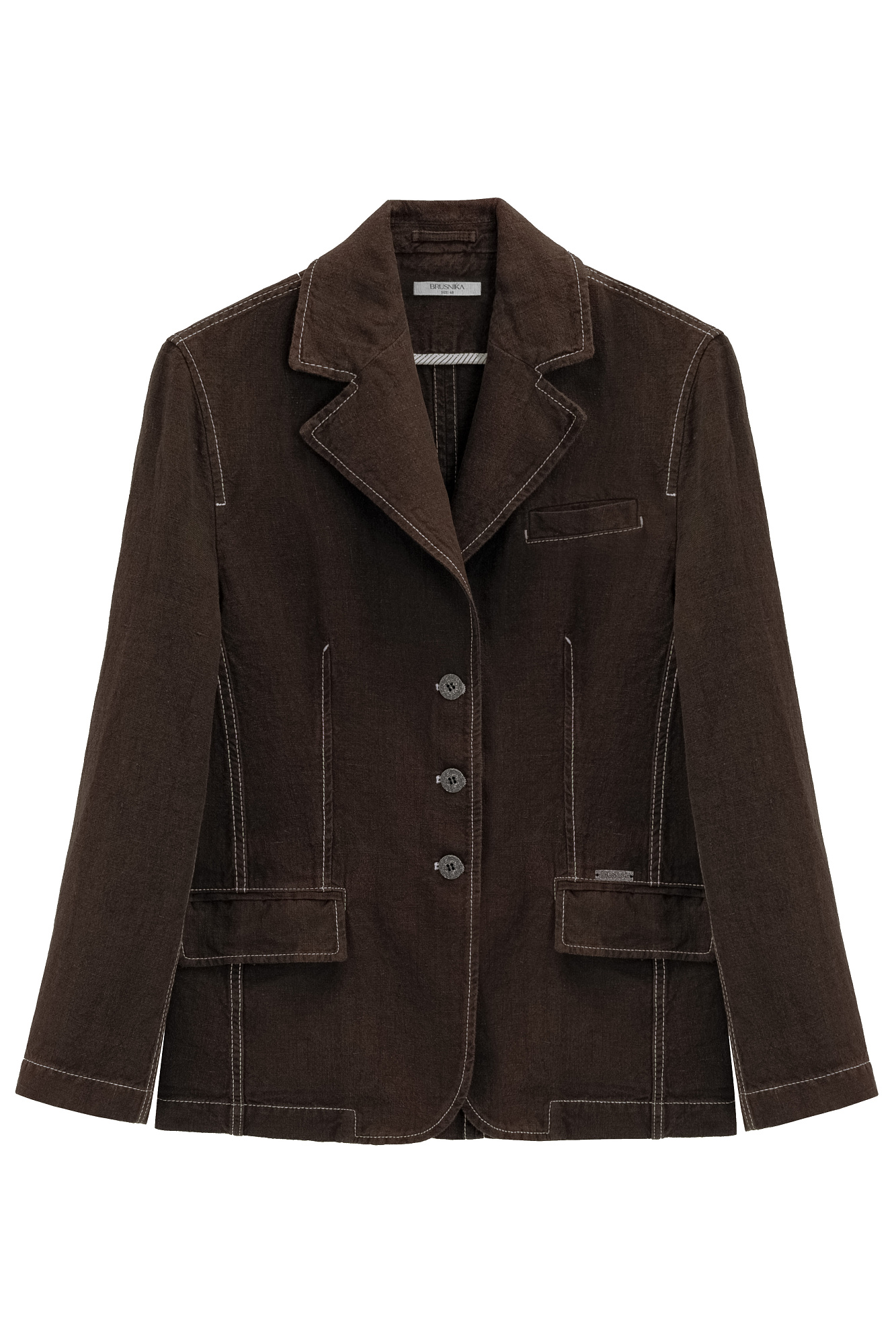 Классический однобортный жакет из 100% льна. Модель прямого кроя, с широкими лацканами и застежкой на три пуговицы. Нагрудный и два прорезных кармана с клапанами. Изделие декорировано строчкой контрастного цвета.