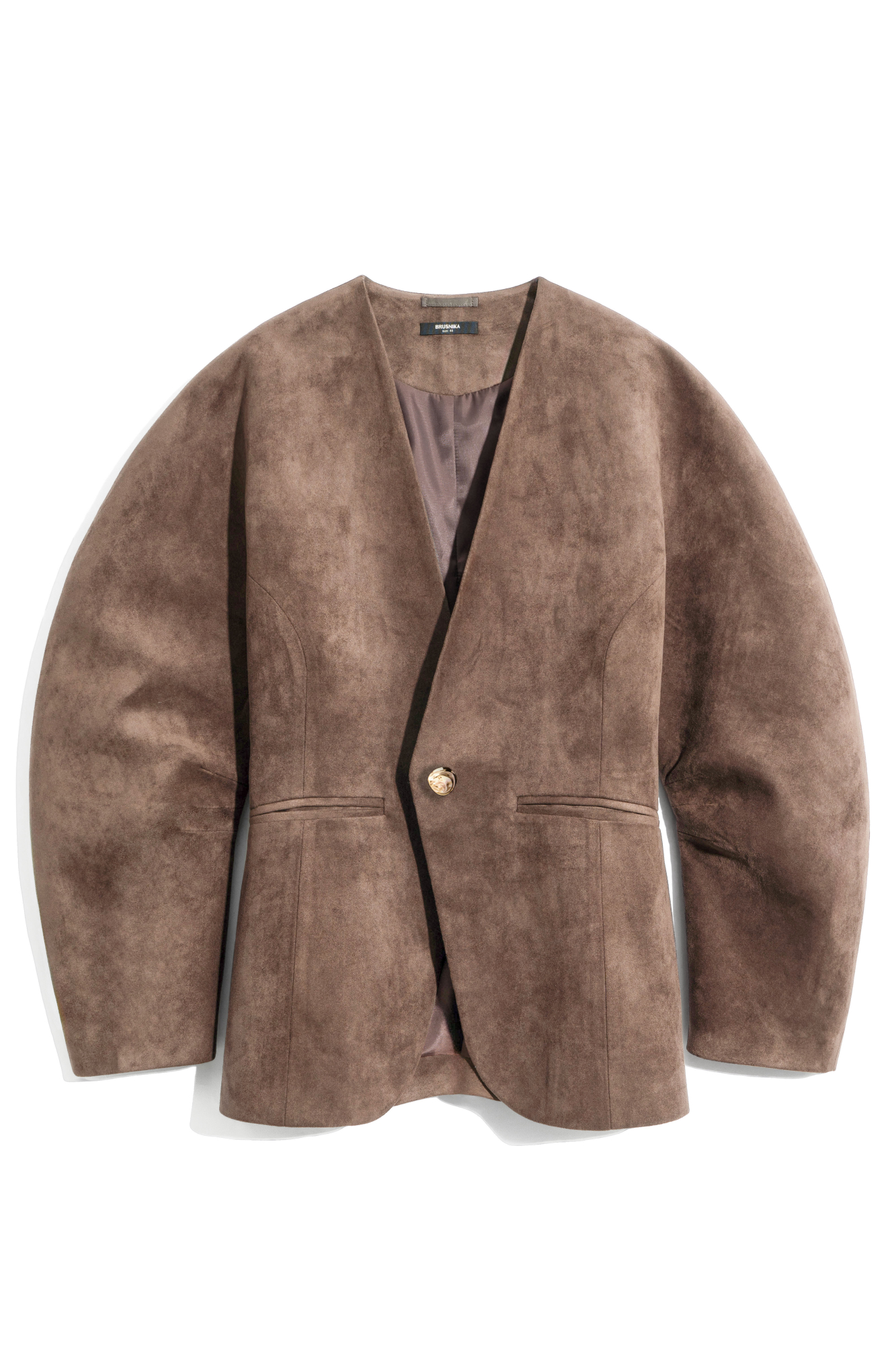 Однобортный жакет из ткани с имитацией внешнего вида и свойств натуральной замши. Модель без лацканов с большими объемными рукавами и боковыми прорезными карманами. Изделие на подкладке.