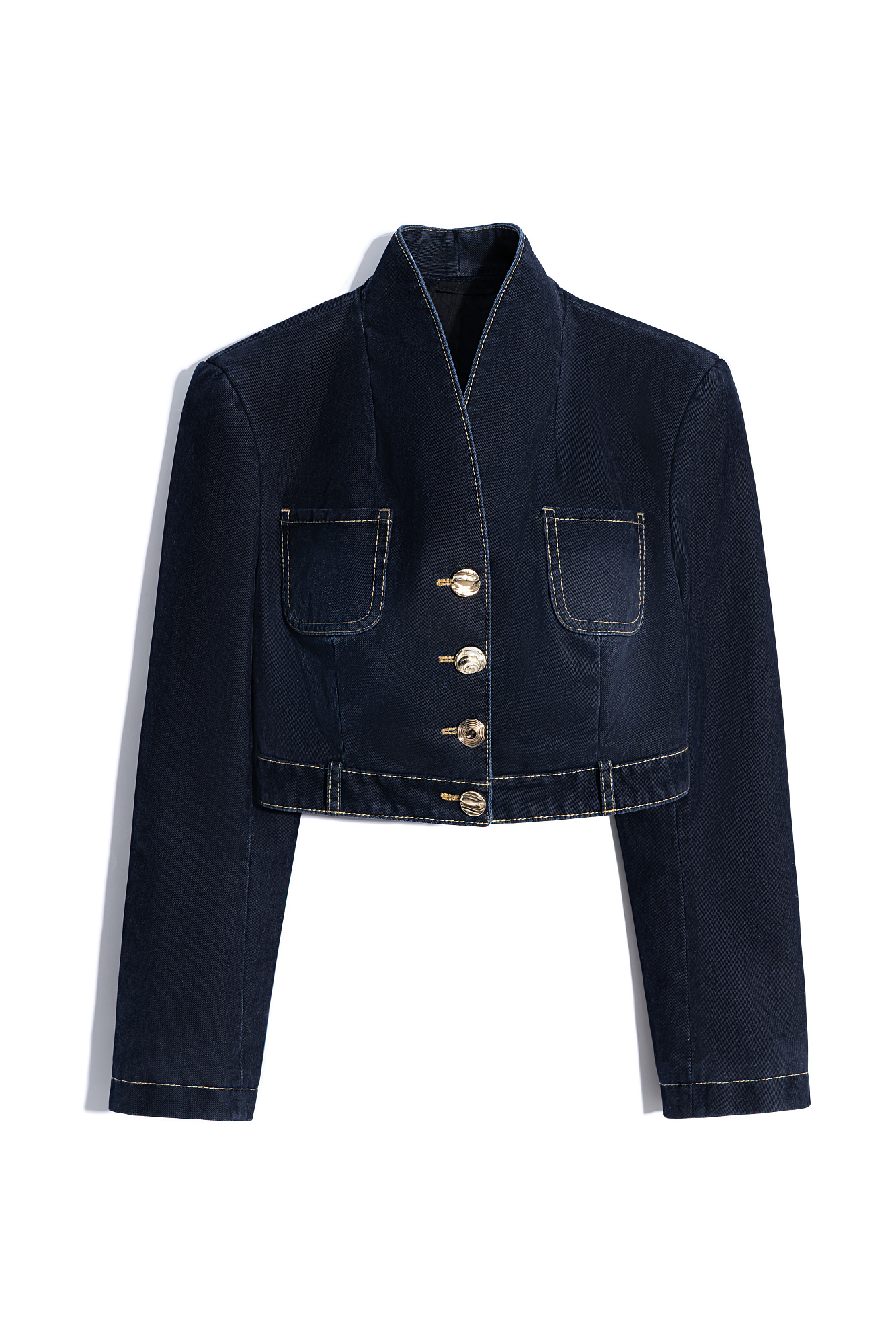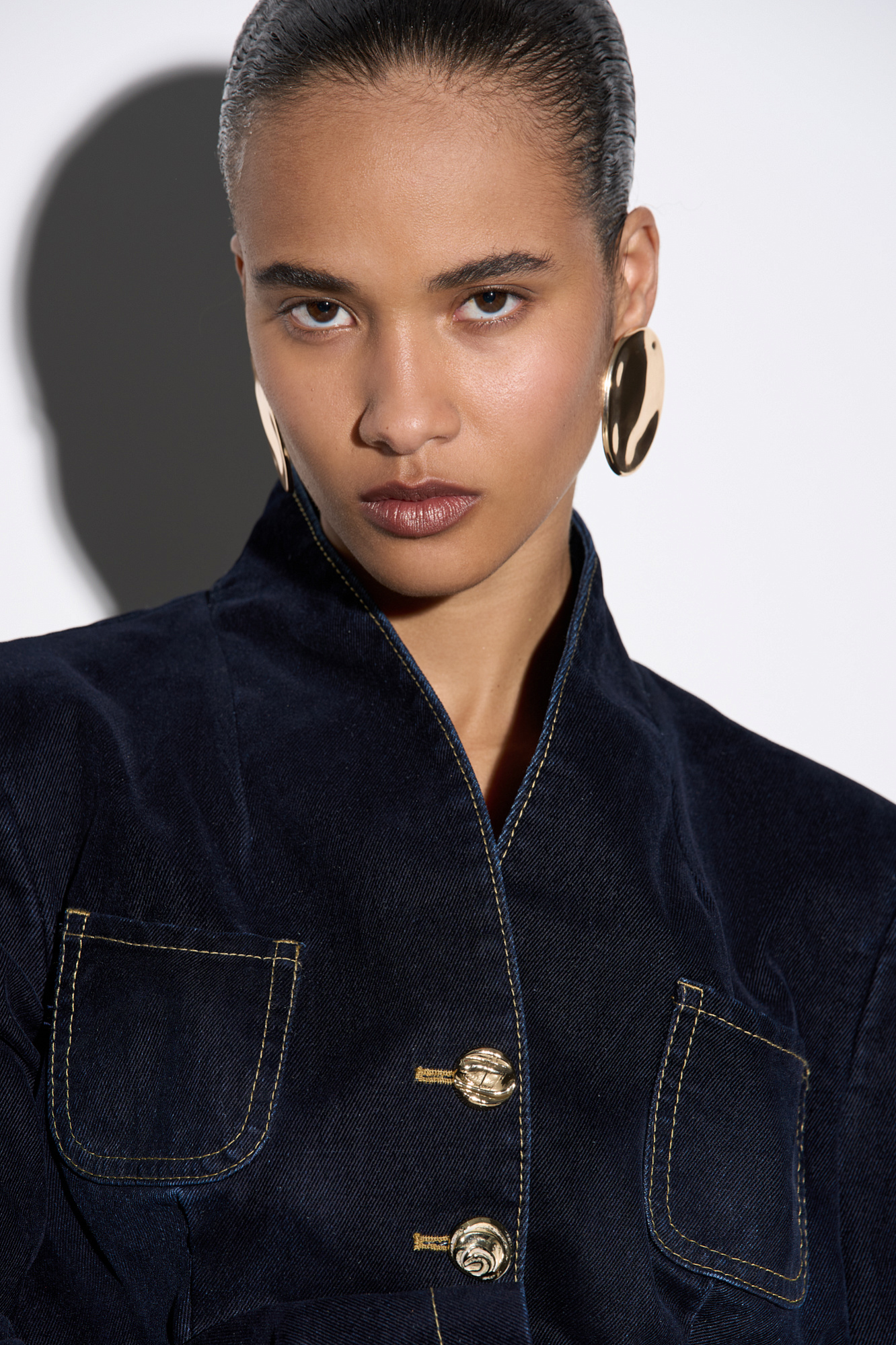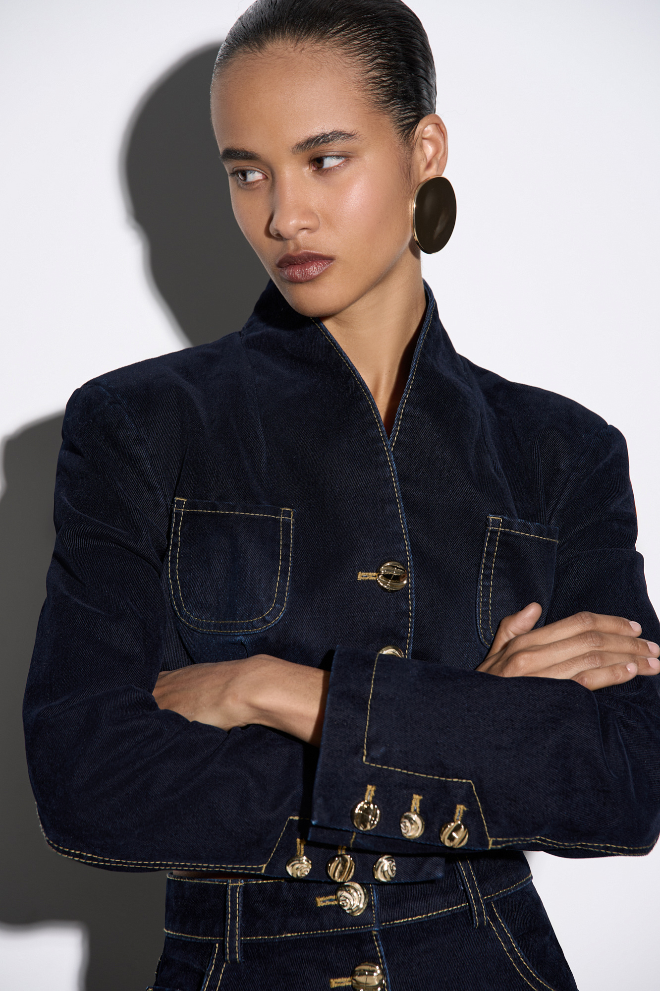 Укороченный жакет из флокированного денима - 100% хлопка с имитацией бархатной текстуры. Застежка на декоративные пуговицы. Модель свободного силуэта с воротником без лацканов и накладными карманами. Изделие с подплечниками, выполнено на подкладке.