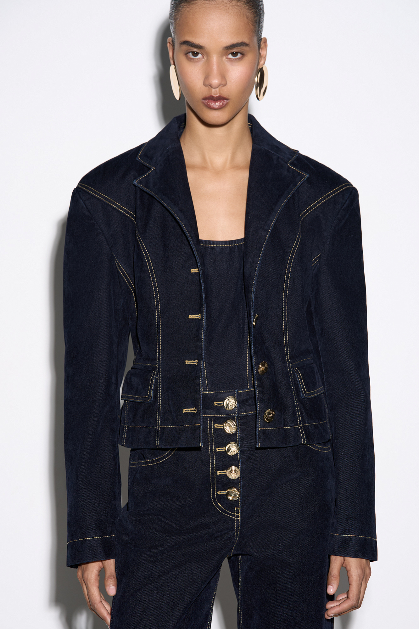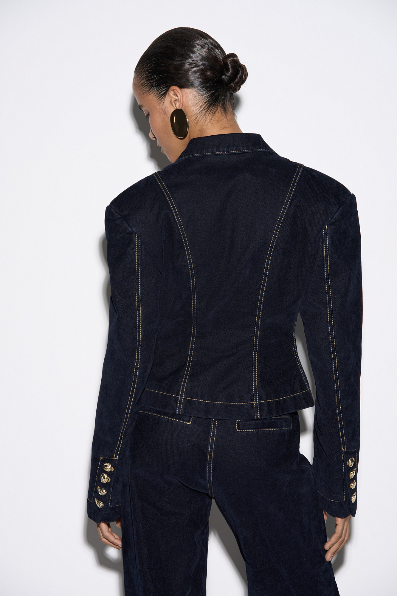 Укороченный жакет из флокированного денима - 100% хлопка с имитацией бархатной текстуры. Модель приталенного силуэта с узкими лацканами, карманами с клапанами и подплечниками. Застежка на крупные пуговицы. Изделие выполнено на подкладке.