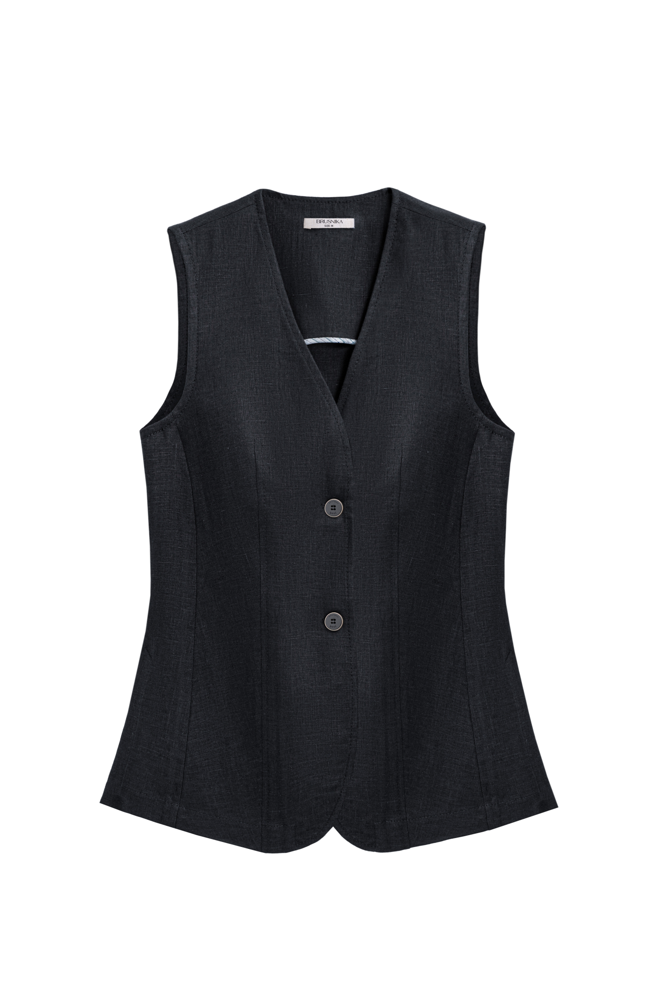 Удлиненный жилет из 100% льна. Модель приталенного силуэта, с V-образным вырезом горловины, вертикальными вытачками, ремнем на спинке и разрезами по бокам. Изделие бех подкладки.