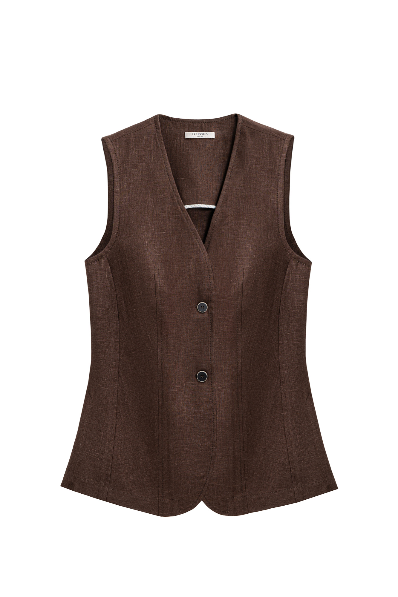 Удлиненный жилет из 100% льна. Модель приталенного силуэта, с V-образным вырезом горловины, вертикальными вытачками, ремнем на спинке и разрезами по бокам. Изделие бех подкладки.