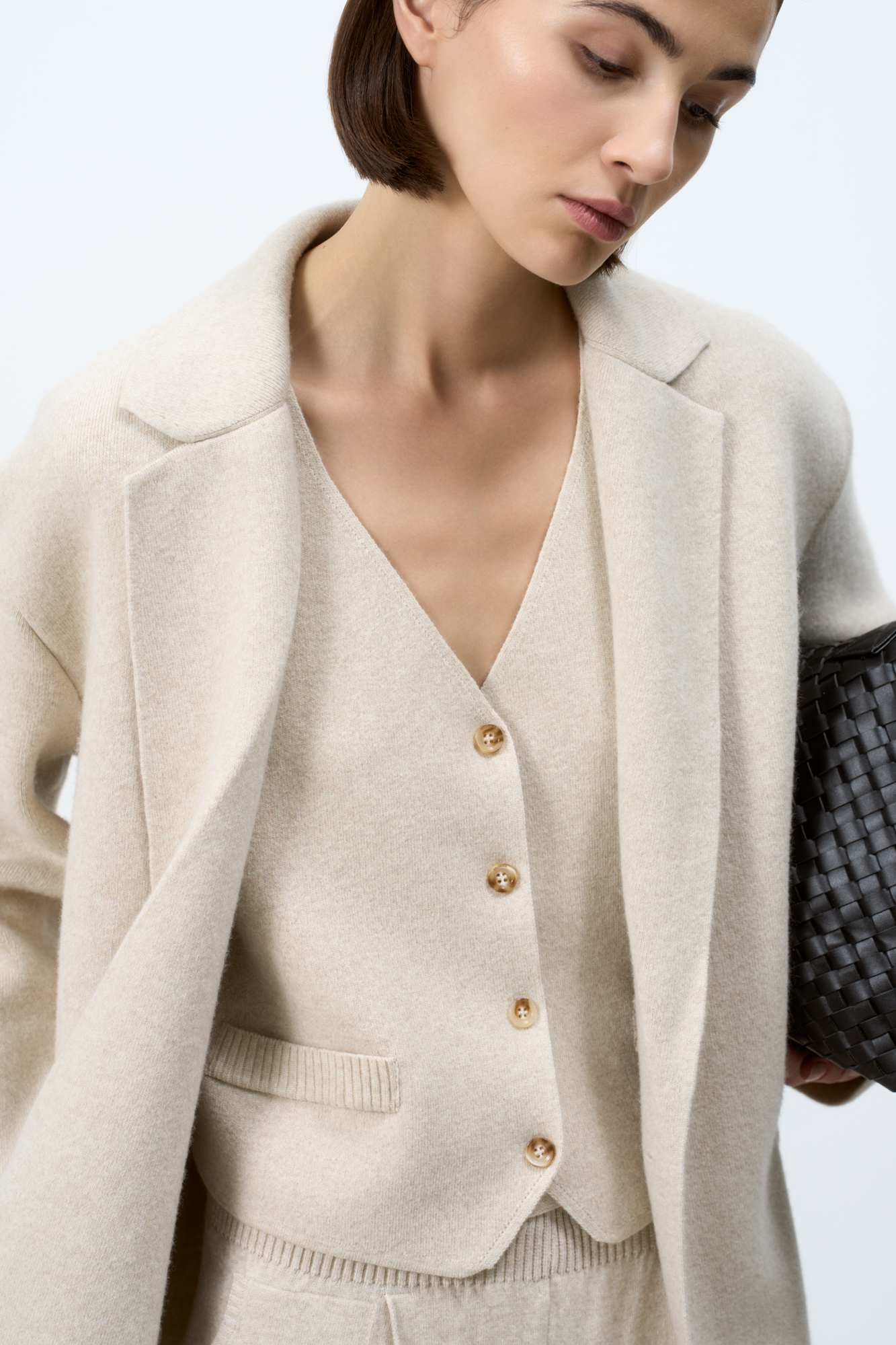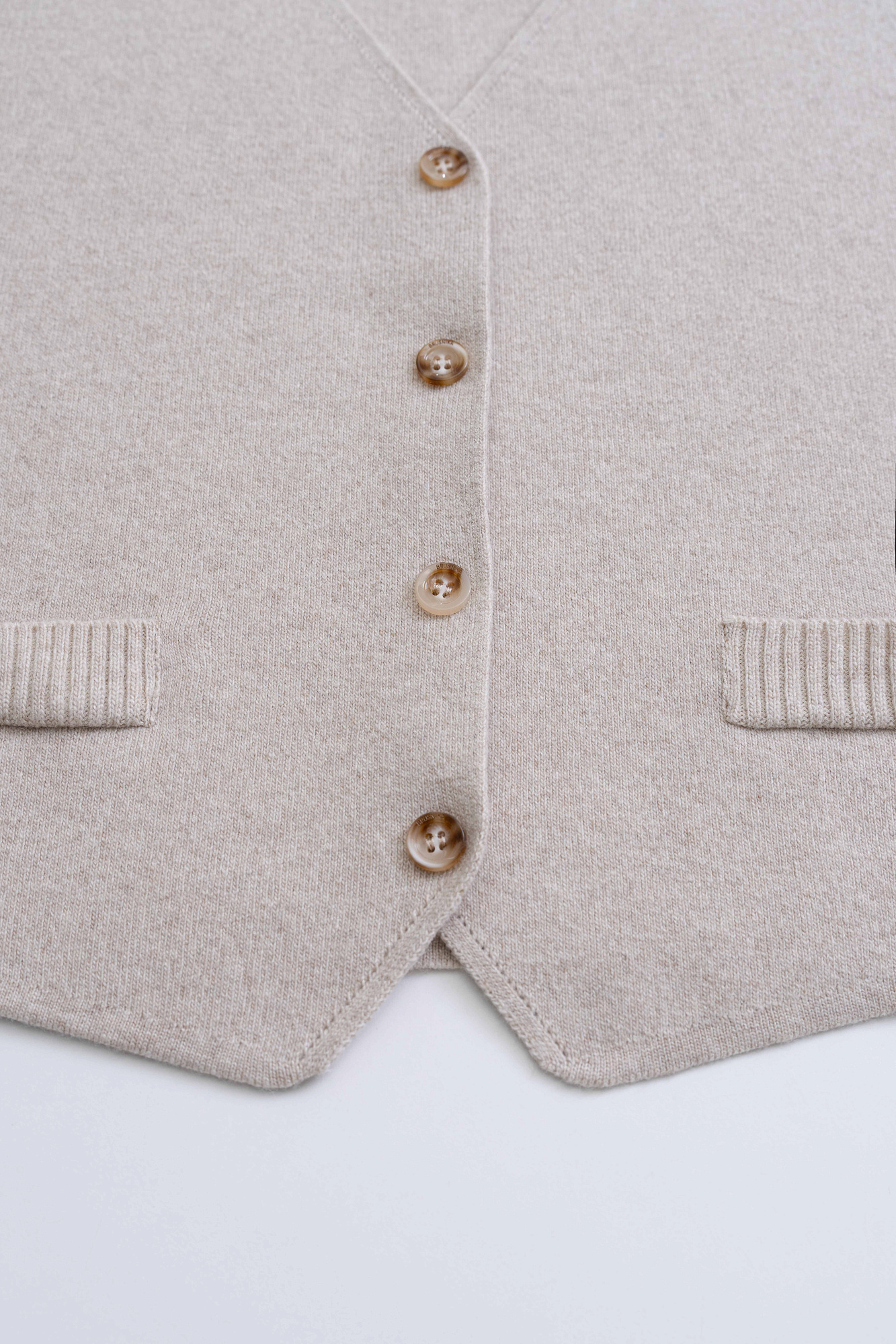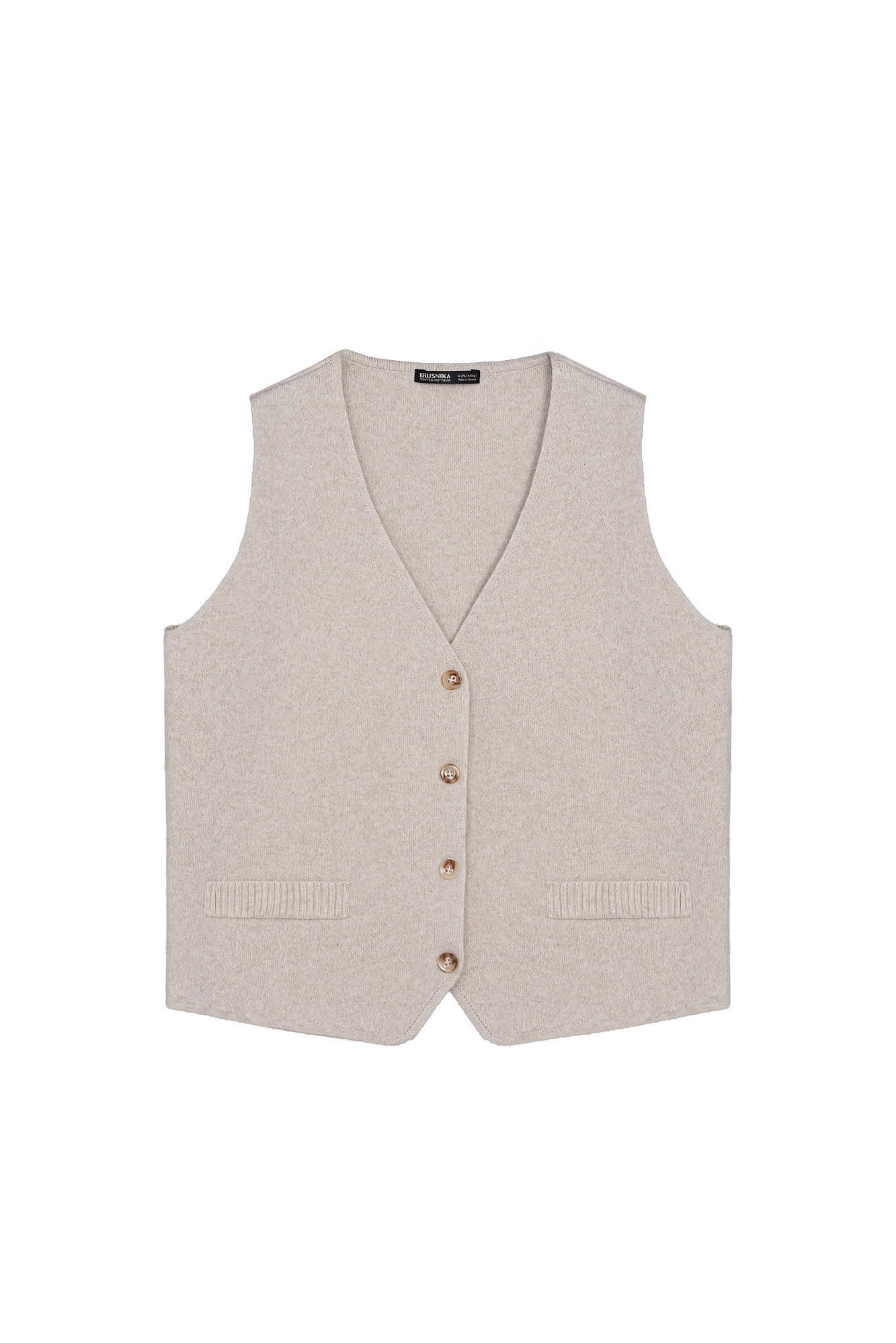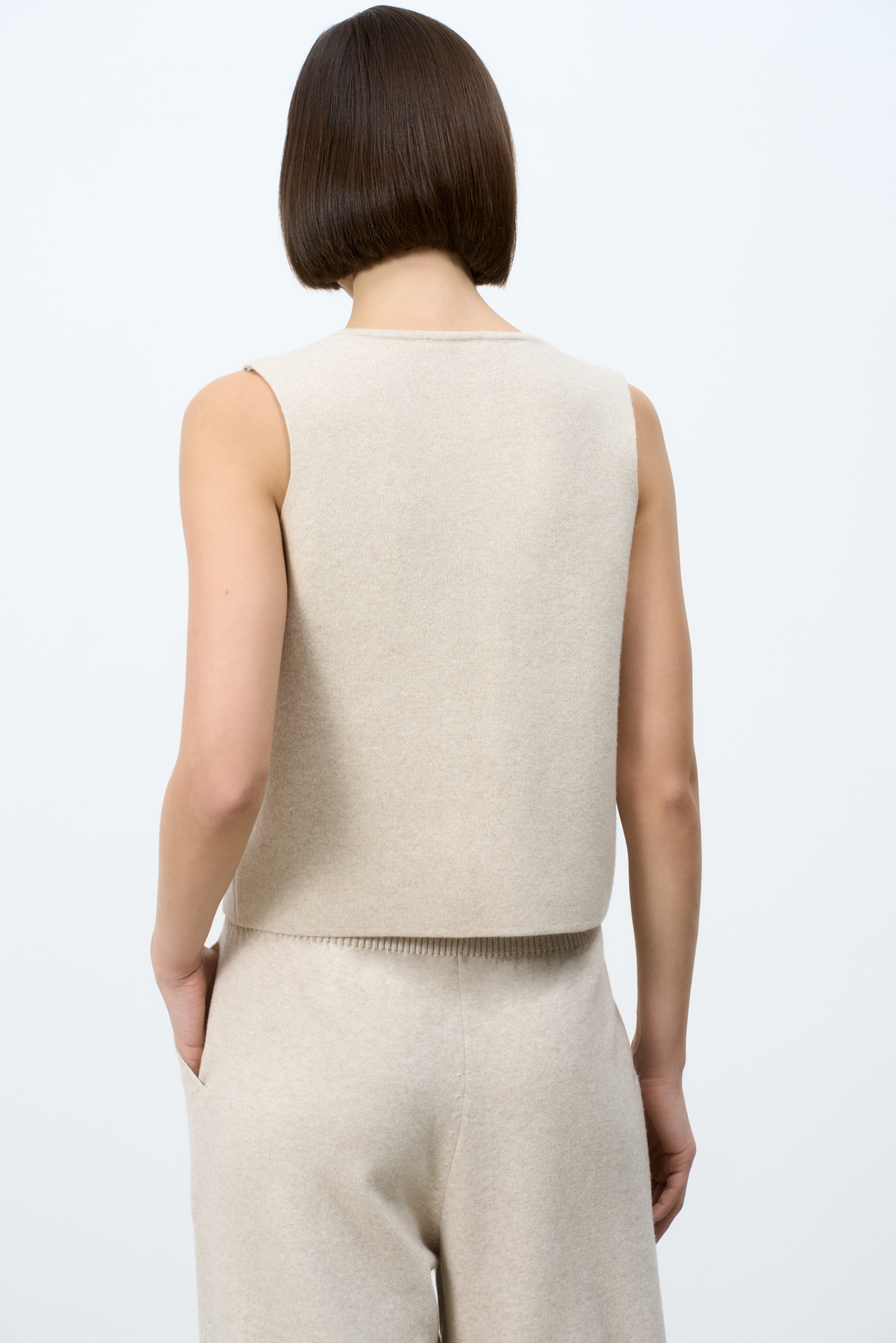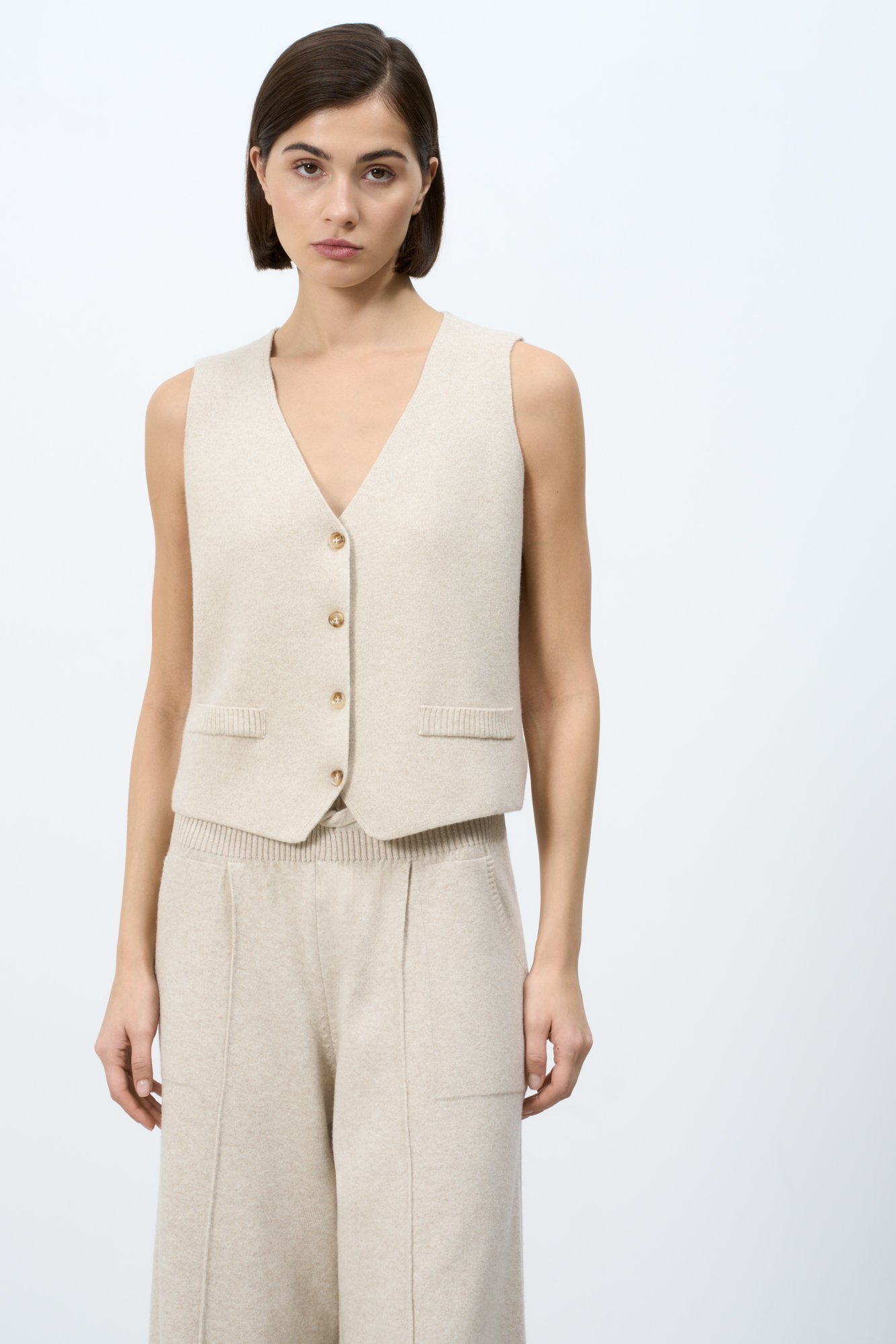 Трикотажный жилет из смесовой шерсти с кашемиром. Модель прямого кроя с V-образным вырезом и застежкой на пуговицы. Имитация карманов. Без подкладки.