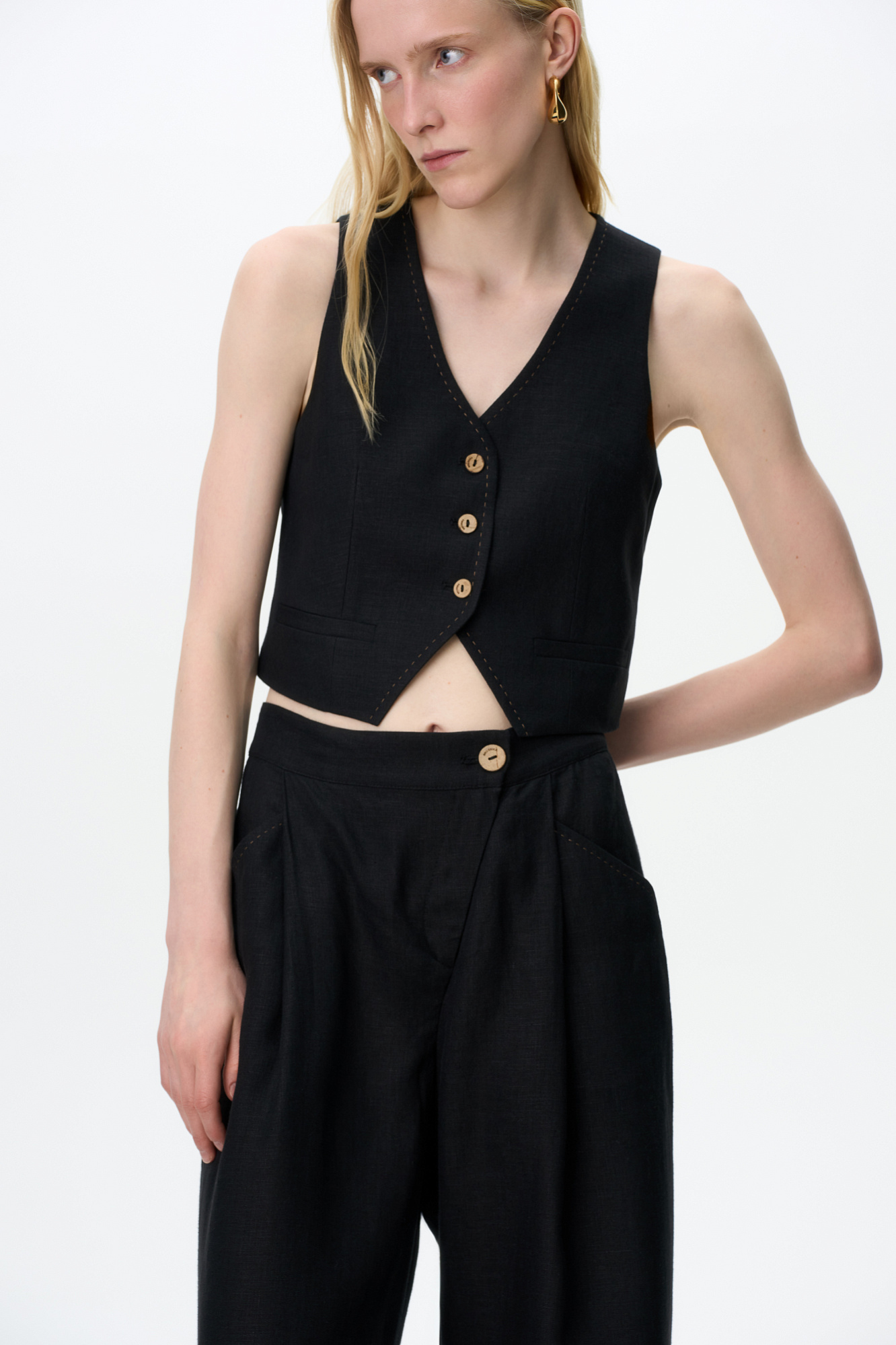 Жилет из 100% льна с карманами. Застежка на пуговицах.