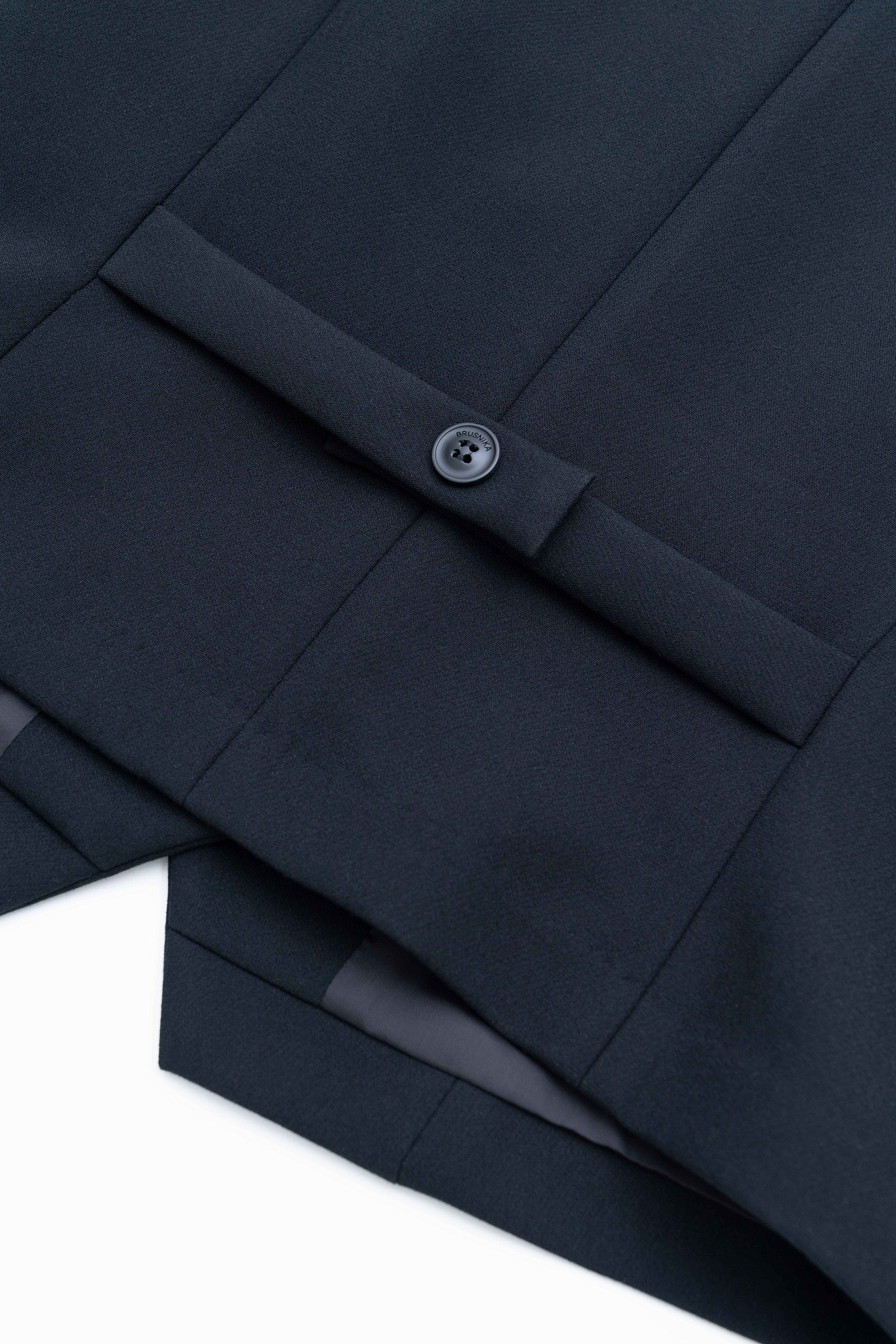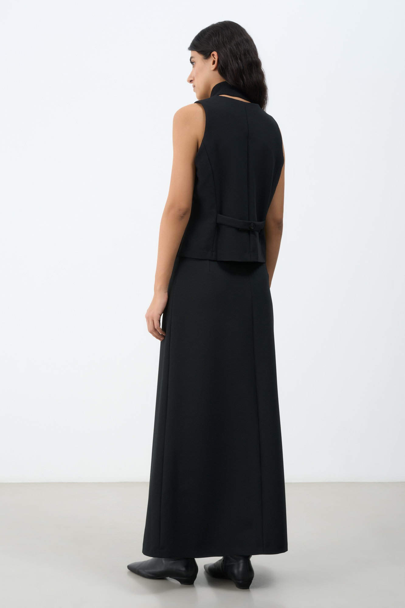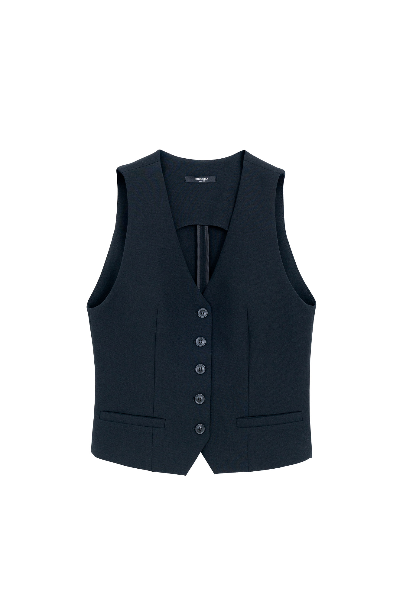 Классический жилет из поливискозы с имитацией карманов и v-образным вырезом. Застежка на пуговицы.