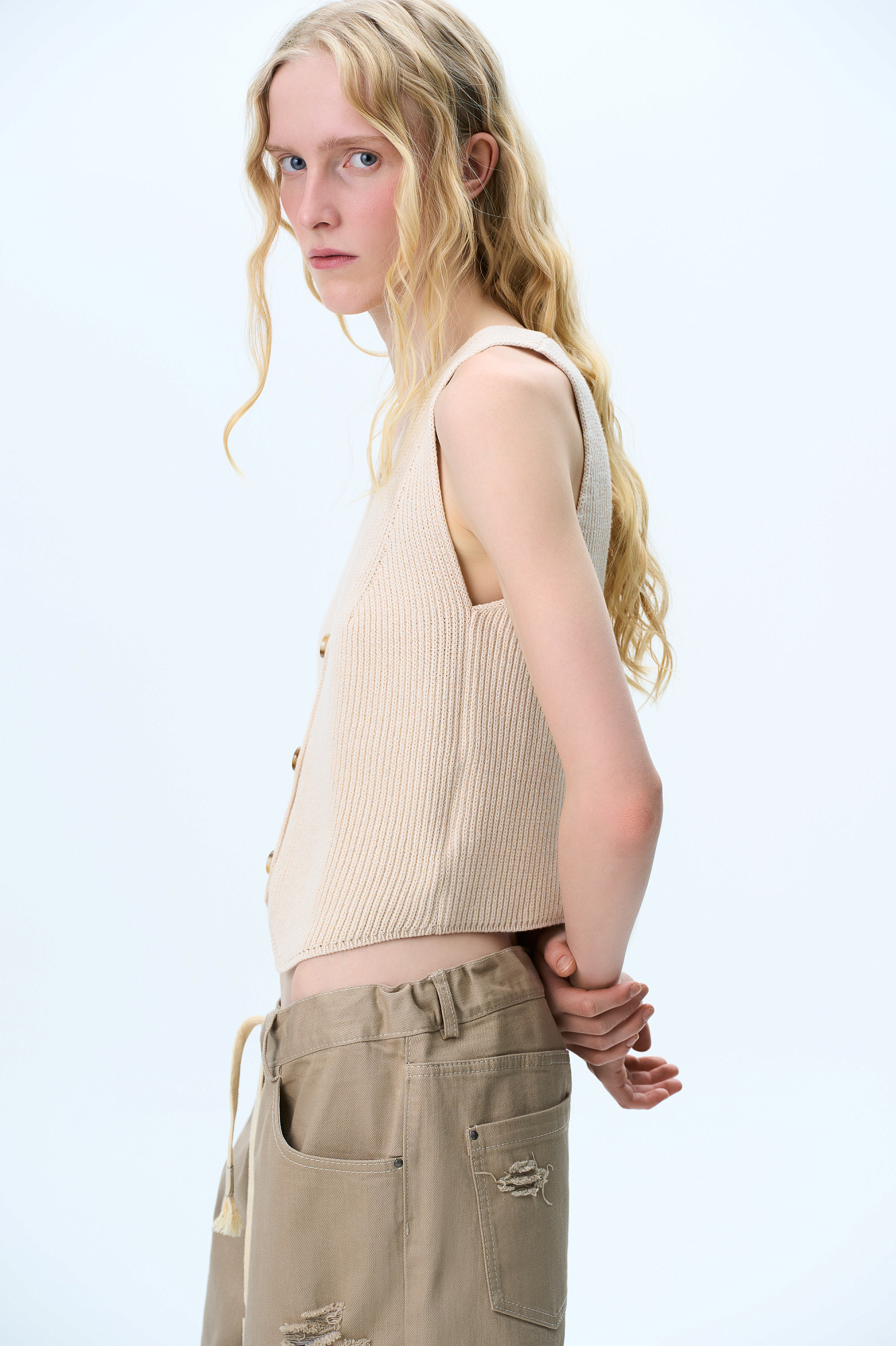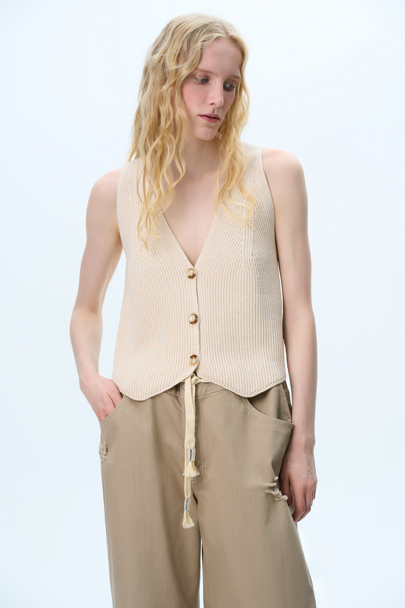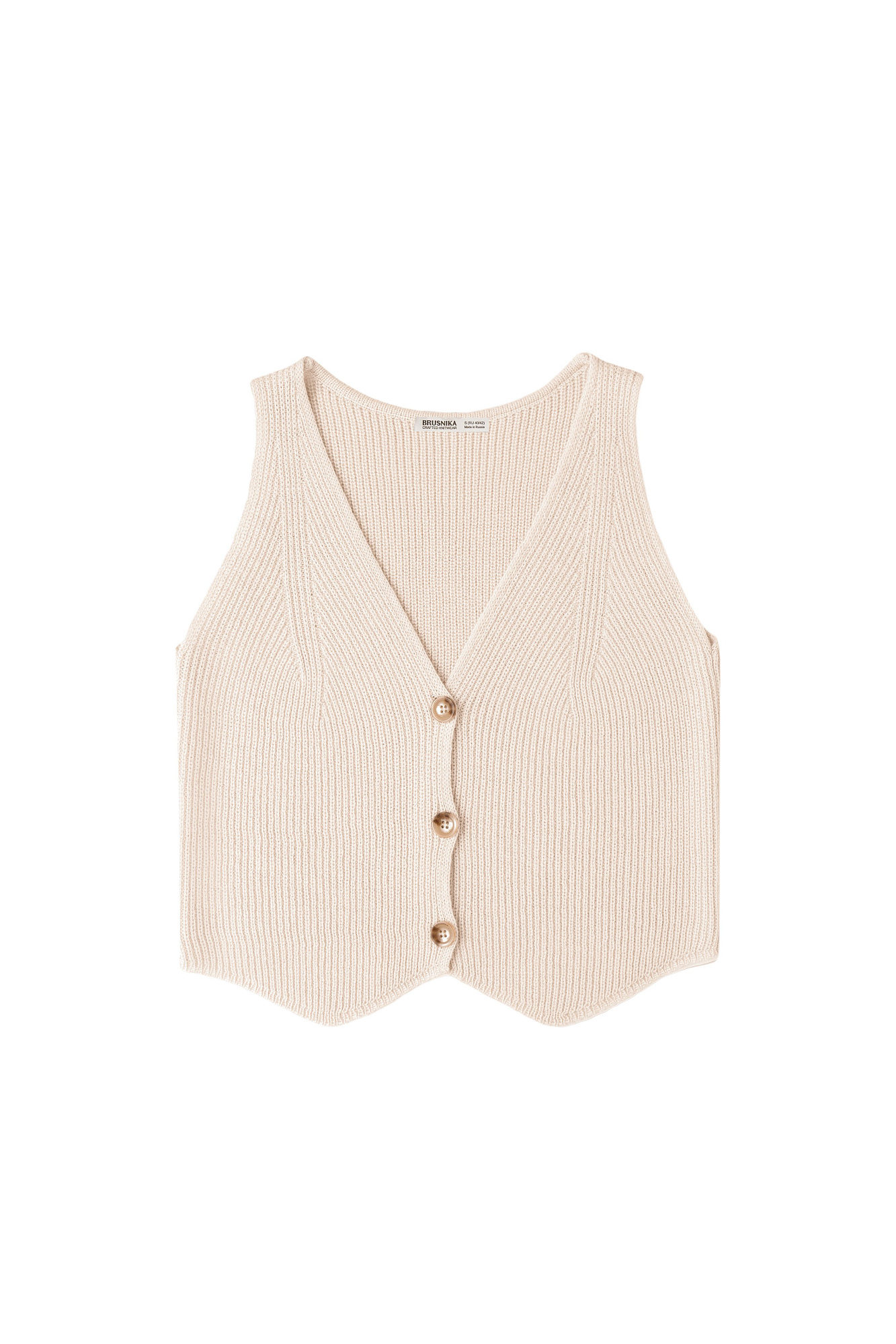 Трикотажный жилет из хлопка. Модель прямого кроя с V-образным вырезом и застежкой на пуговицы. Дополнить образ можно юбкой в таком же стиле.