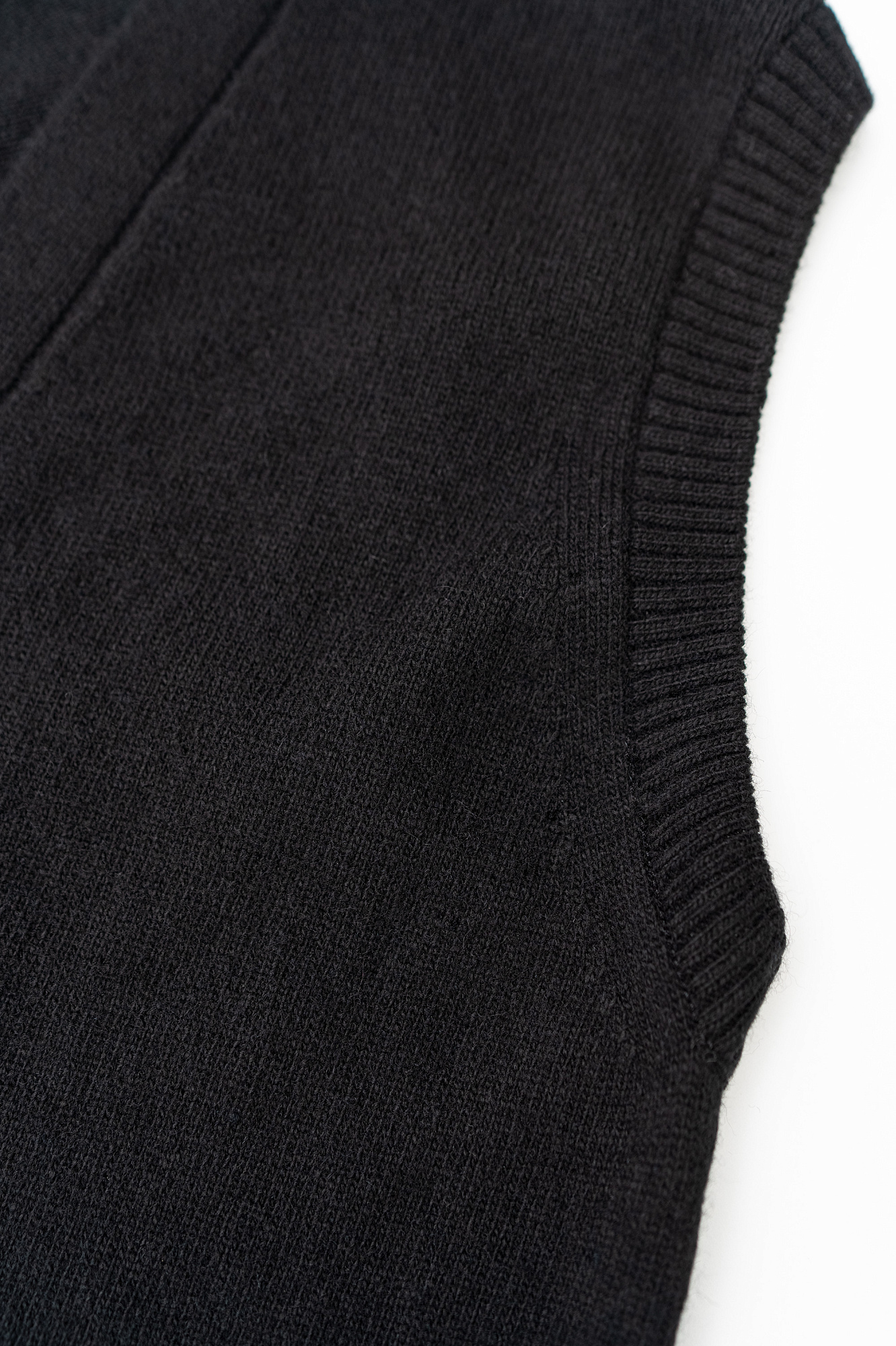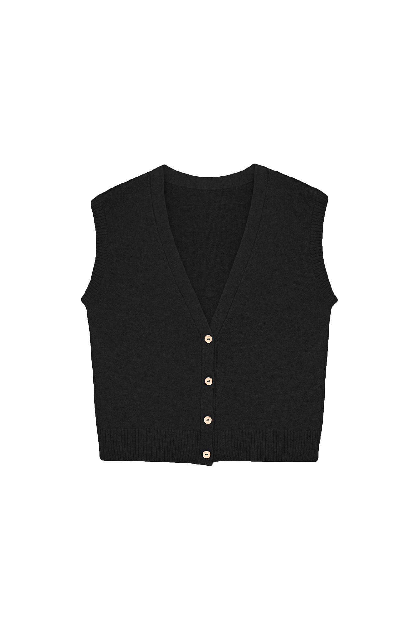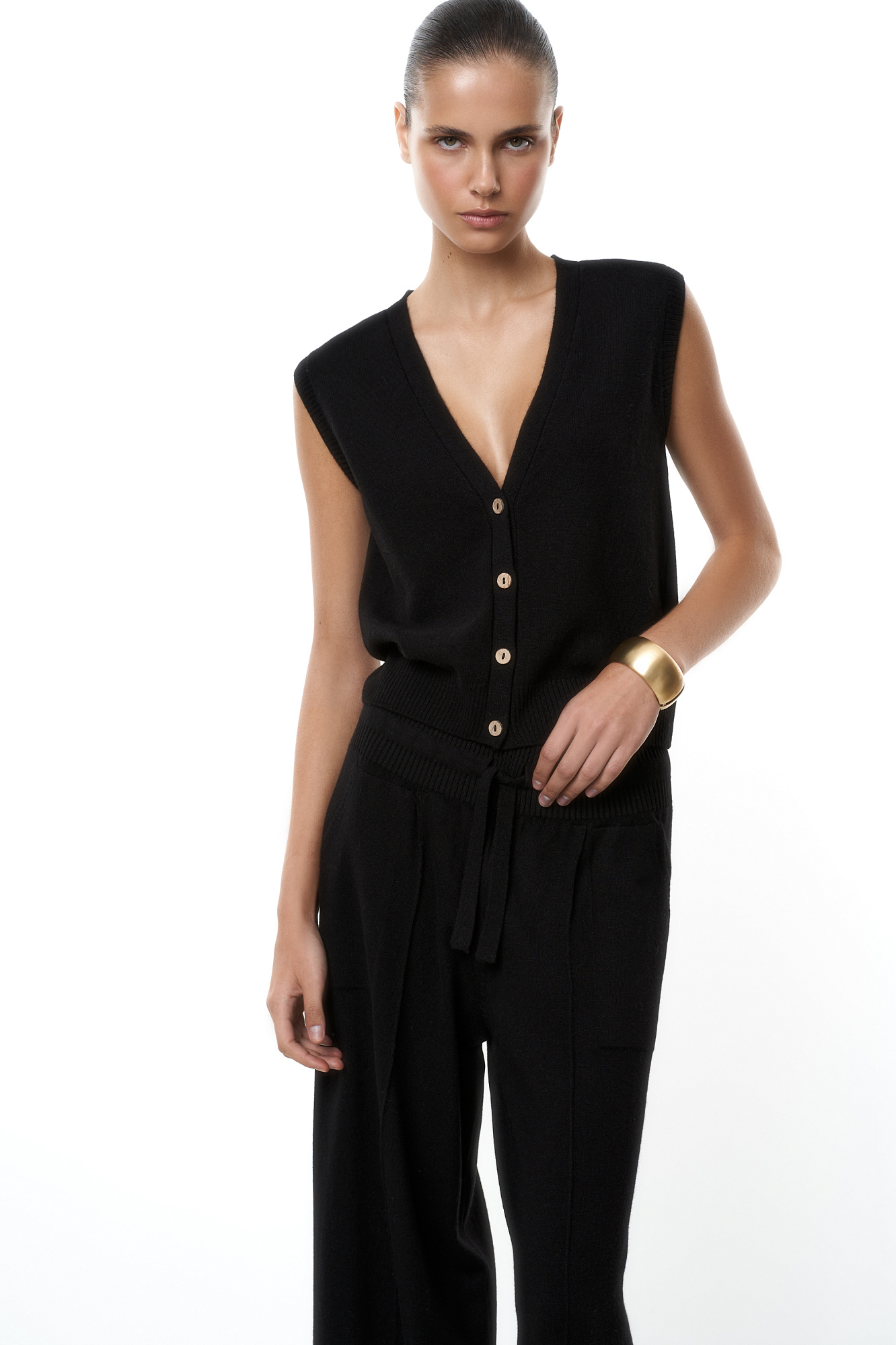 Трикотажный жилет из смесовой шерсти с кашемиром. Модель прямого кроя с V-образным вырезом и застежкой на пуговицы.