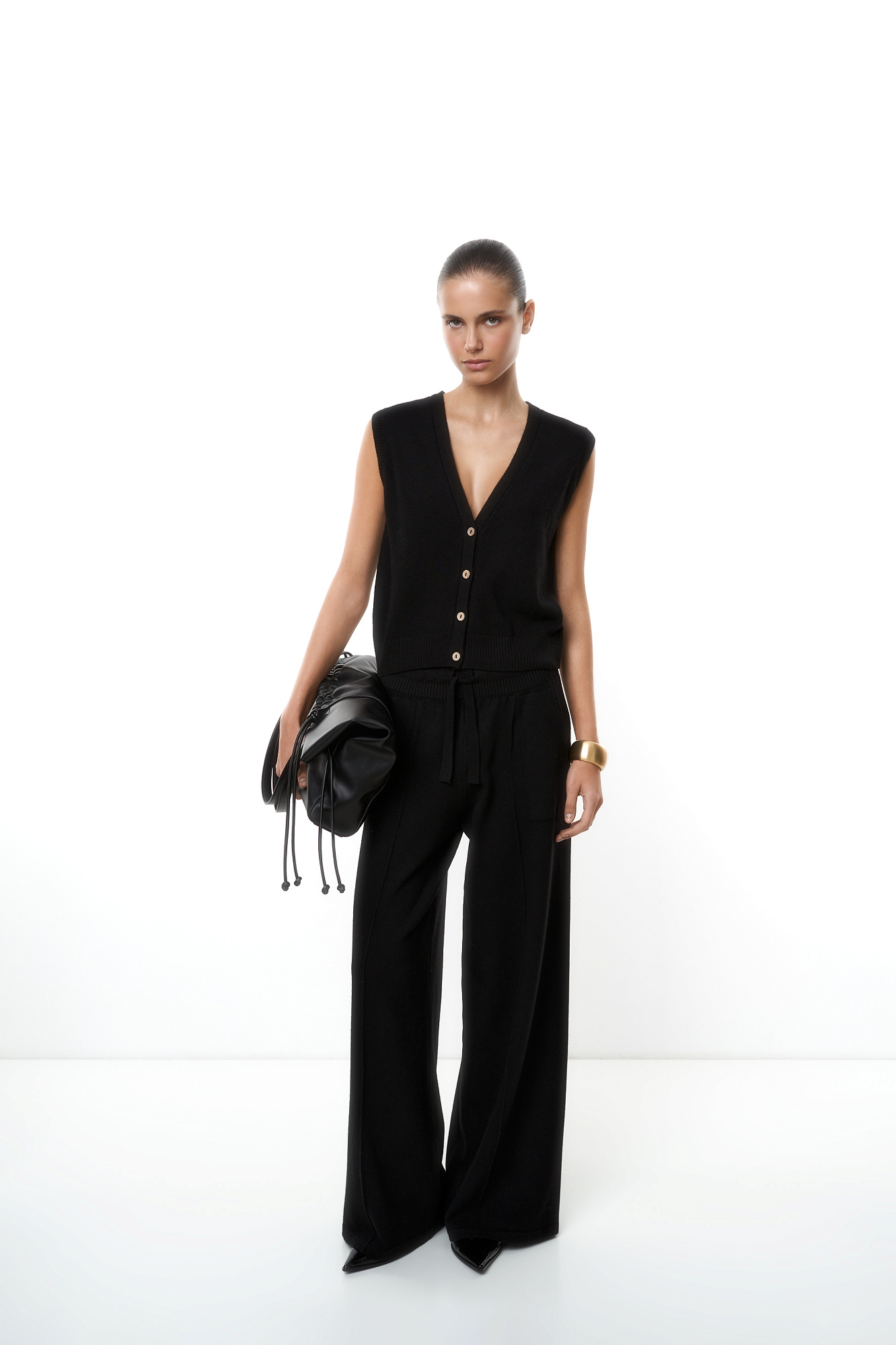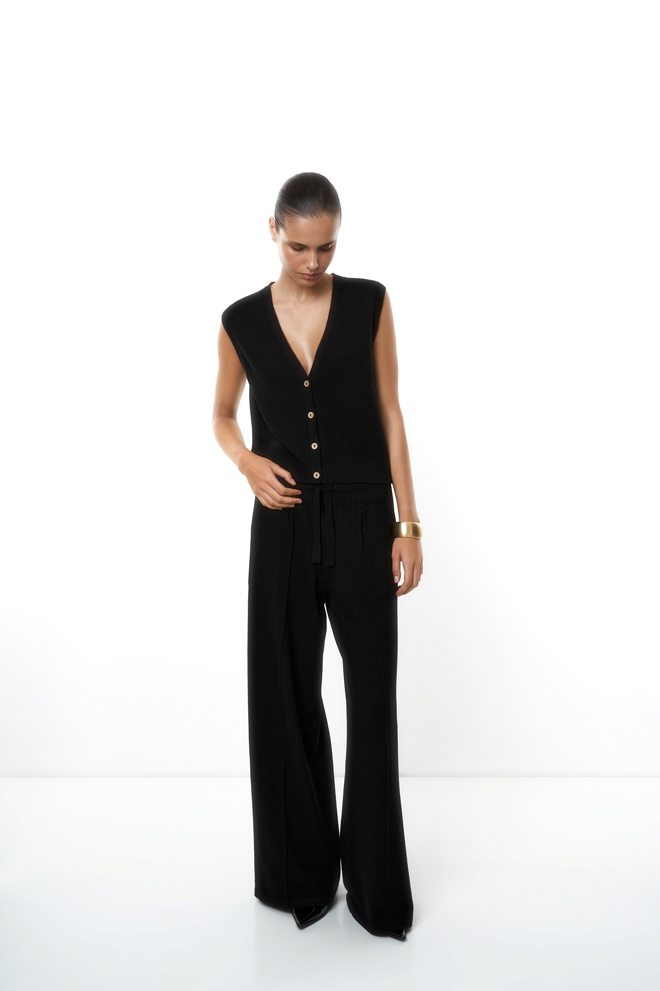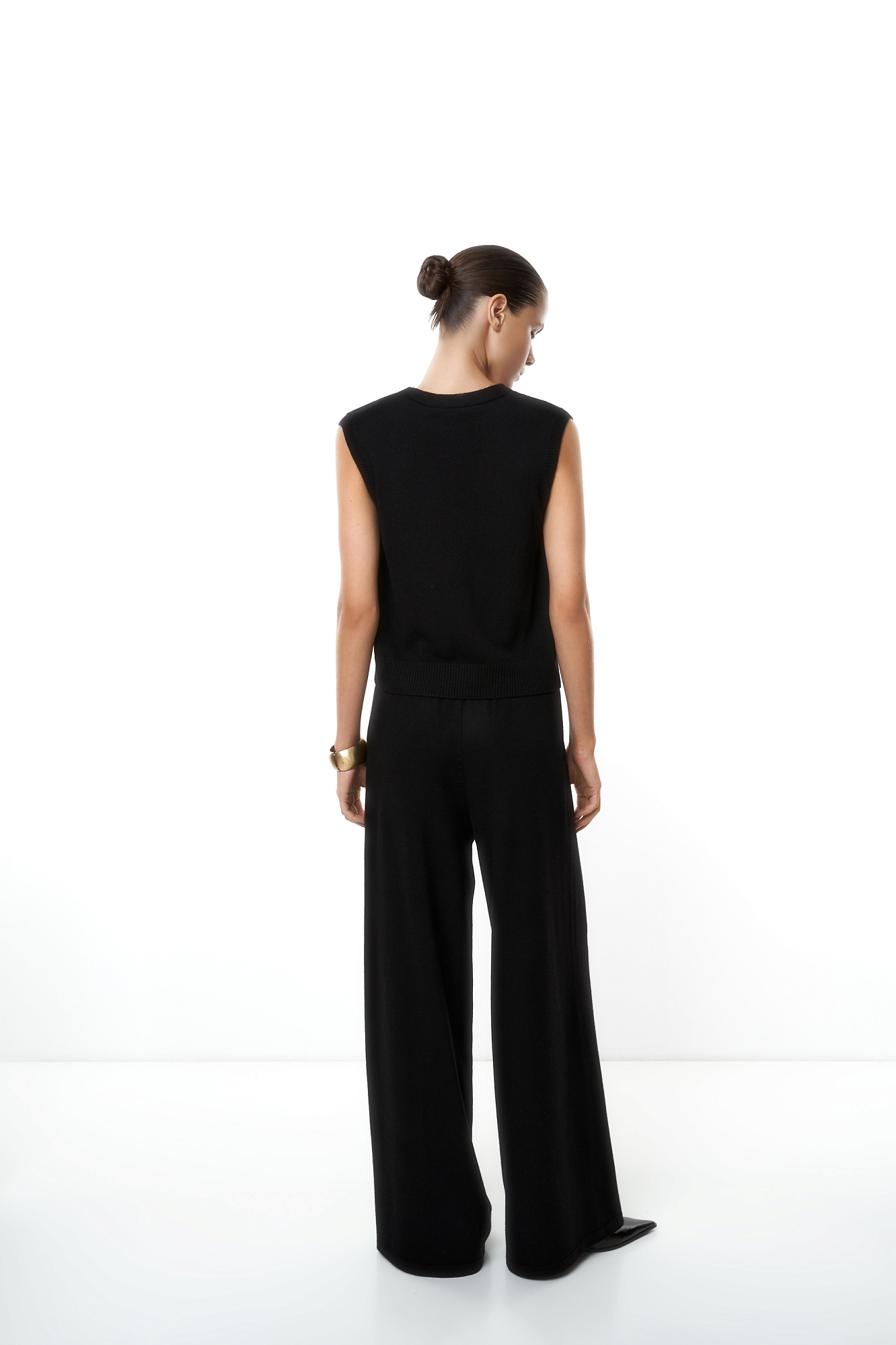 Трикотажный жилет из смесовой шерсти с кашемиром. Модель прямого кроя с V-образным вырезом и застежкой на пуговицы.