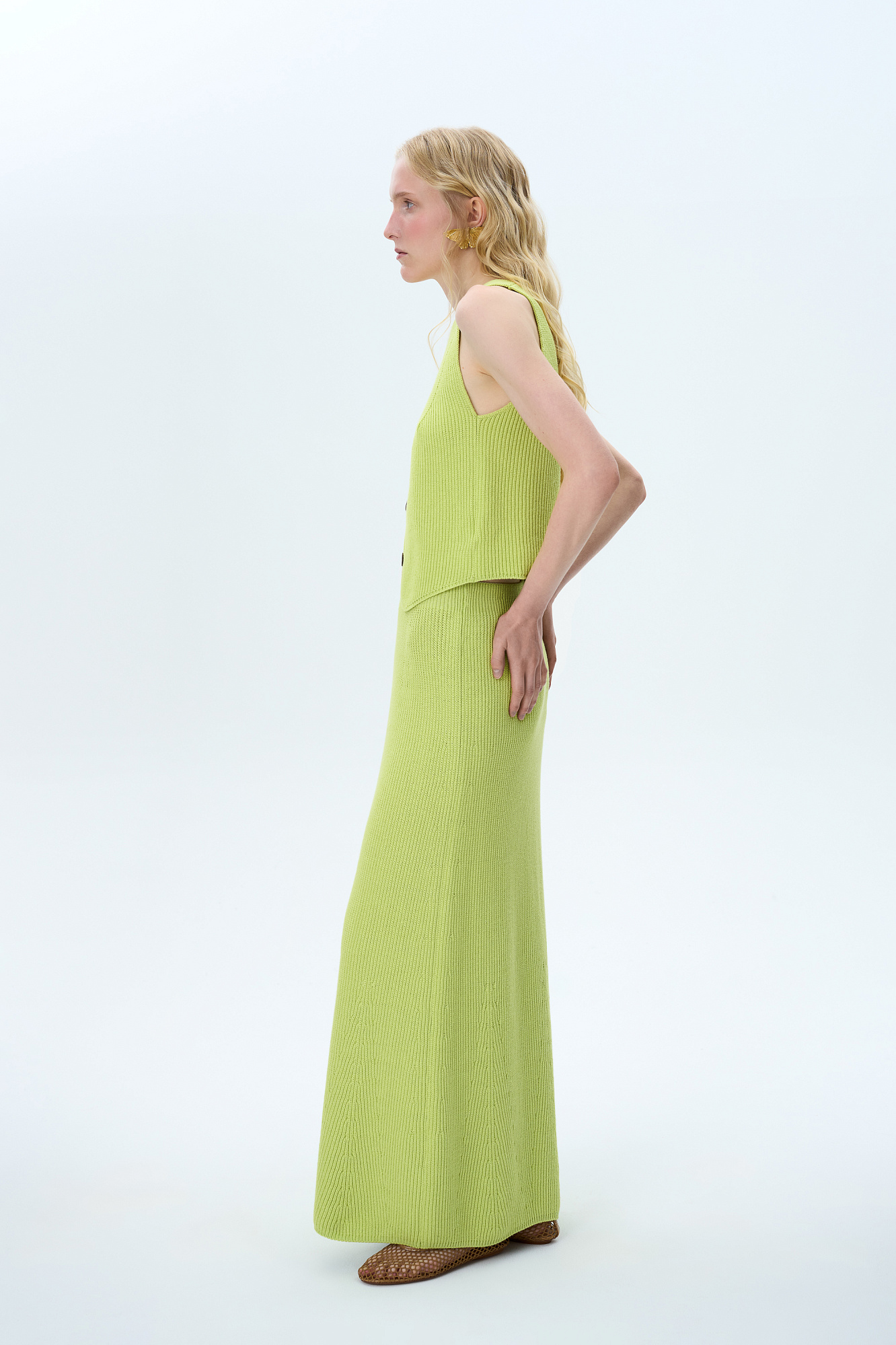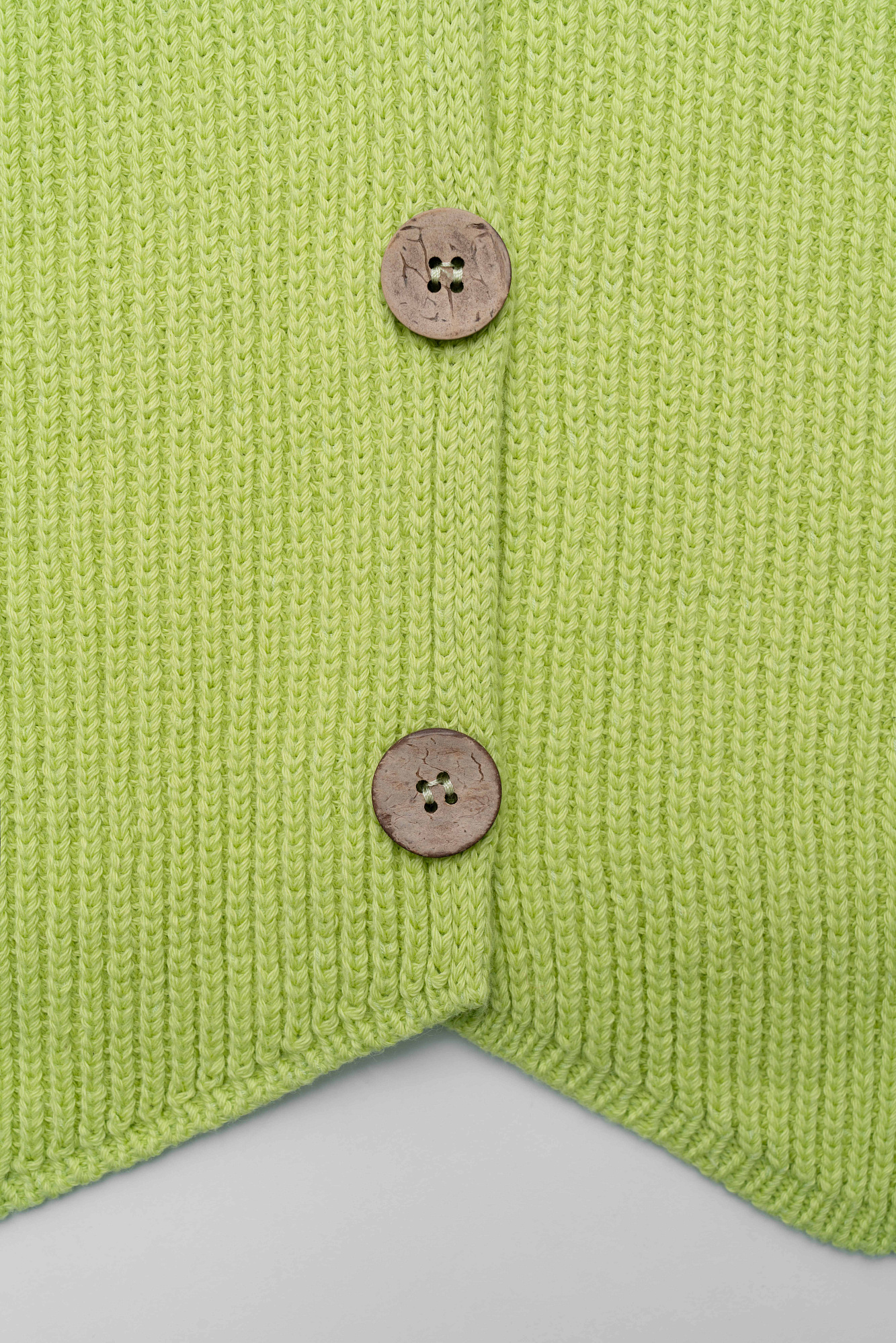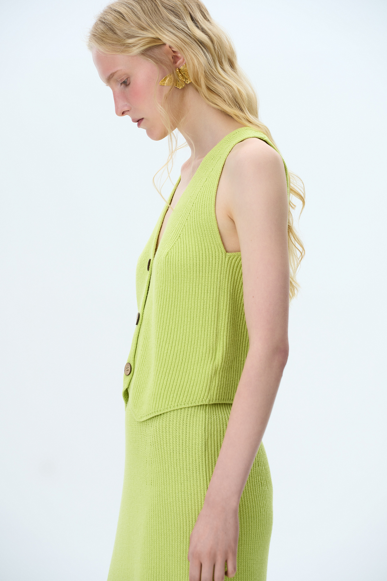 Трикотажный жилет из хлопка. Модель прямого кроя с V-образным вырезом и застежкой на пуговицы. Дополнить образ можно юбкой в таком же стиле.