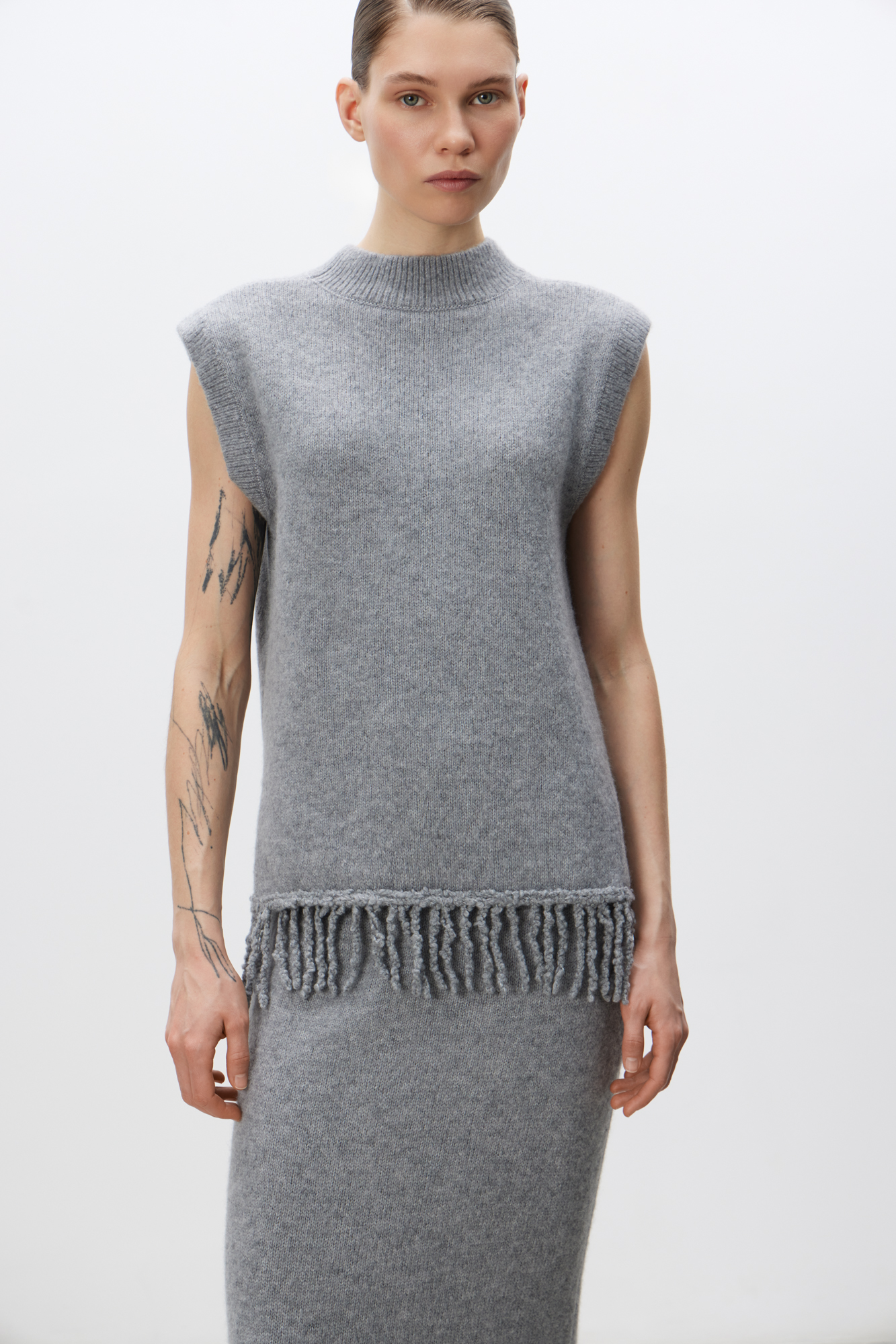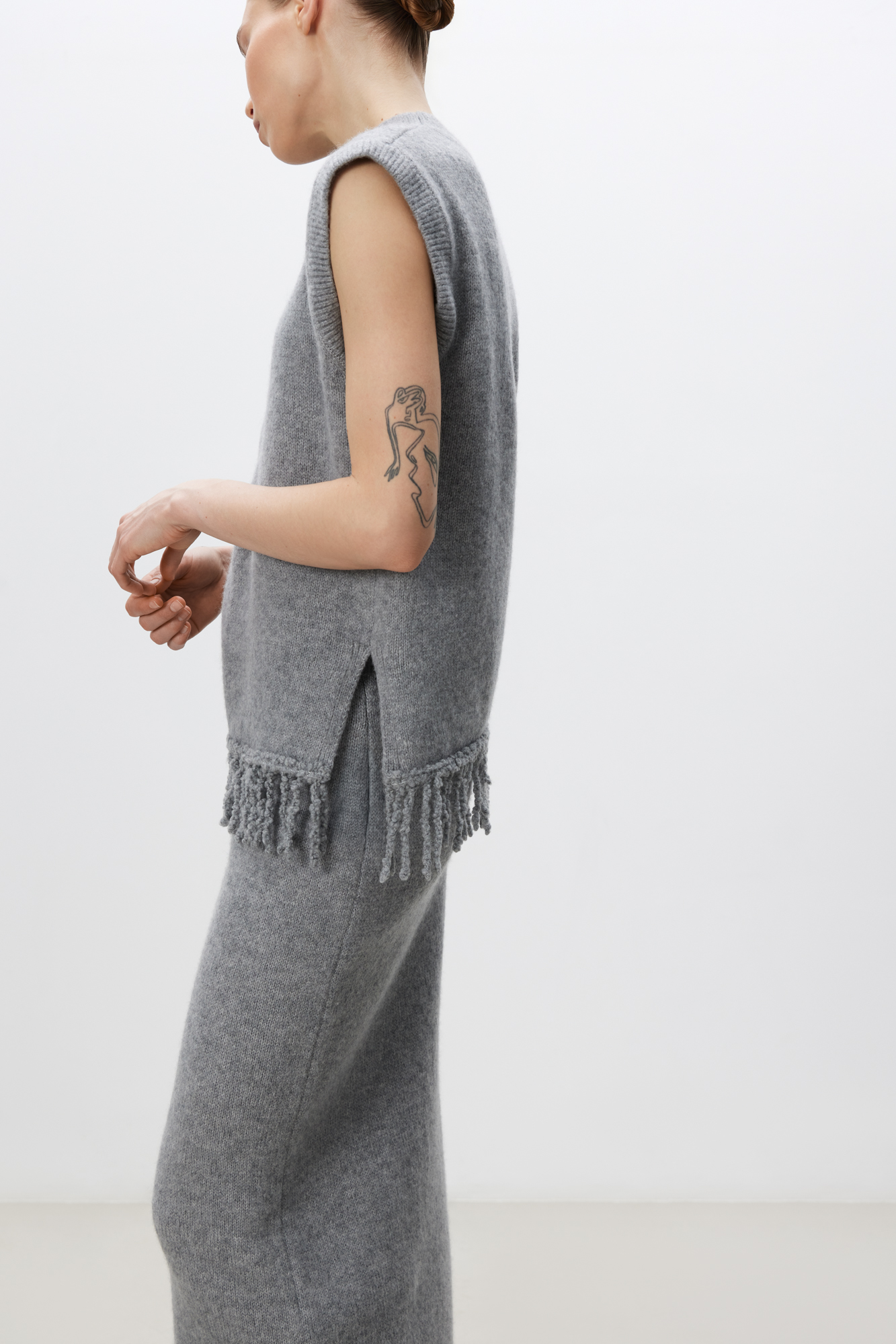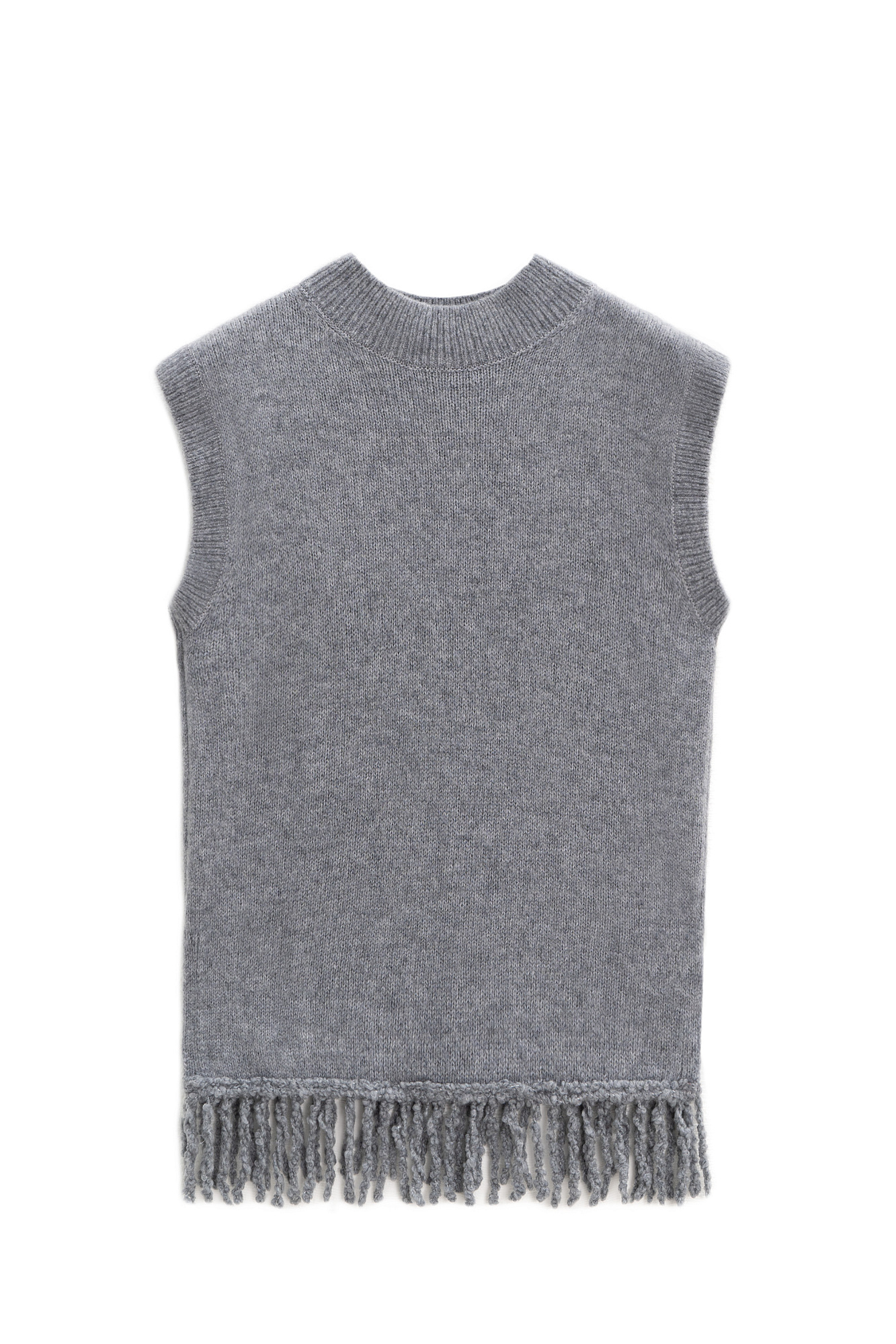 Трикотажный жилет из ультратонкой шерсти мериноса с добавлением хлопка. Модель прямого кроя без рукавов с круглым невысоким вырезом горловины и боковыми разрезами. Изделие декорировано буклированной бахромой по низу.