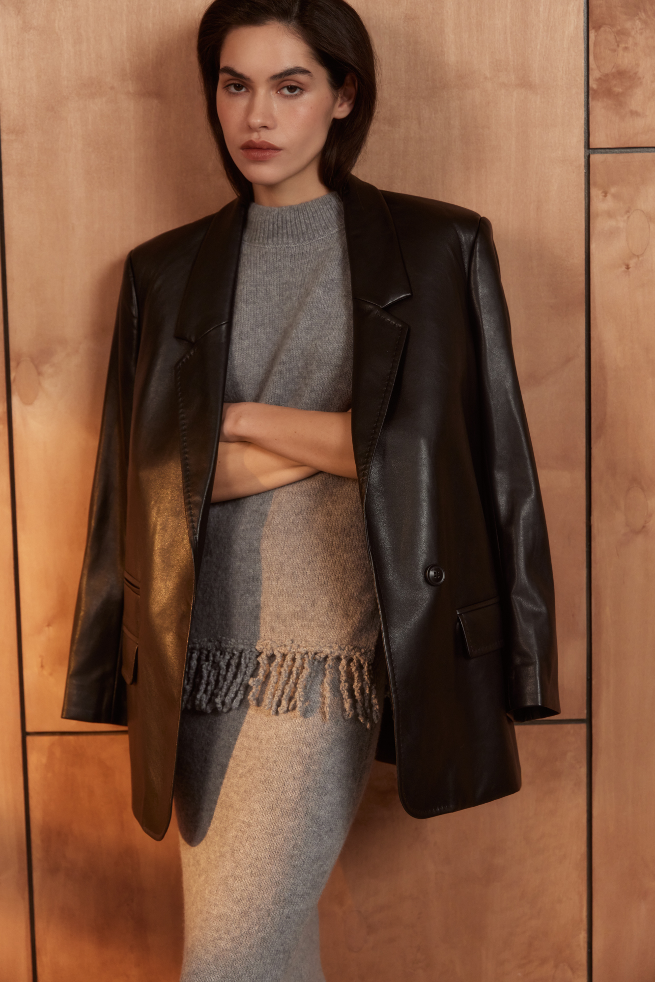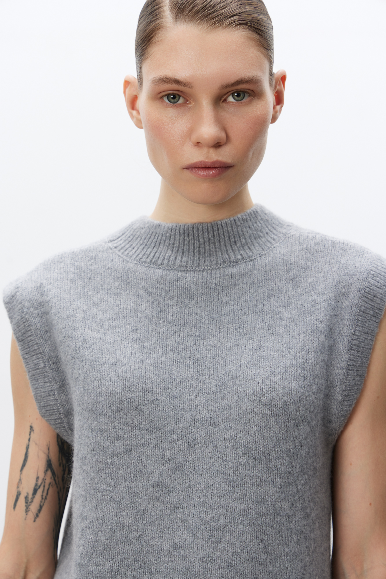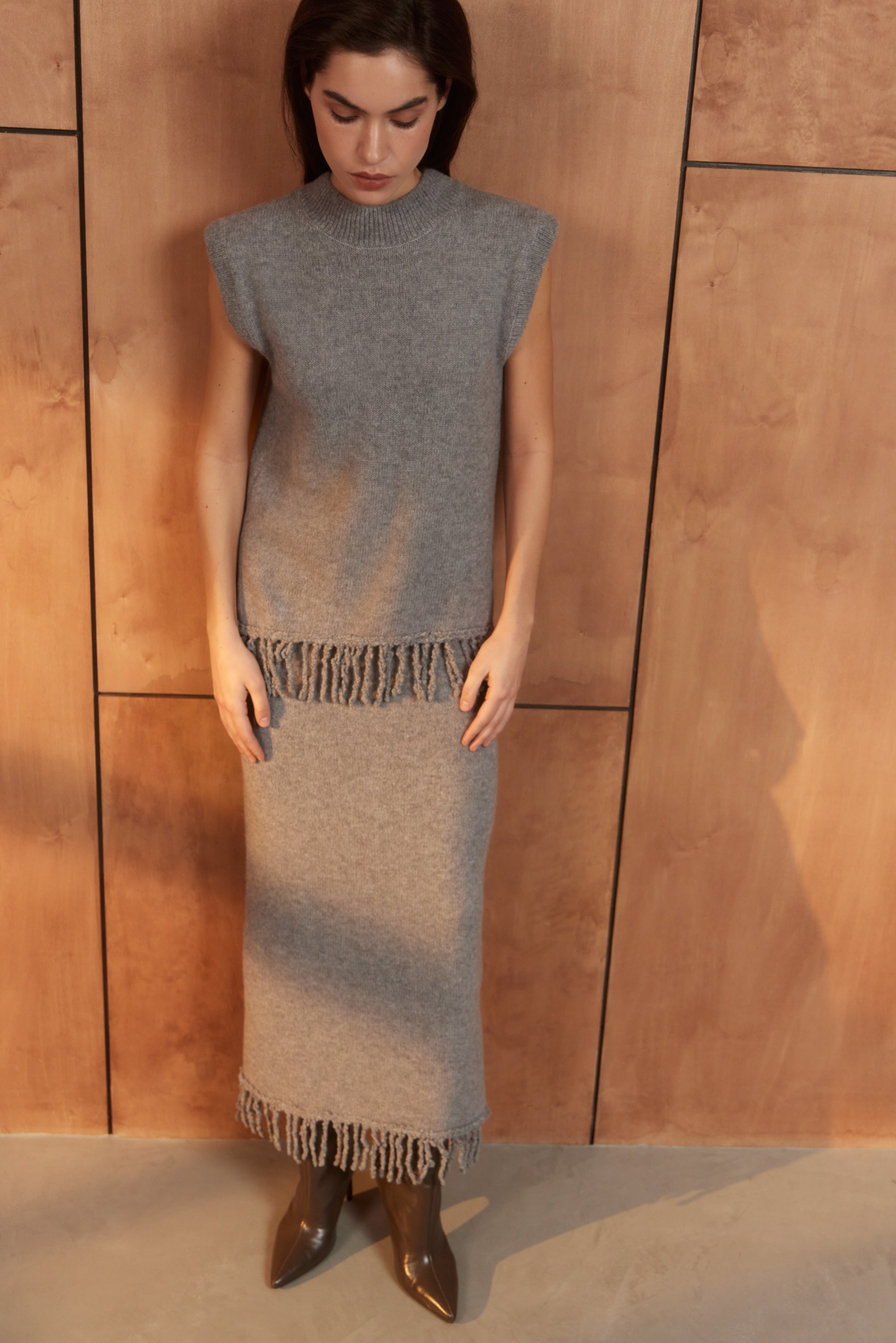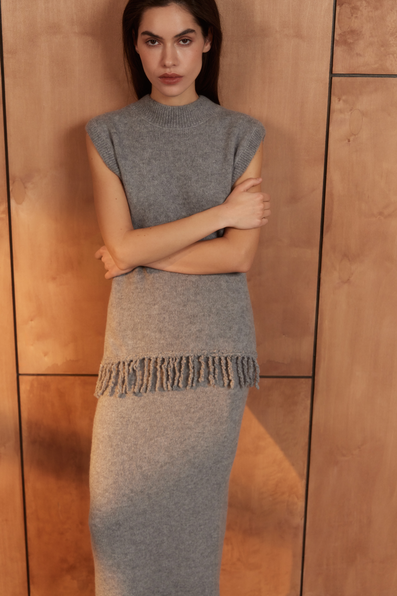 Трикотажный жилет из ультратонкой шерсти мериноса с добавлением хлопка. Модель прямого кроя без рукавов с круглым невысоким вырезом горловины и боковыми разрезами. Изделие декорировано буклированной бахромой по низу.