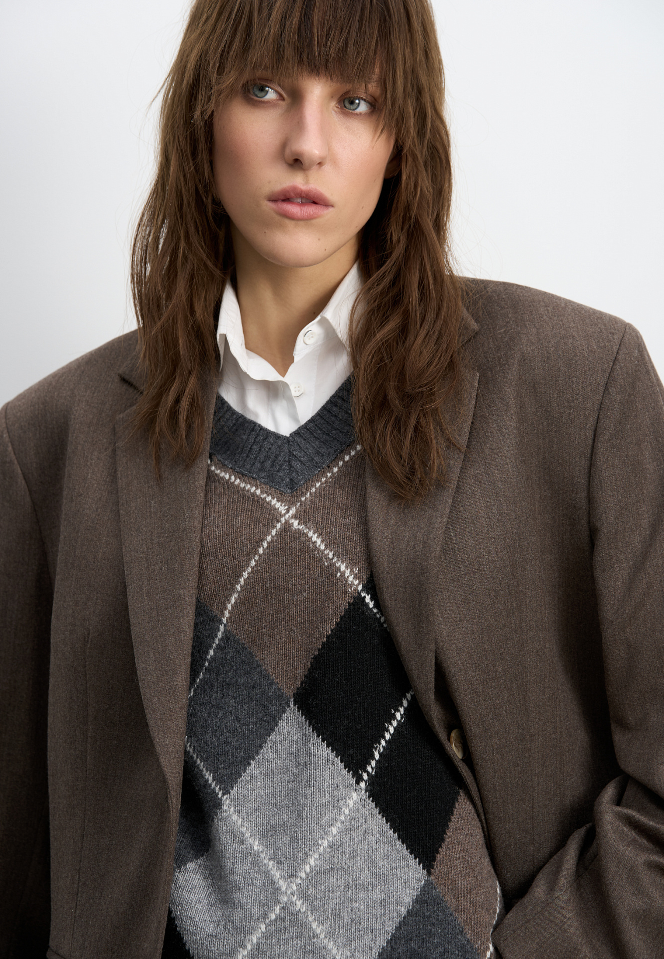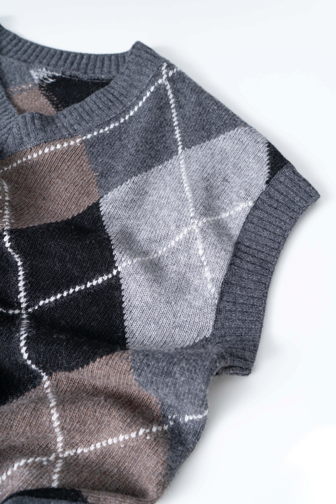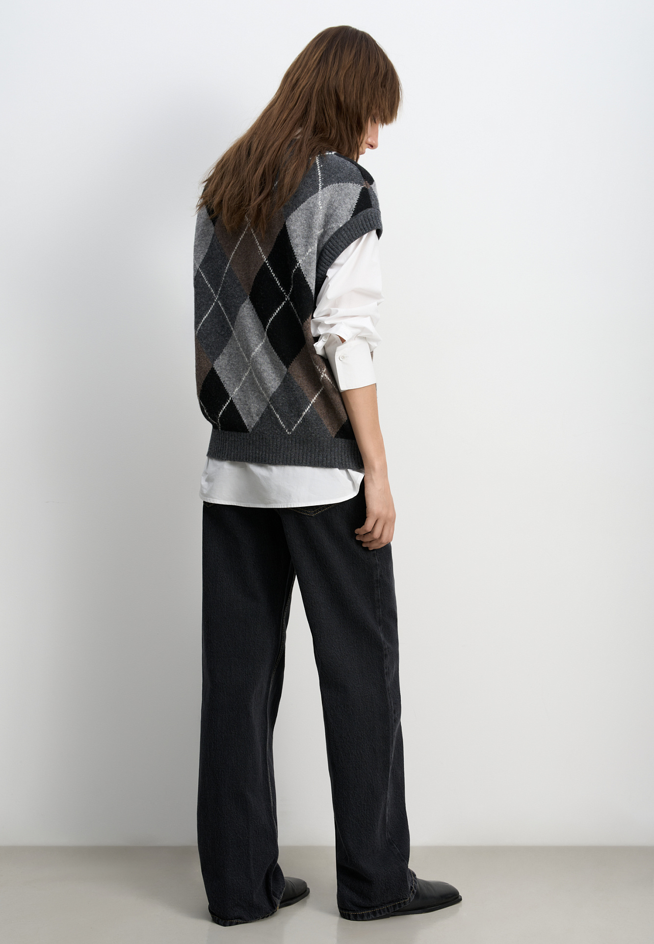 Трикотажный жилет из кашемира с узором аргайл. Модель свободного силуэта без рукавов с неглубоким V-образным вырезом горловины. Края изделия выполнены в рубчик.