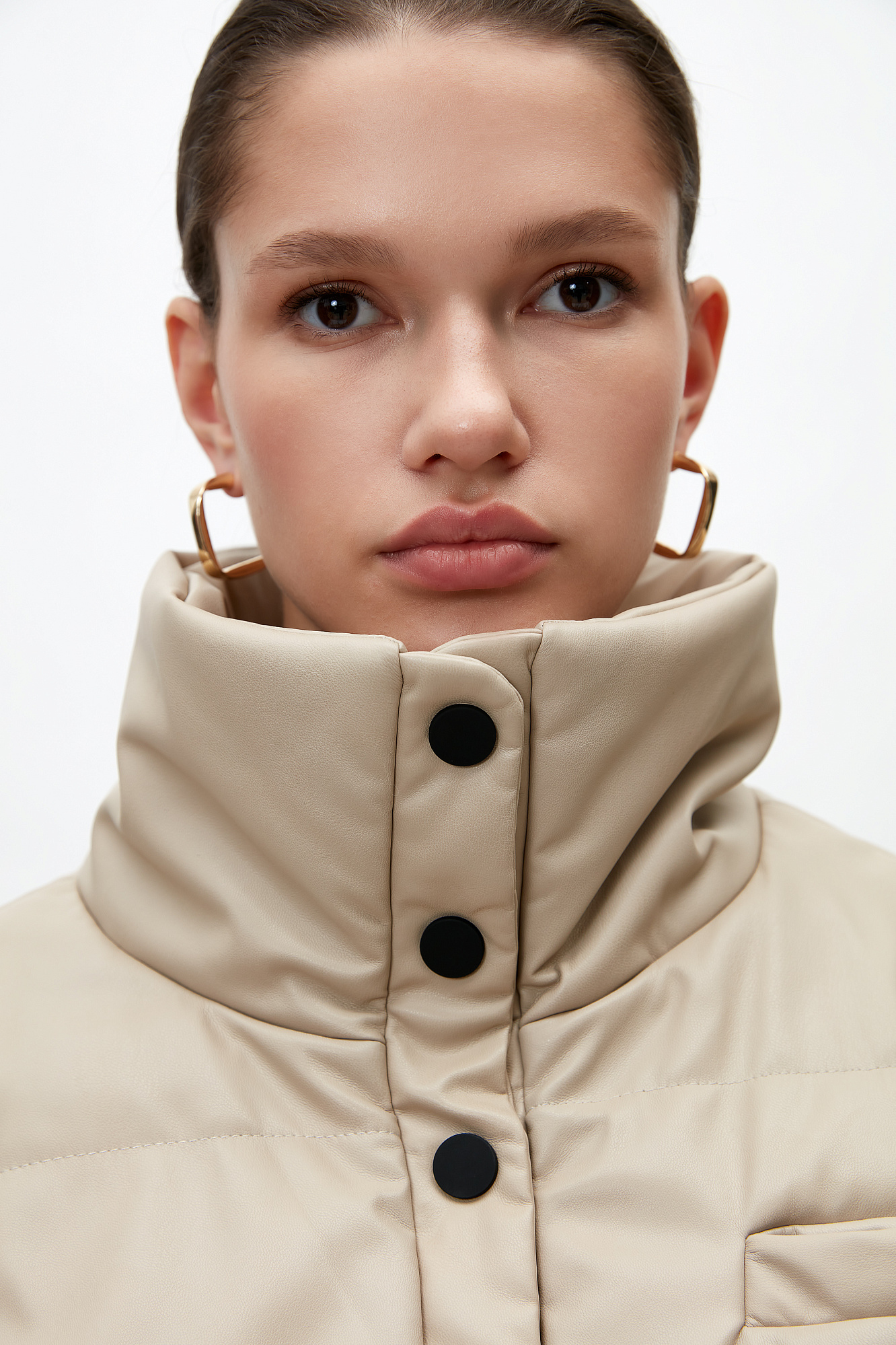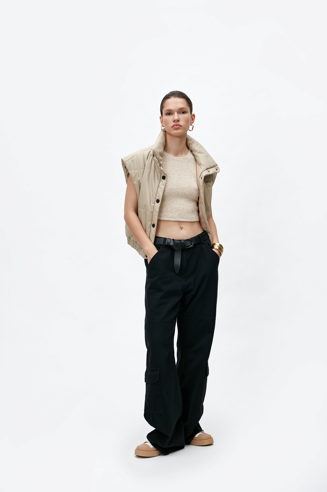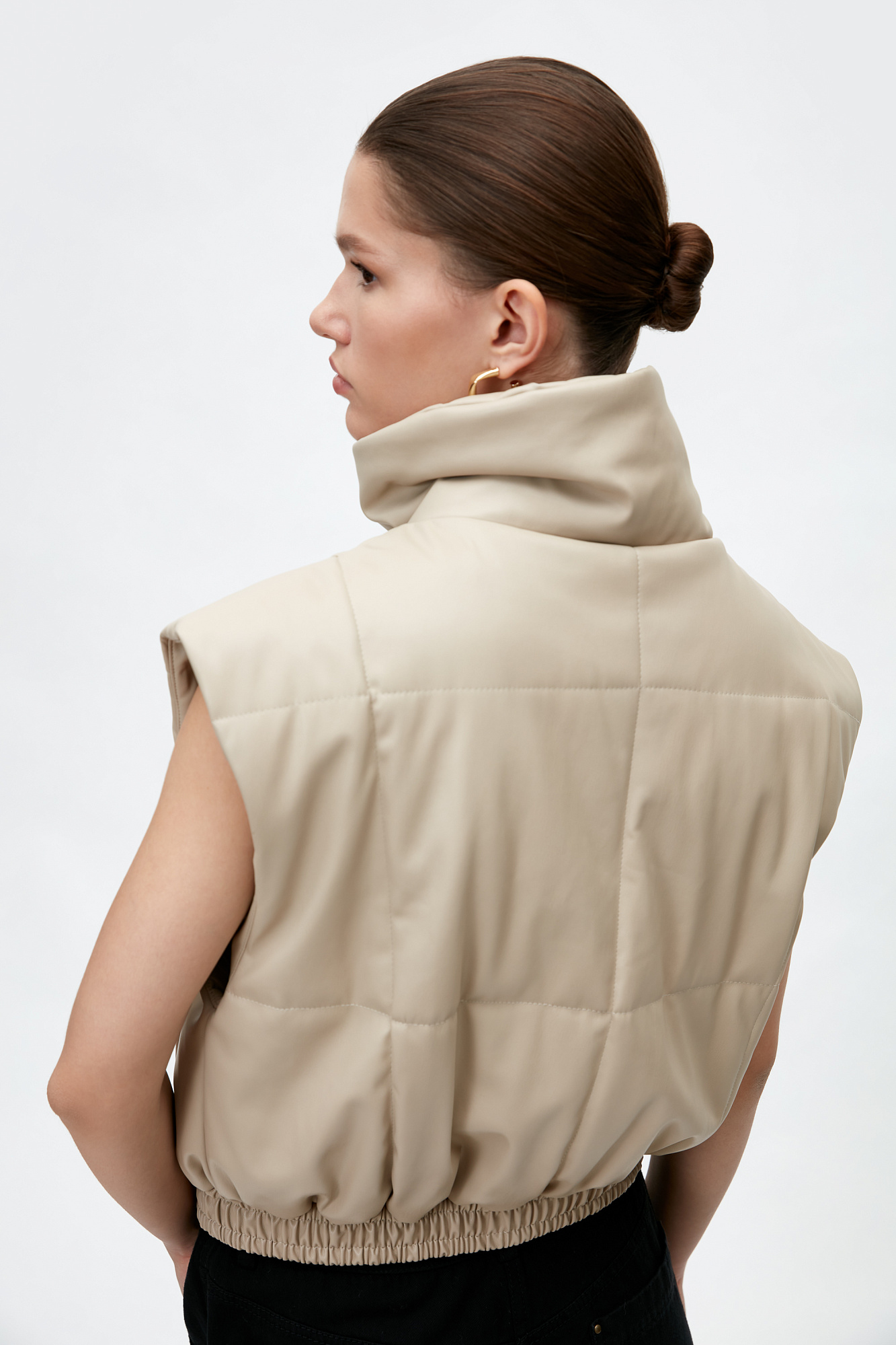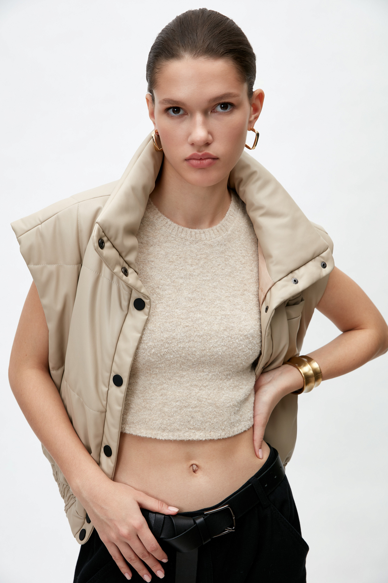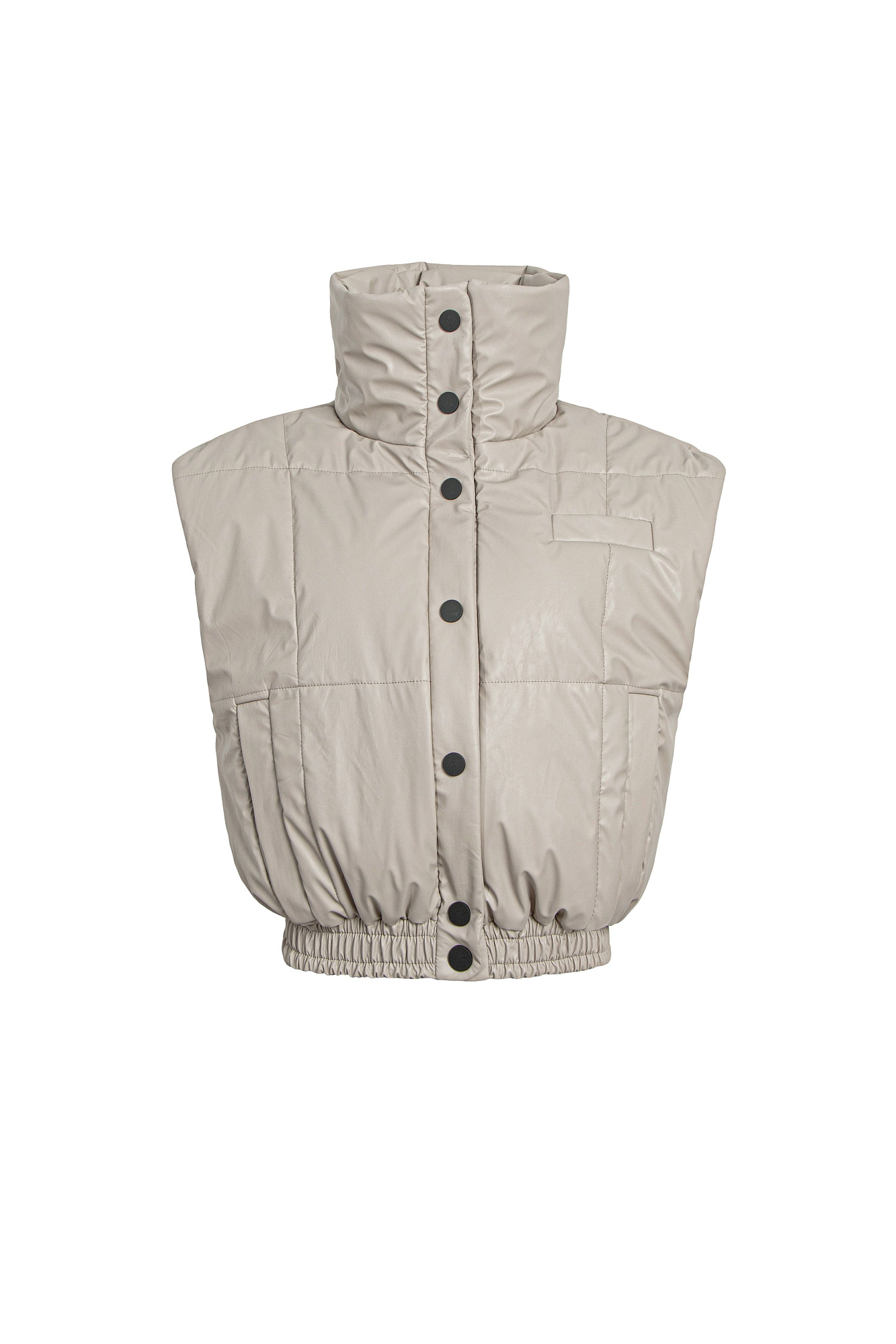 Жилет из экокожи. Модель приталенного силуэта с воротником-стойкой и боковыми карманами. Низ изделия на резинке, застежка на кнопки.