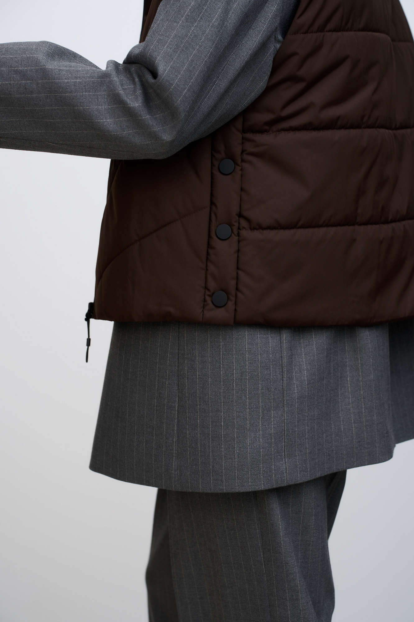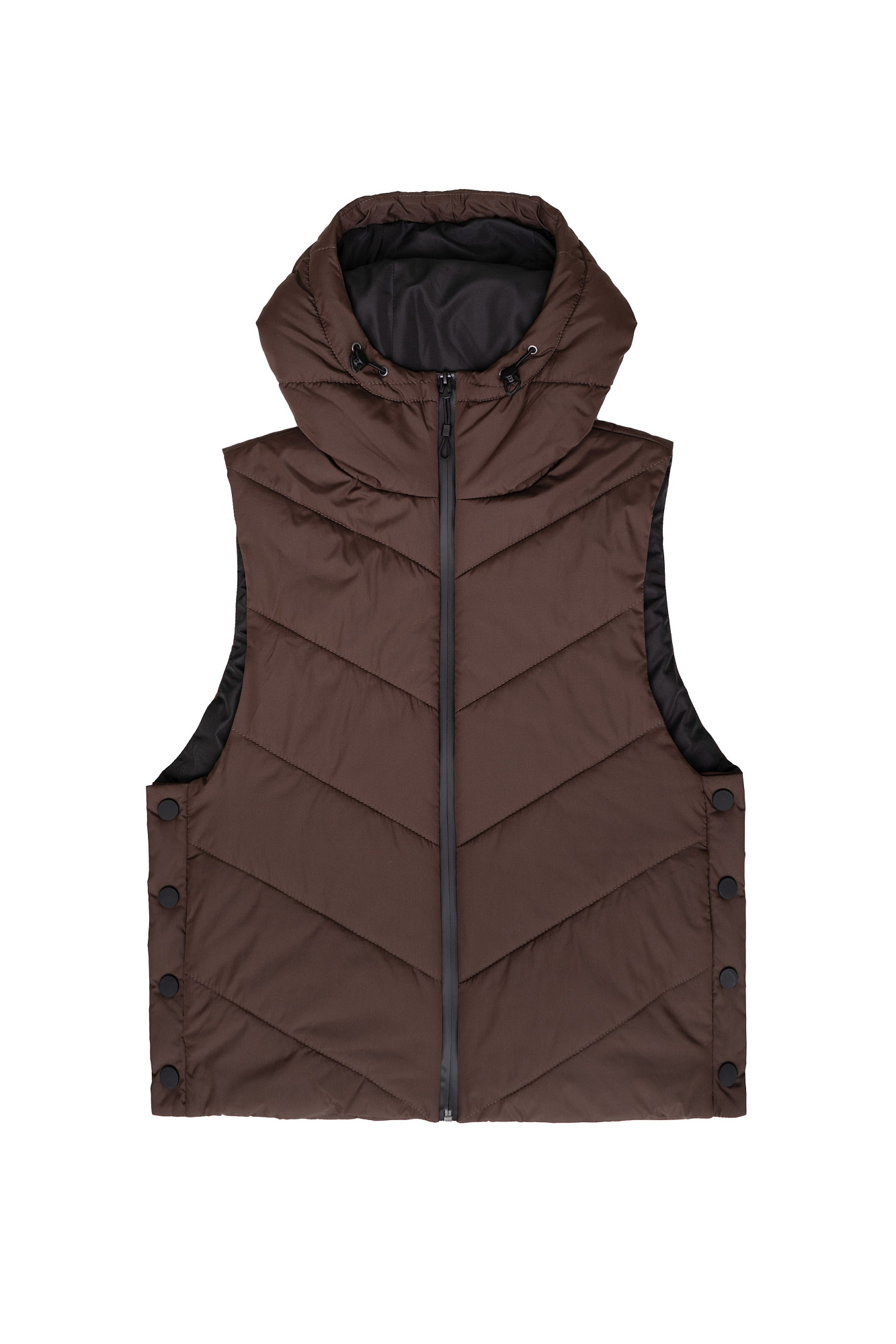 Oversize жилет на синтепоне с капюшоном. Модель свободного силуэта с застежками на кнопки по бокам и молнию.