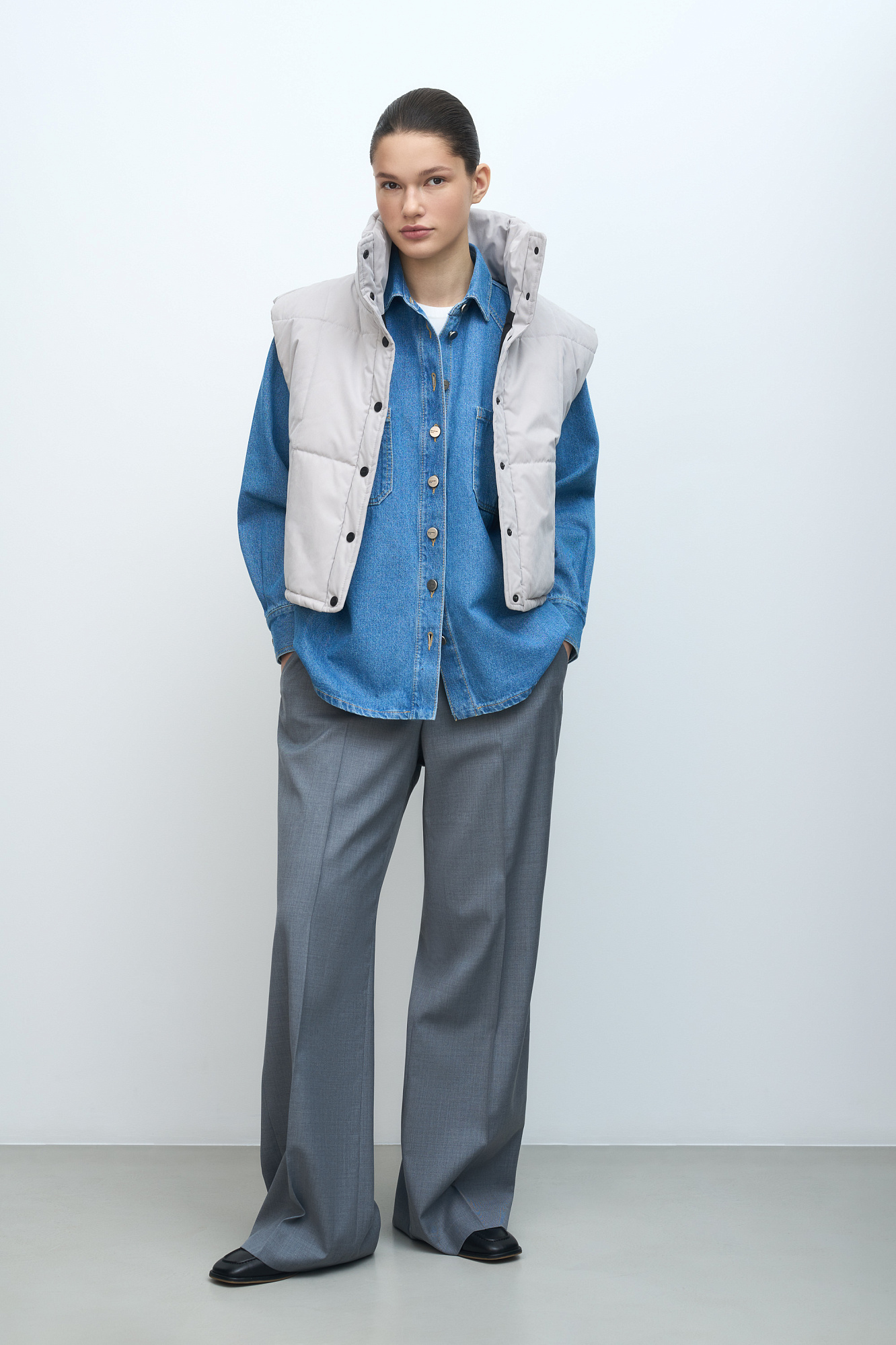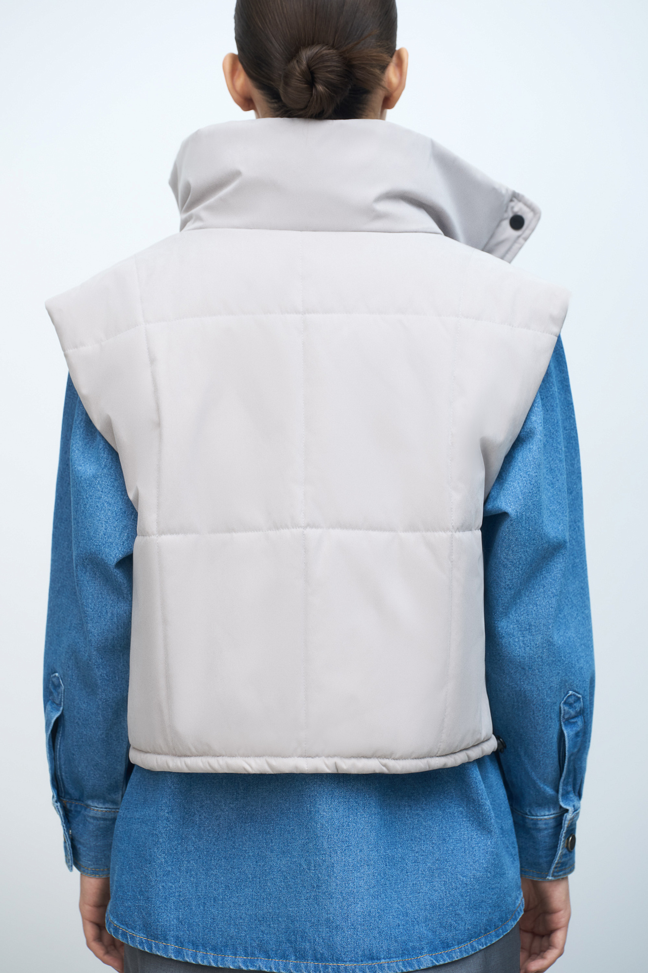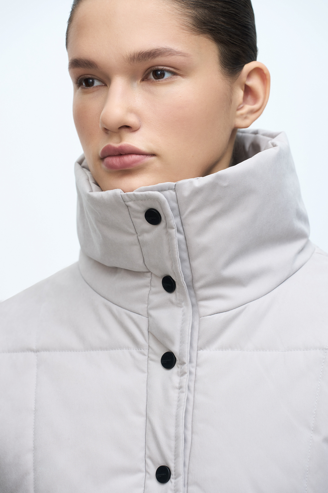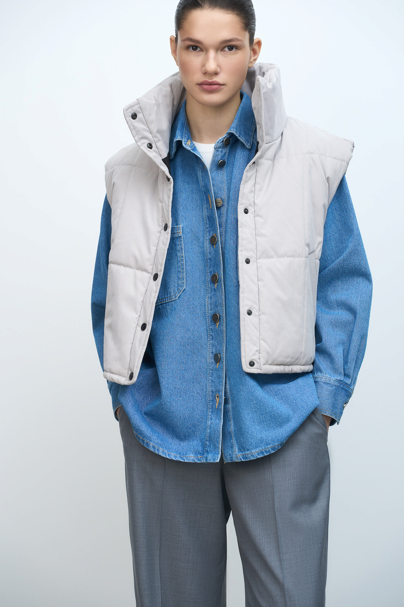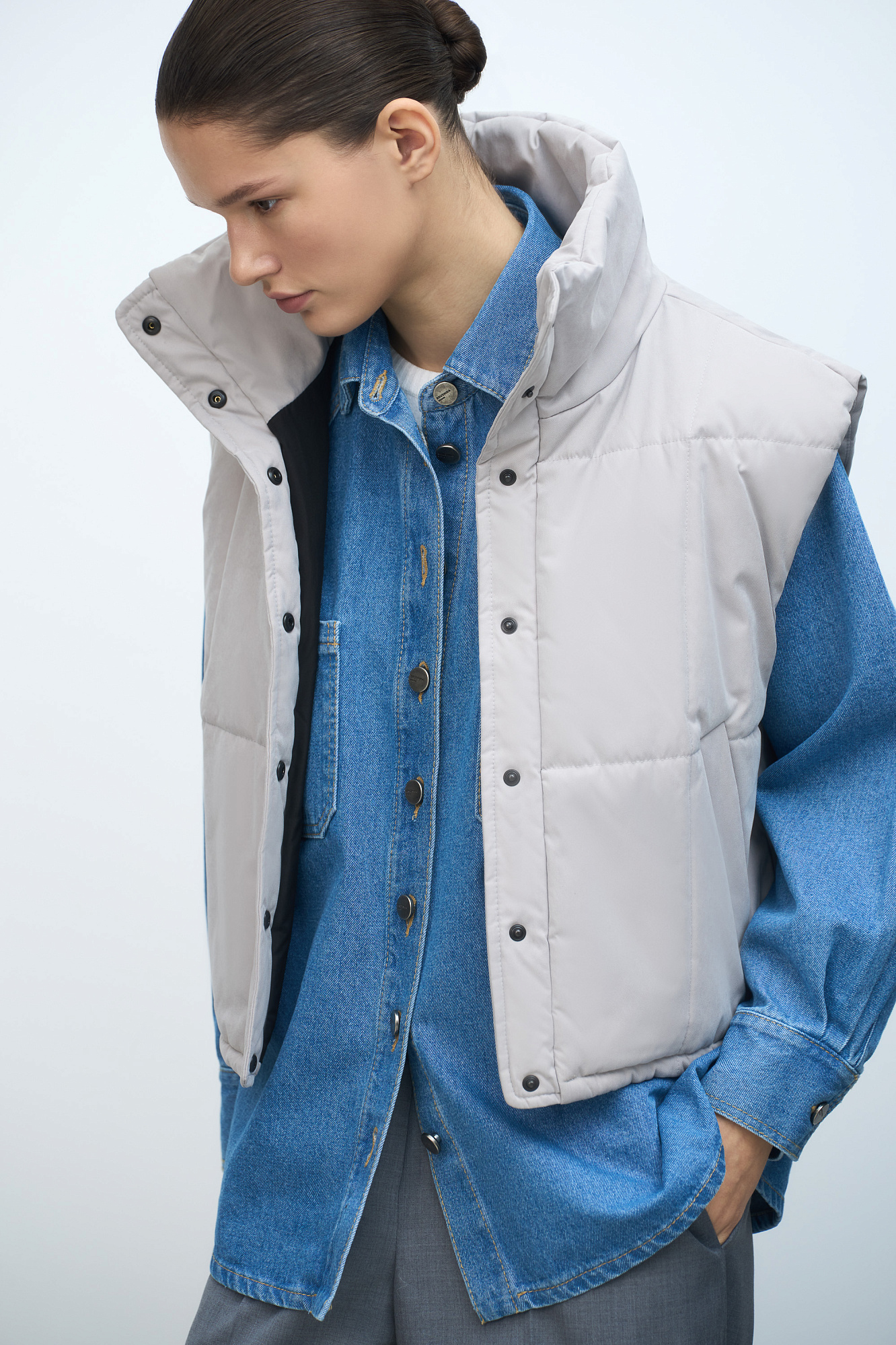 Утепленный жилет с воротником-стойкой. Модель приталенного силуэта с застежкой на кнопки.