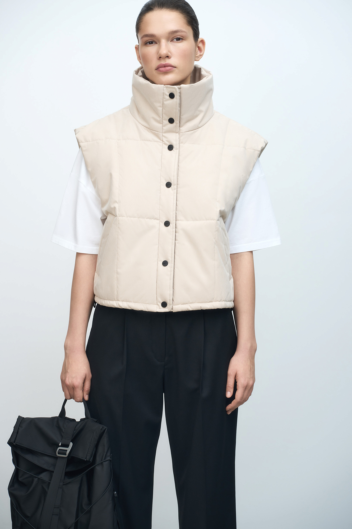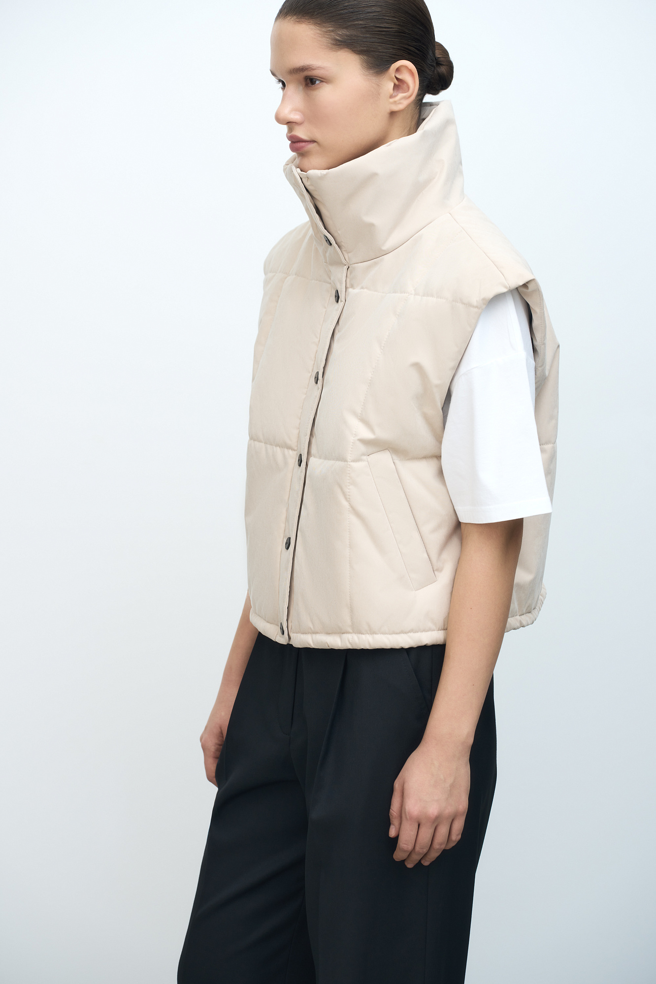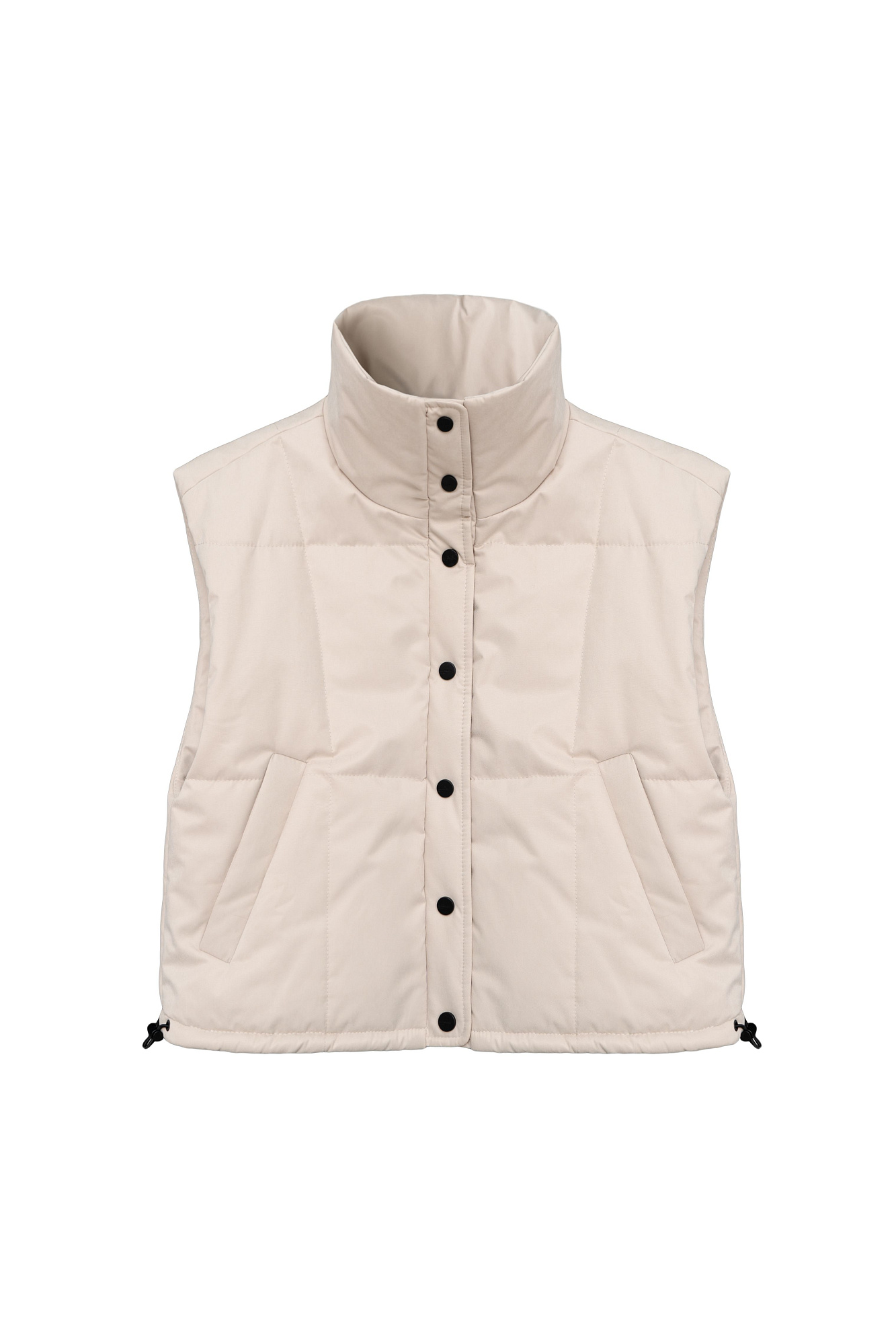 Утепленный жилет с воротником-стойкой. Модель приталенного силуэта с застежкой на кнопки.
