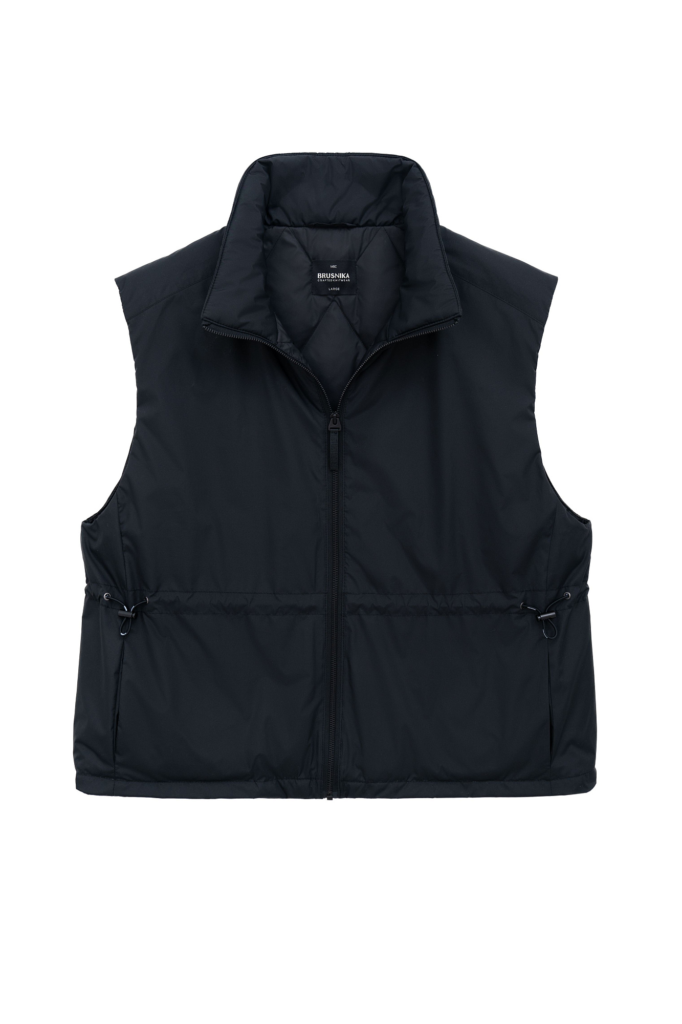Жилет на пуху с регулируемой кулиской на талии. Модель свободного силуэта с воротником-стойкой и застежкой на молнию.