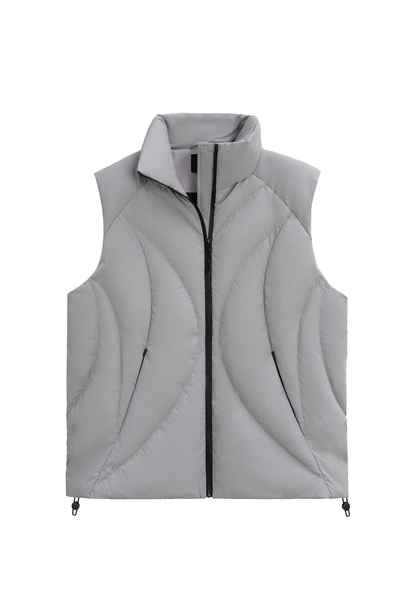 Стеганый жилет на пуху с регулируемой кулиской по краям. Модель свободного силуэта с воротником-стойкой и застежкой на молнию.