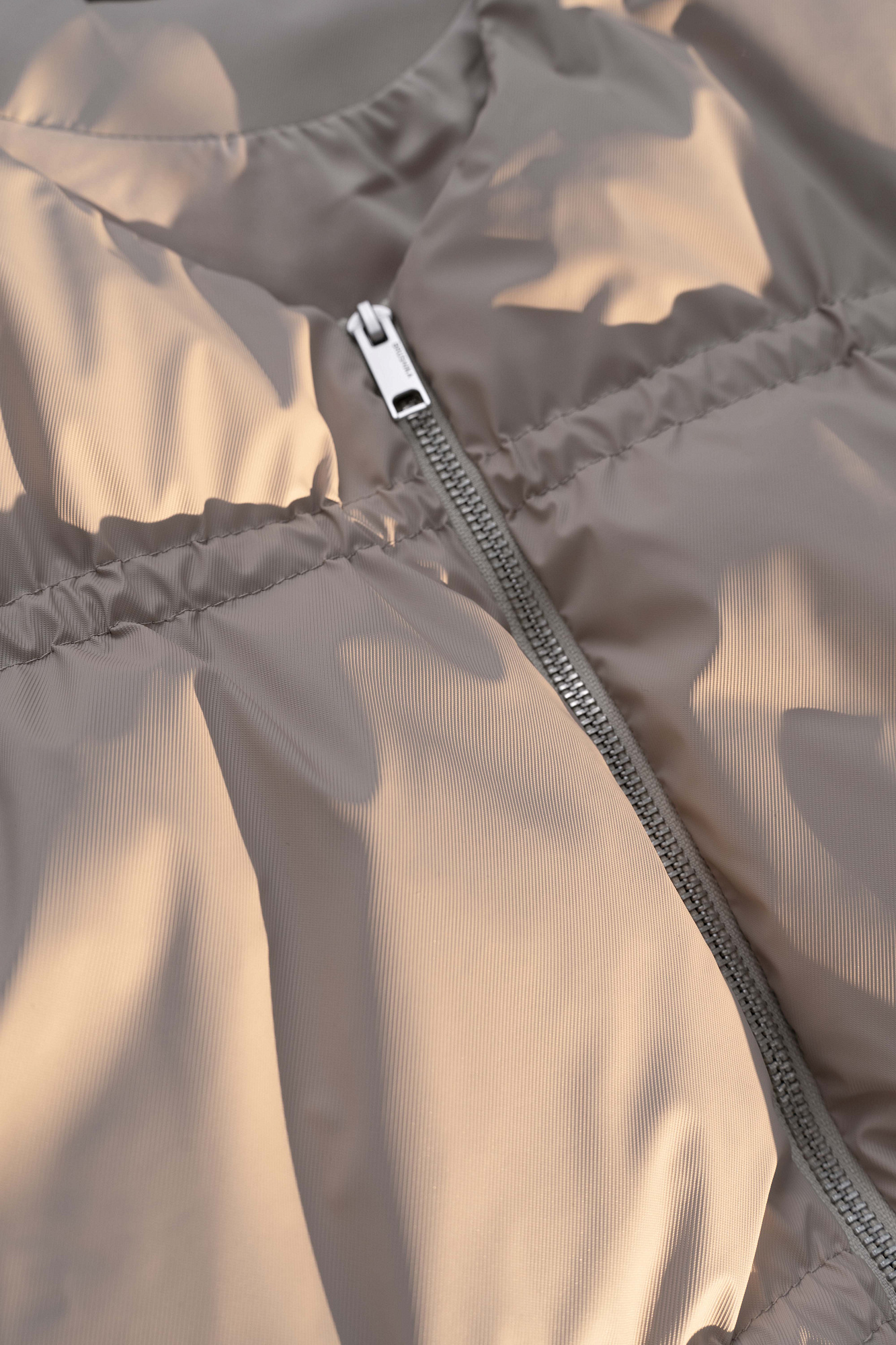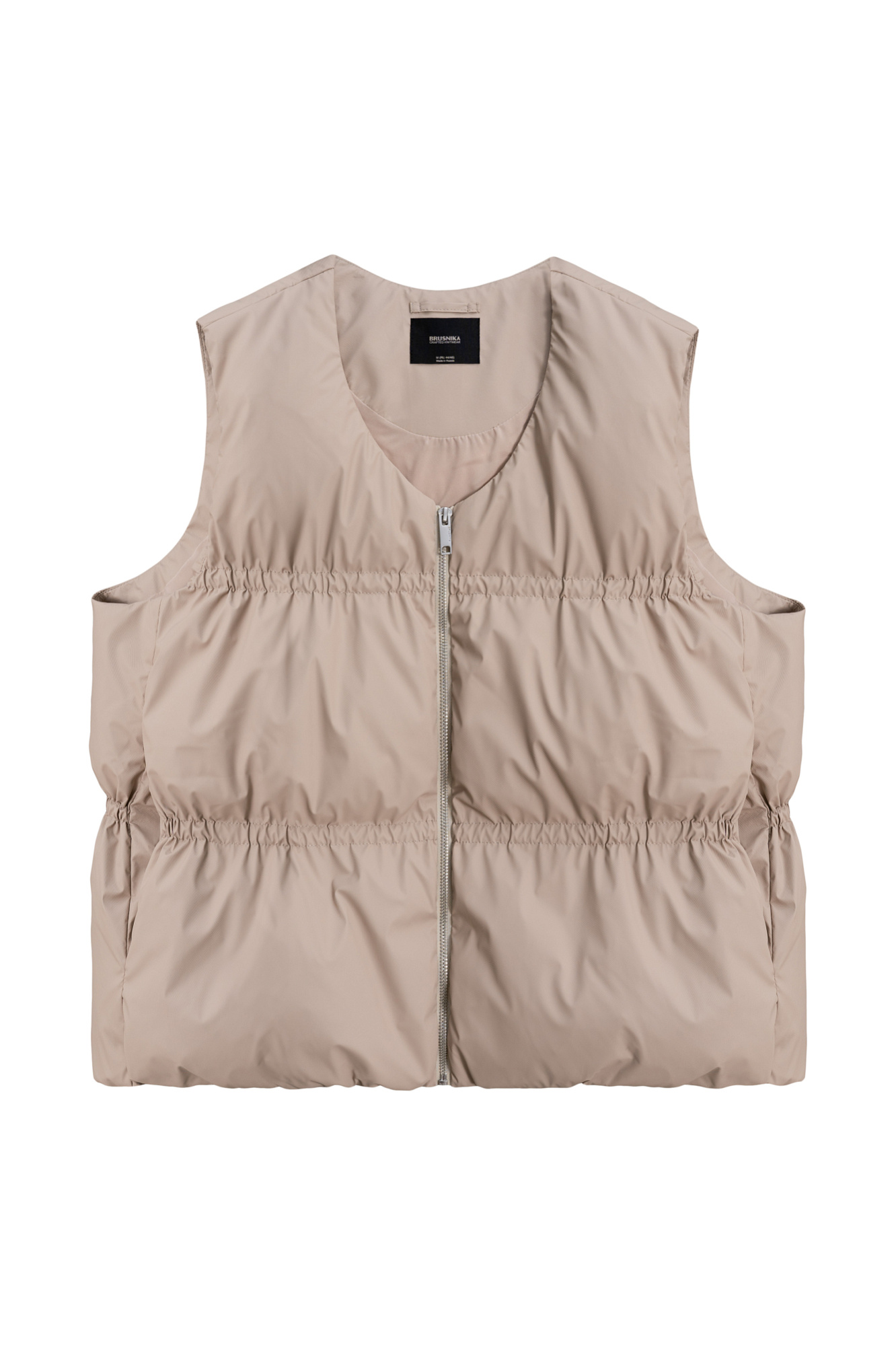 Стеганый жилет на пуху. Модель свободного силуэта с V-образным вырезом, боковыми карманами и застежкой на молнию.