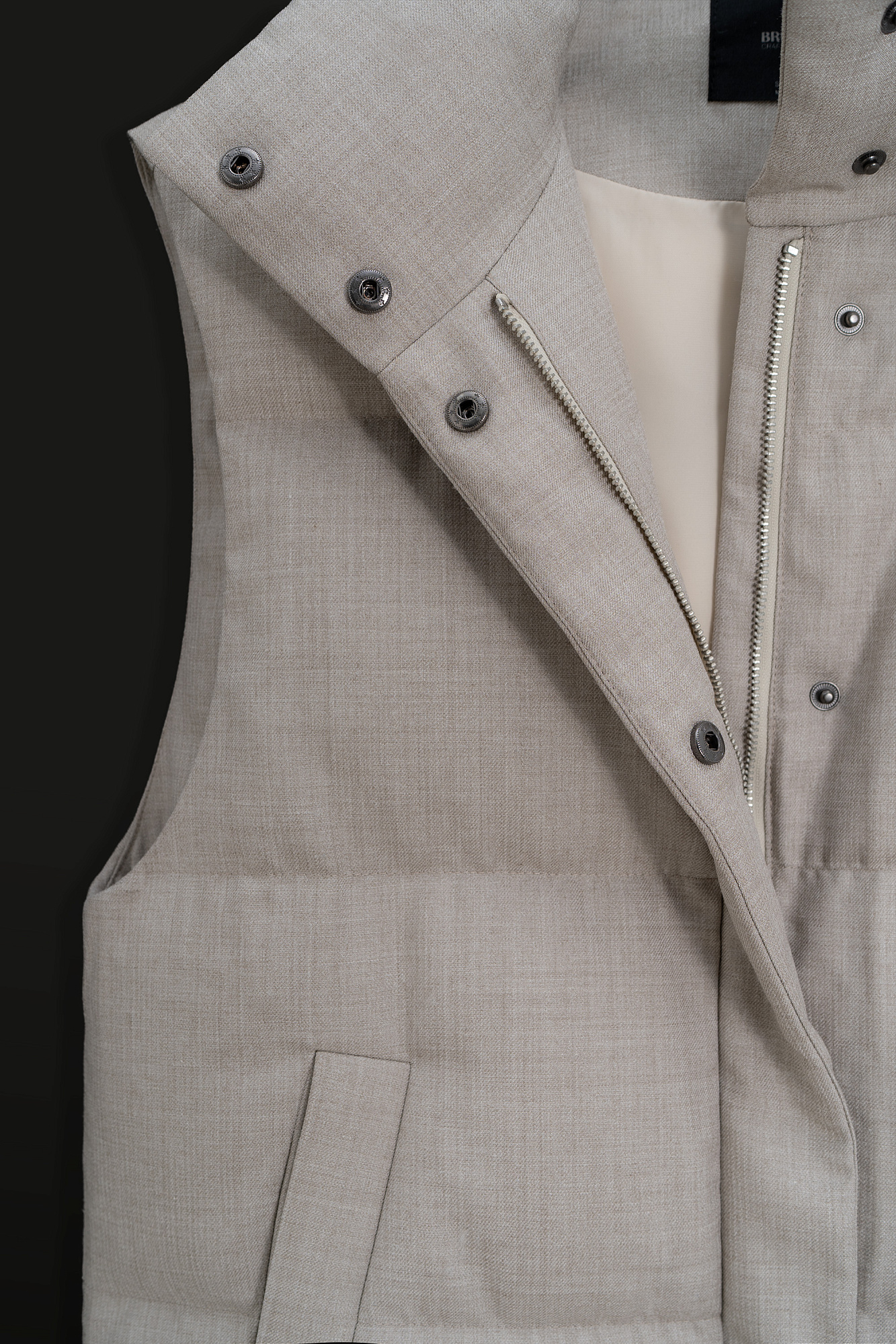 Жилет на пуху с воротником-стойкой. Верх изделия выполнен из смесовой шерсти. Модель свободного силуэта с двумя боковыми карманами. Застежка на молнию и кнопки под планкой. На подкладке.