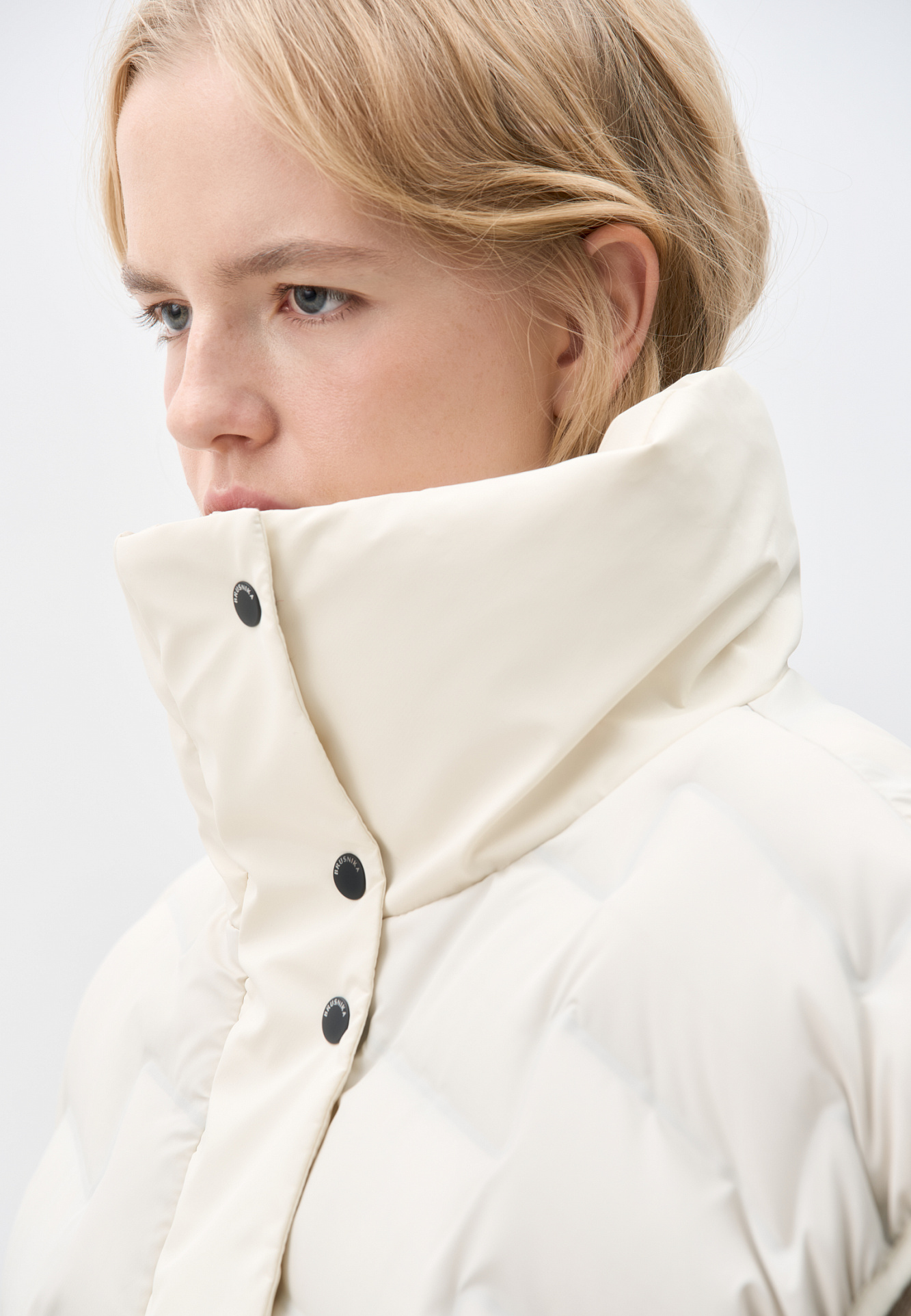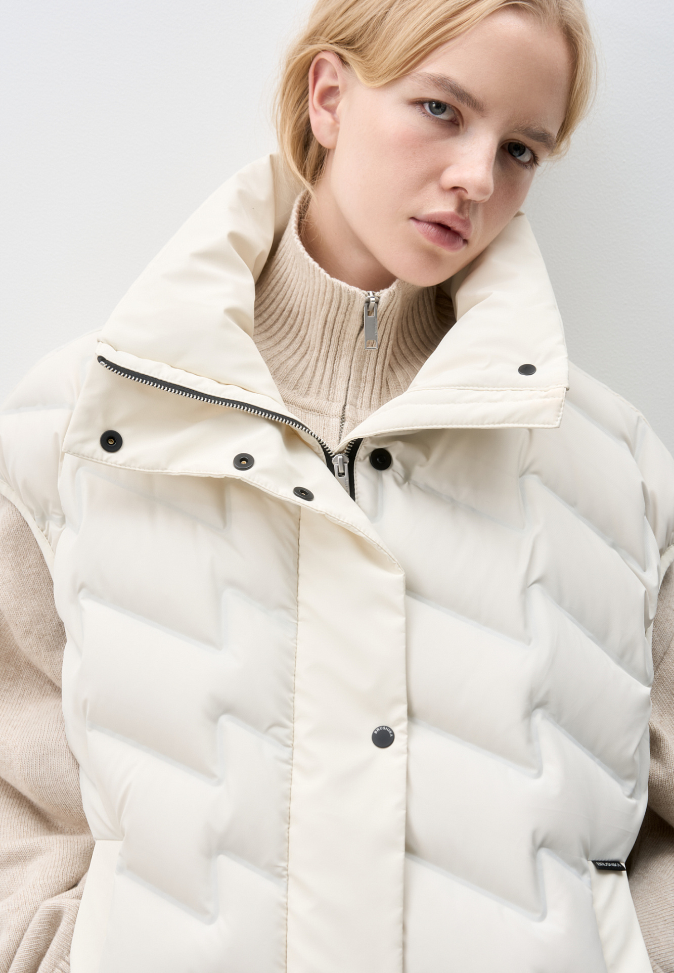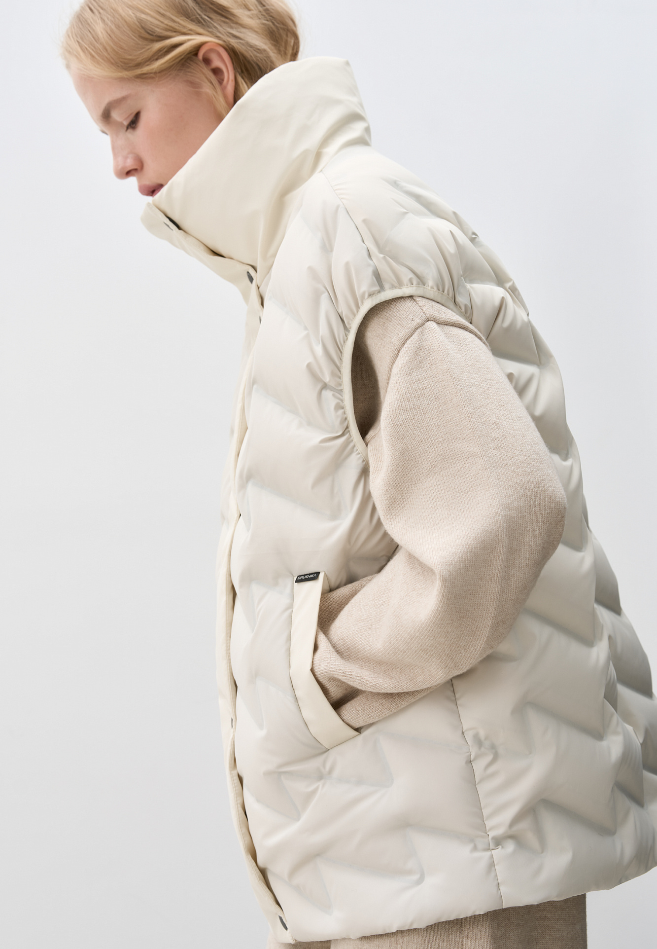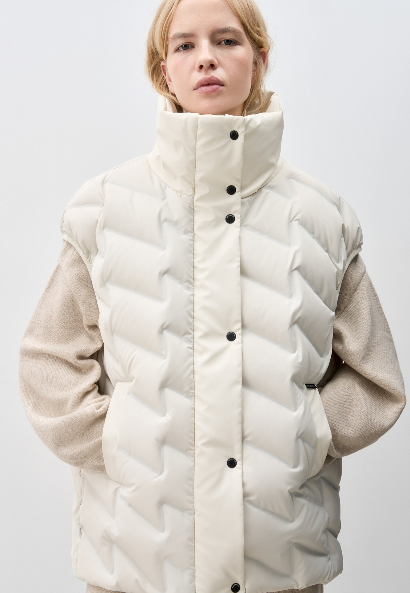 Объемный стеганый жилет на пуху. Модель прямого кроя, с воротником стойкой и боковыми карманами. Застежка на молнию и кнопки под планкой.