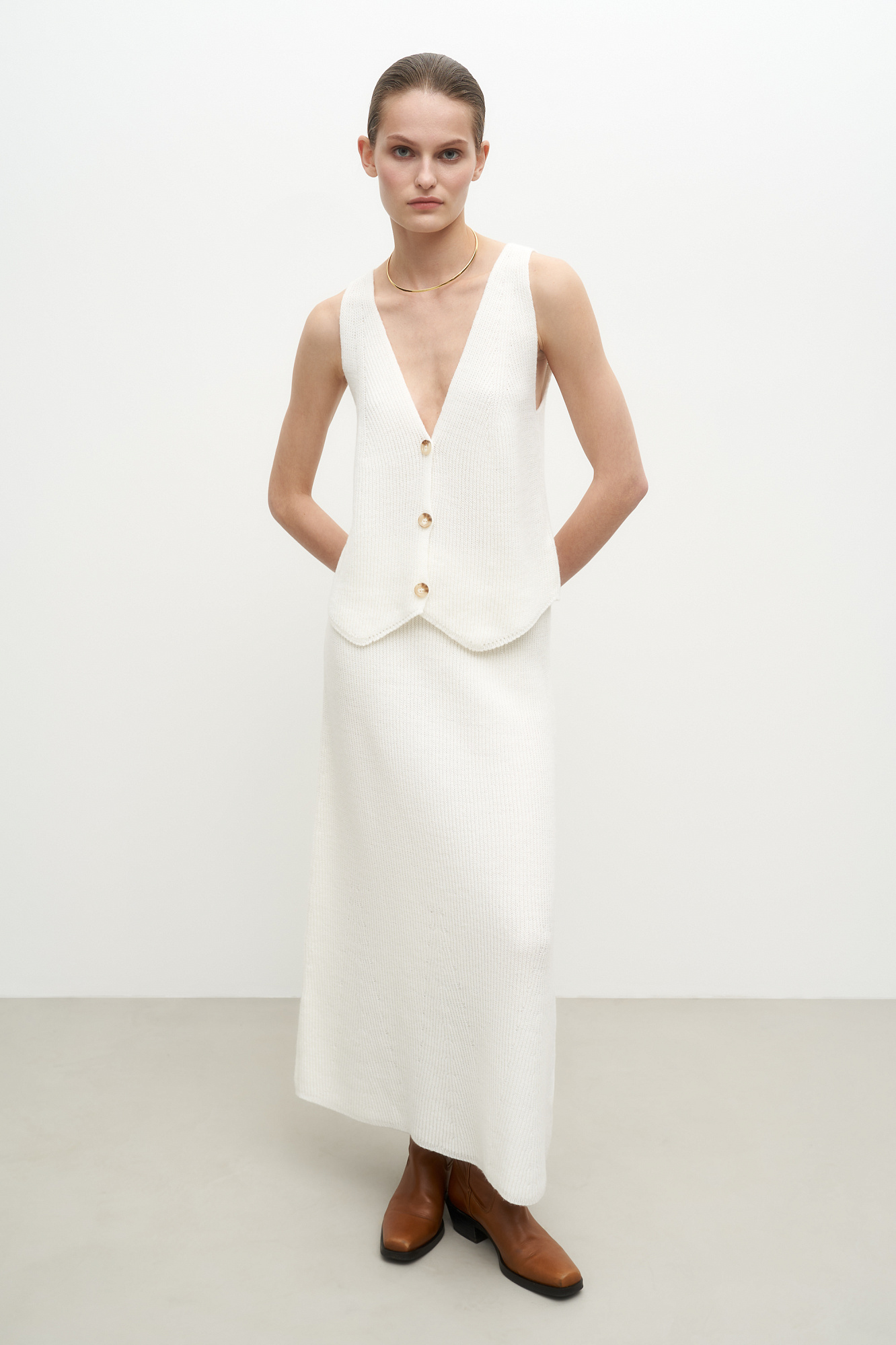 Трикотажный жилет из шерсти. Модель прямого кроя с V-образным вырезом и застежкой на пуговицы. Дополнить образ можно юбкой в таком же стиле.