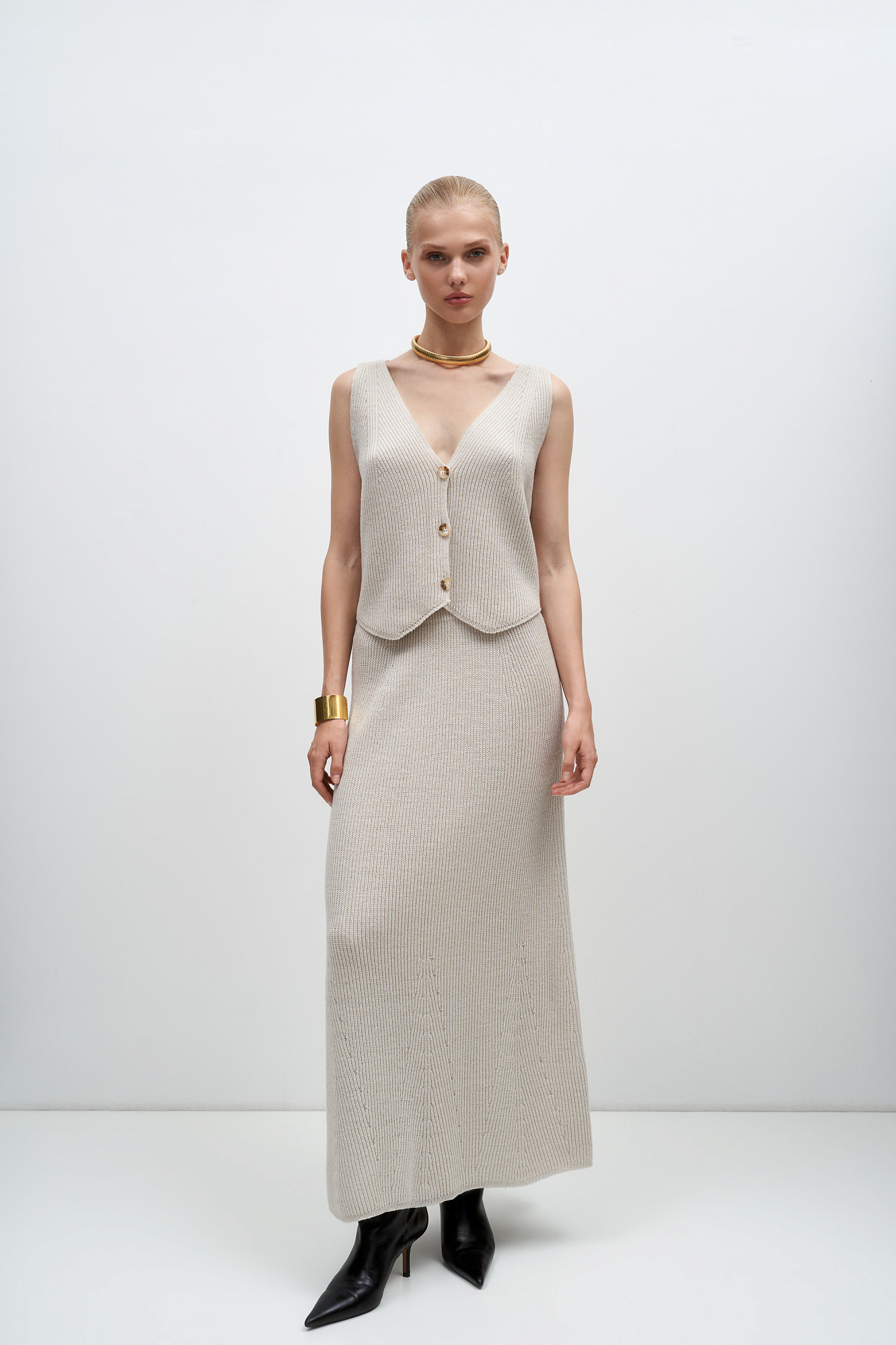 Трикотажный жилет из шерсти. Модель прямого кроя с V-образным вырезом и застежкой на пуговицы. Дополнить образ можно юбкой в таком же стиле.