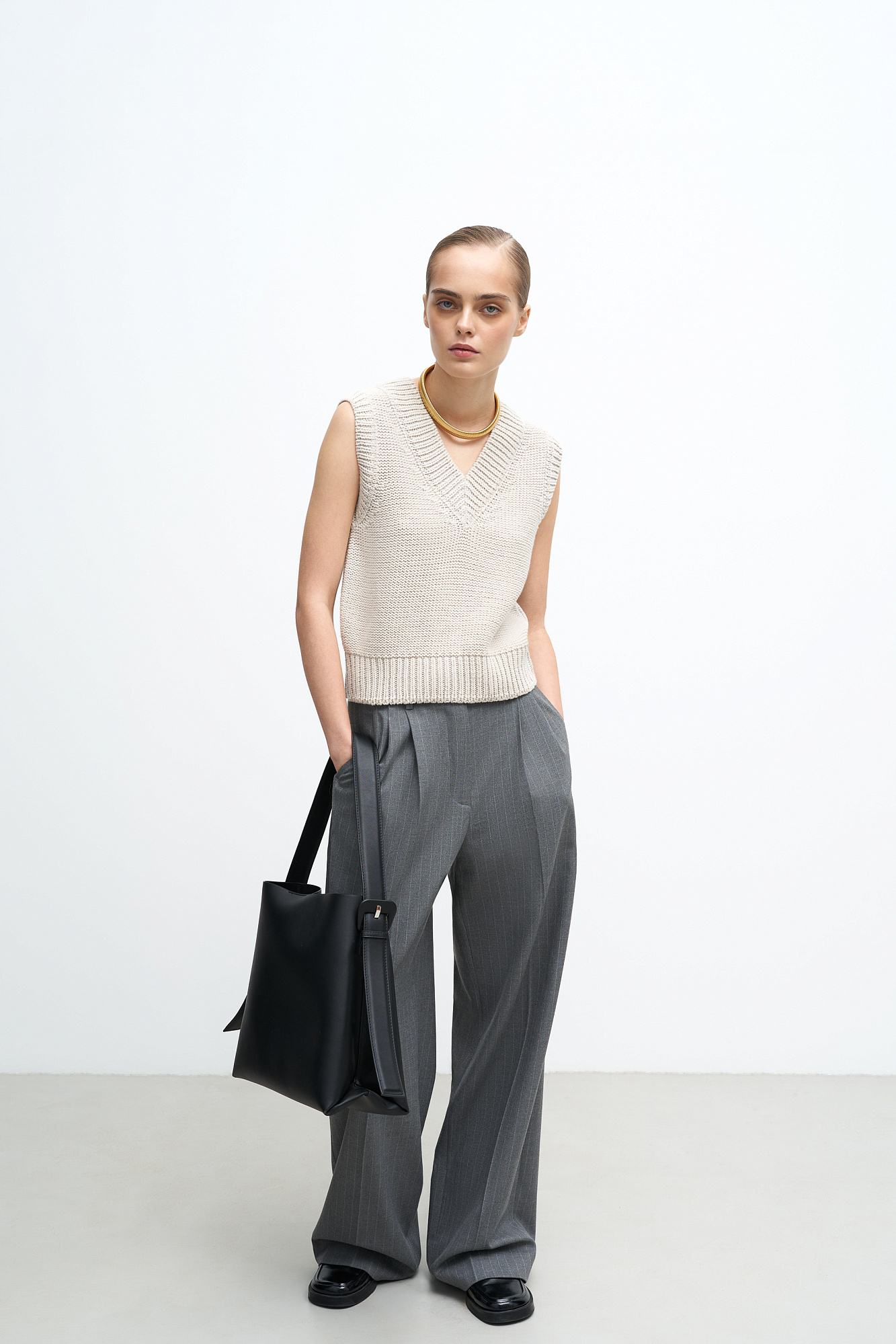 Трикотажный жилет из шерсти. Модель свободного силуэта, с V-образным вырезом, выполненным в рубчик и широкой резинкой.