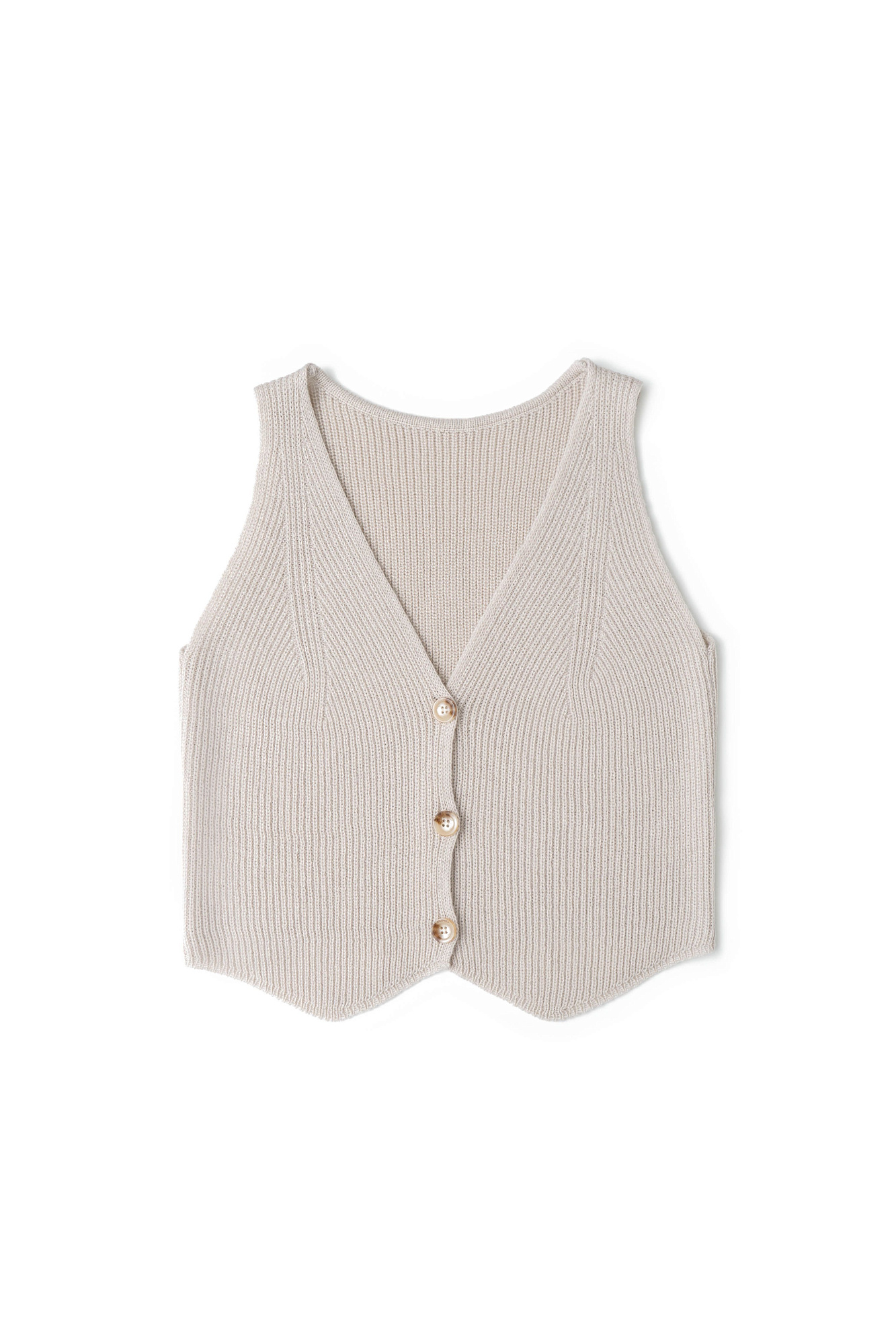 Трикотажный жилет из шерсти. Модель прямого кроя с глубоким V-образным вырезом и застежкой на пуговицы. Дополнить образ можно юбкой в таком же стиле.