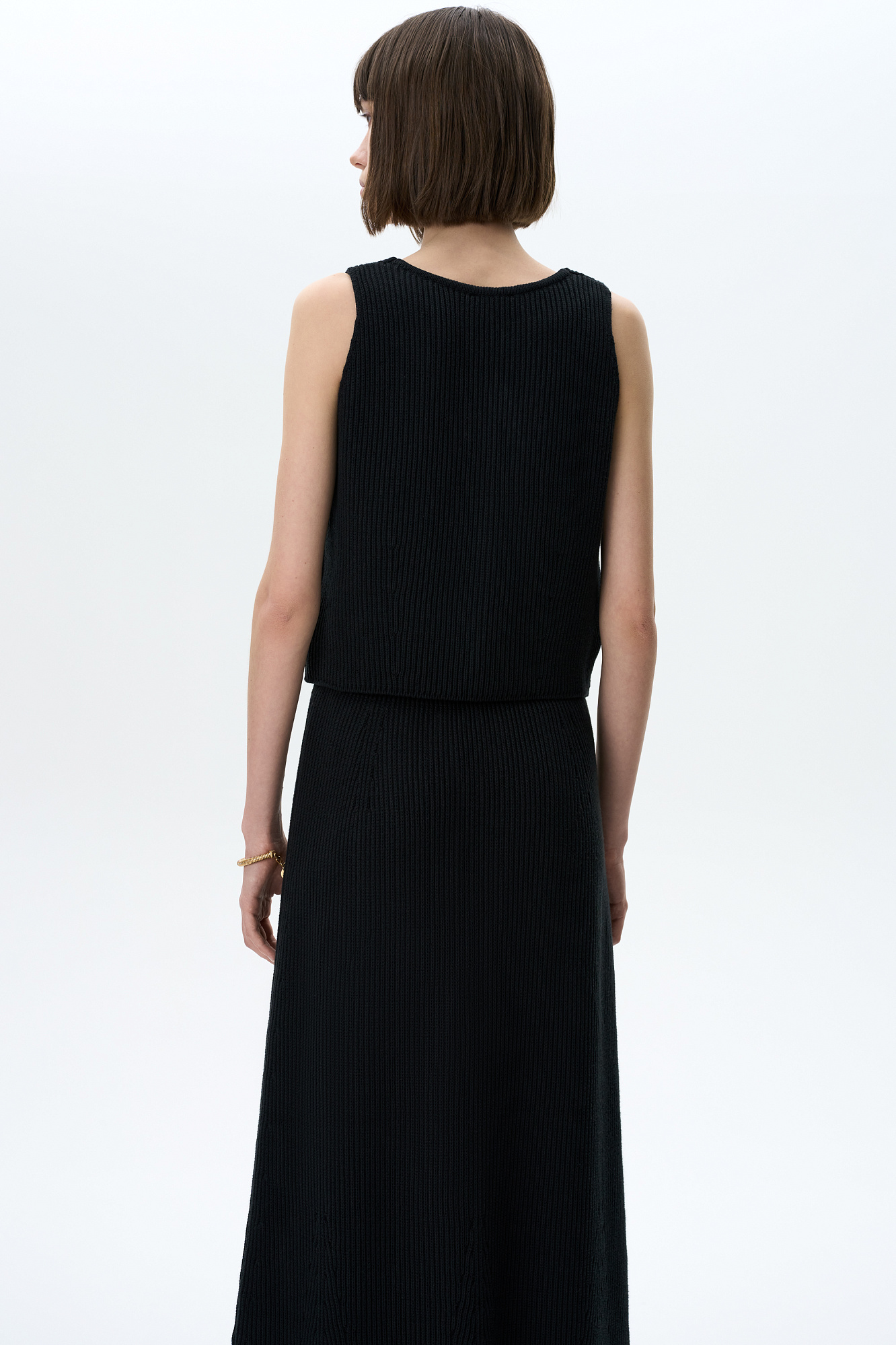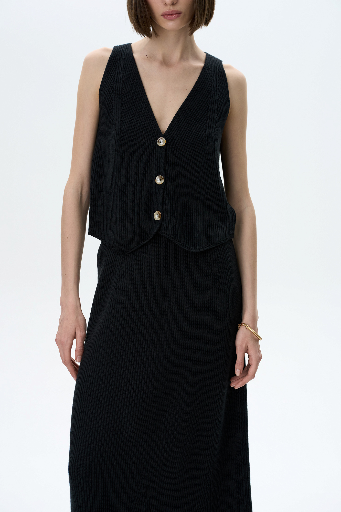 Трикотажный жилет из хлопка. Модель прямого кроя с V-образным вырезом и застежкой на пуговицы. Дополнить образ можно юбкой в таком же стиле.