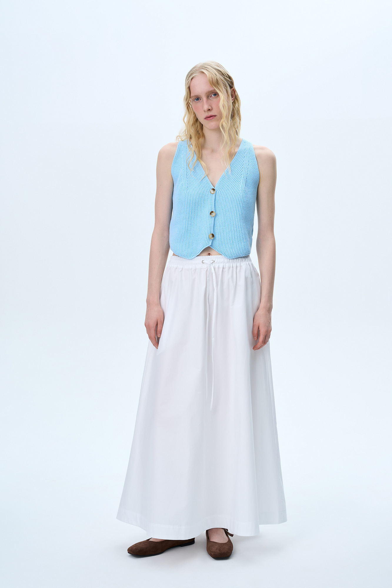 Трикотажный жилет из хлопка. Модель прямого кроя с V-образным вырезом и застежкой на пуговицы. Дополнить образ можно юбкой в таком же стиле.