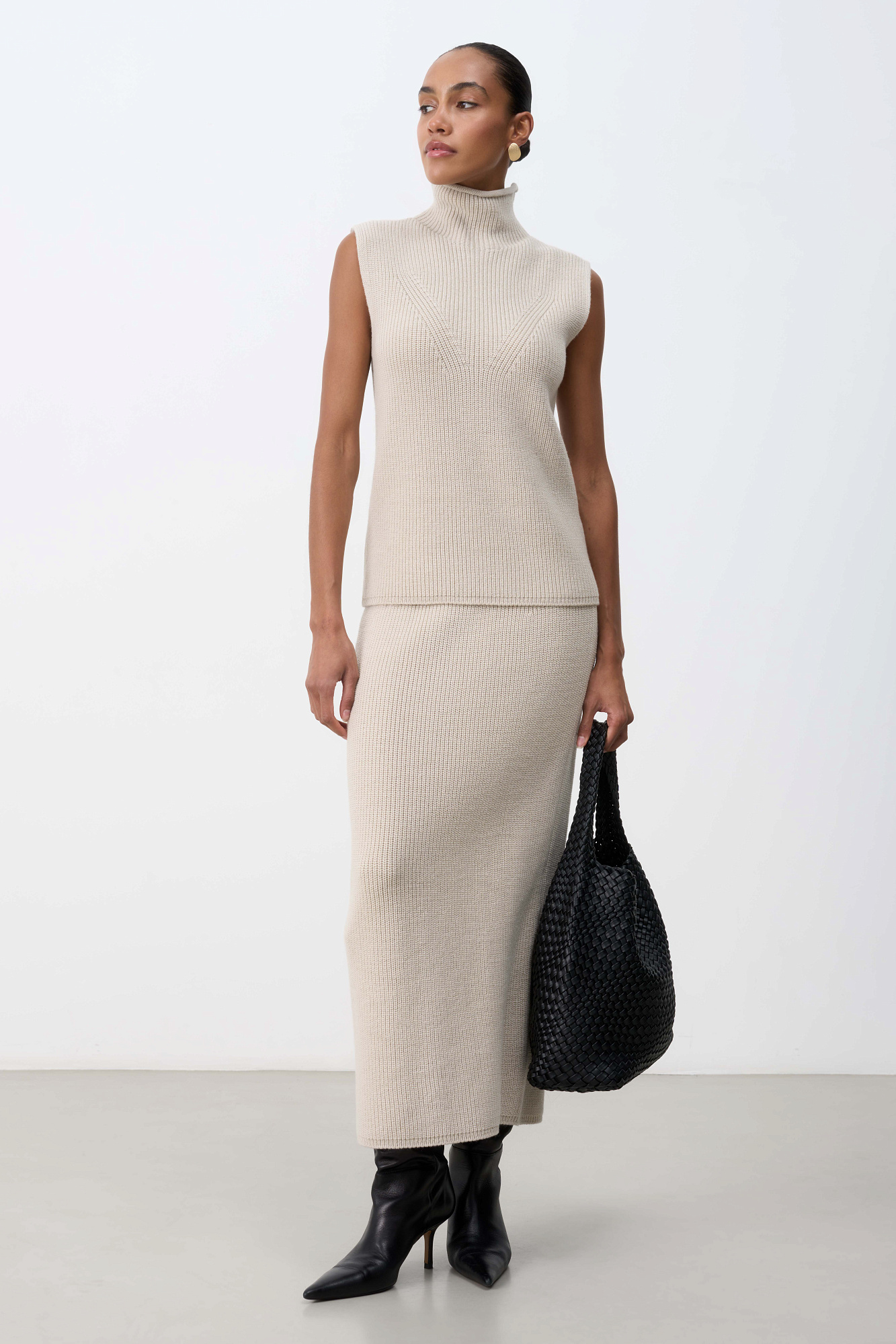 Трикотажный жилет из шерсти с добавлением акрила. Модель прямого силуэта, без рукавов, с декоративными сбавками на груди и высоким воротником с валиком. Дополнить образ можно юбкой в таком же стиле.