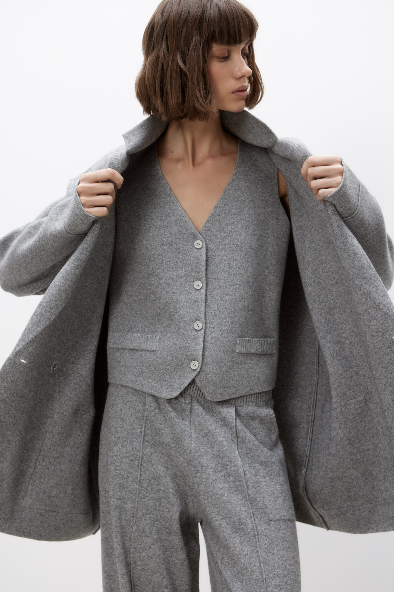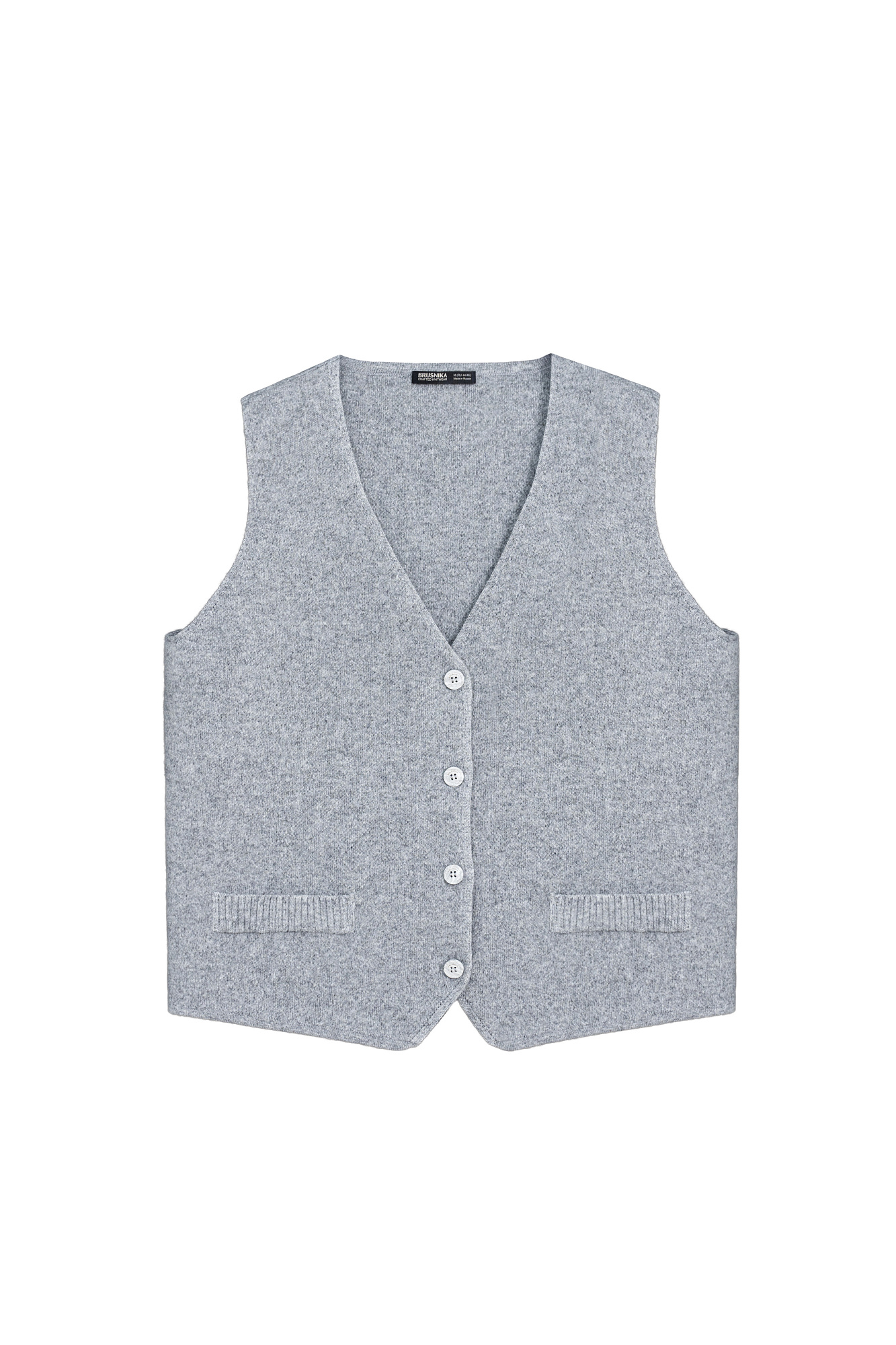 Трикотажный жилет из смесовой шерсти с кашемиром. Модель прямого кроя с V-образным вырезом и застежкой на пуговицы. Имитация карманов. Без подкладки.