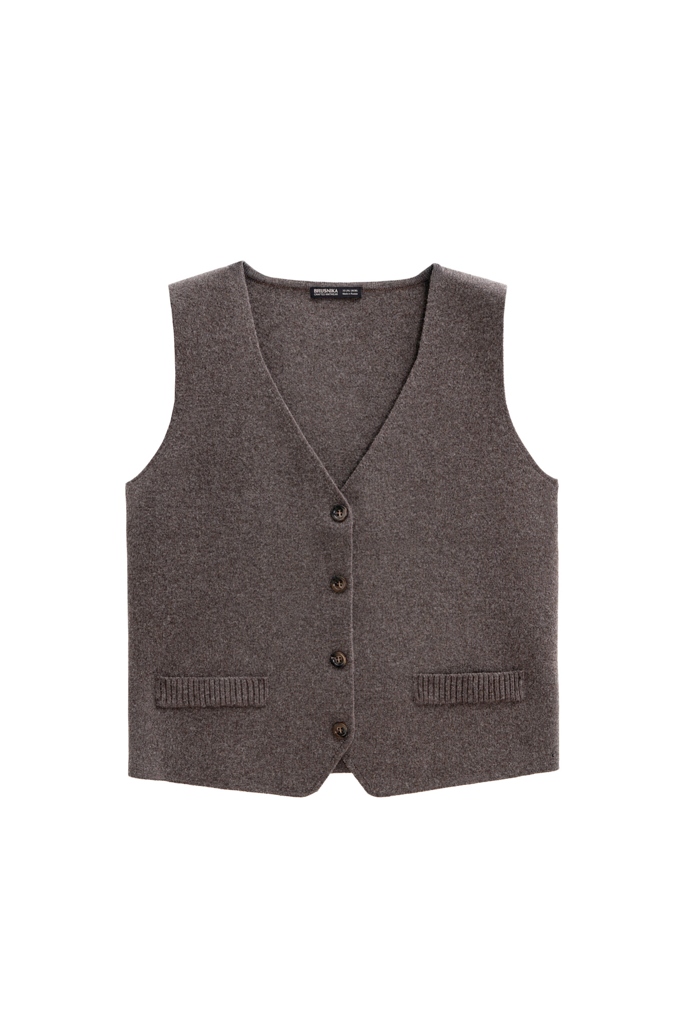 Трикотажный жилет из смесовой шерсти с кашемиром. Модель прямого кроя с V-образным вырезом и застежкой на пуговицы. Имитация карманов. Без подкладки.