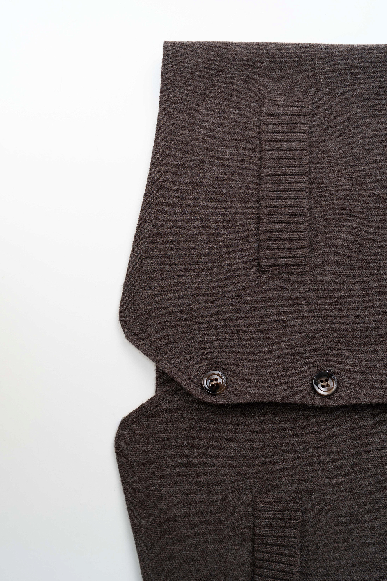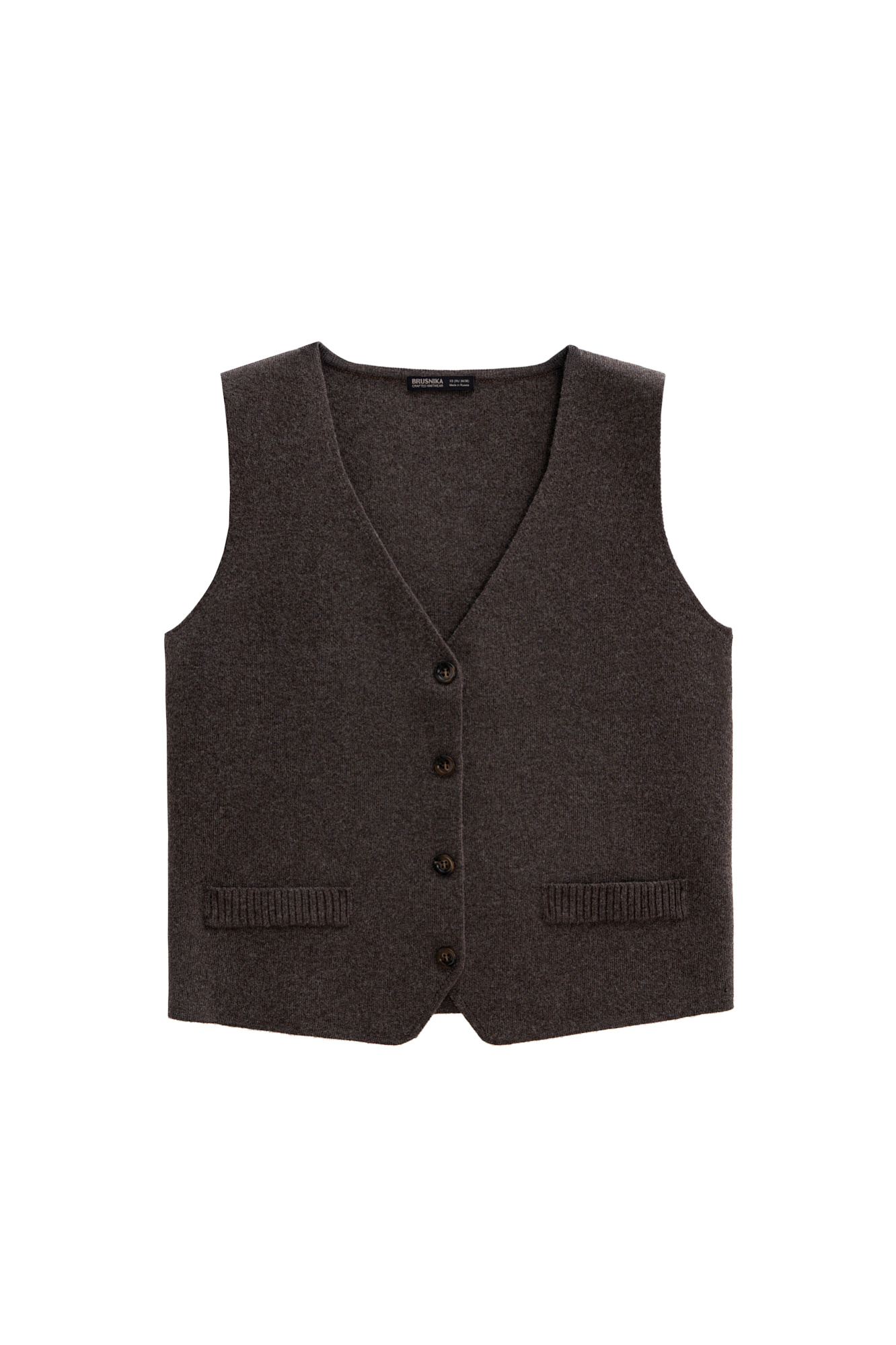Трикотажный жилет из смесовой шерсти с кашемиром. Модель прямого кроя с V-образным вырезом и застежкой на пуговицы. Имитация карманов. Без подкладки.