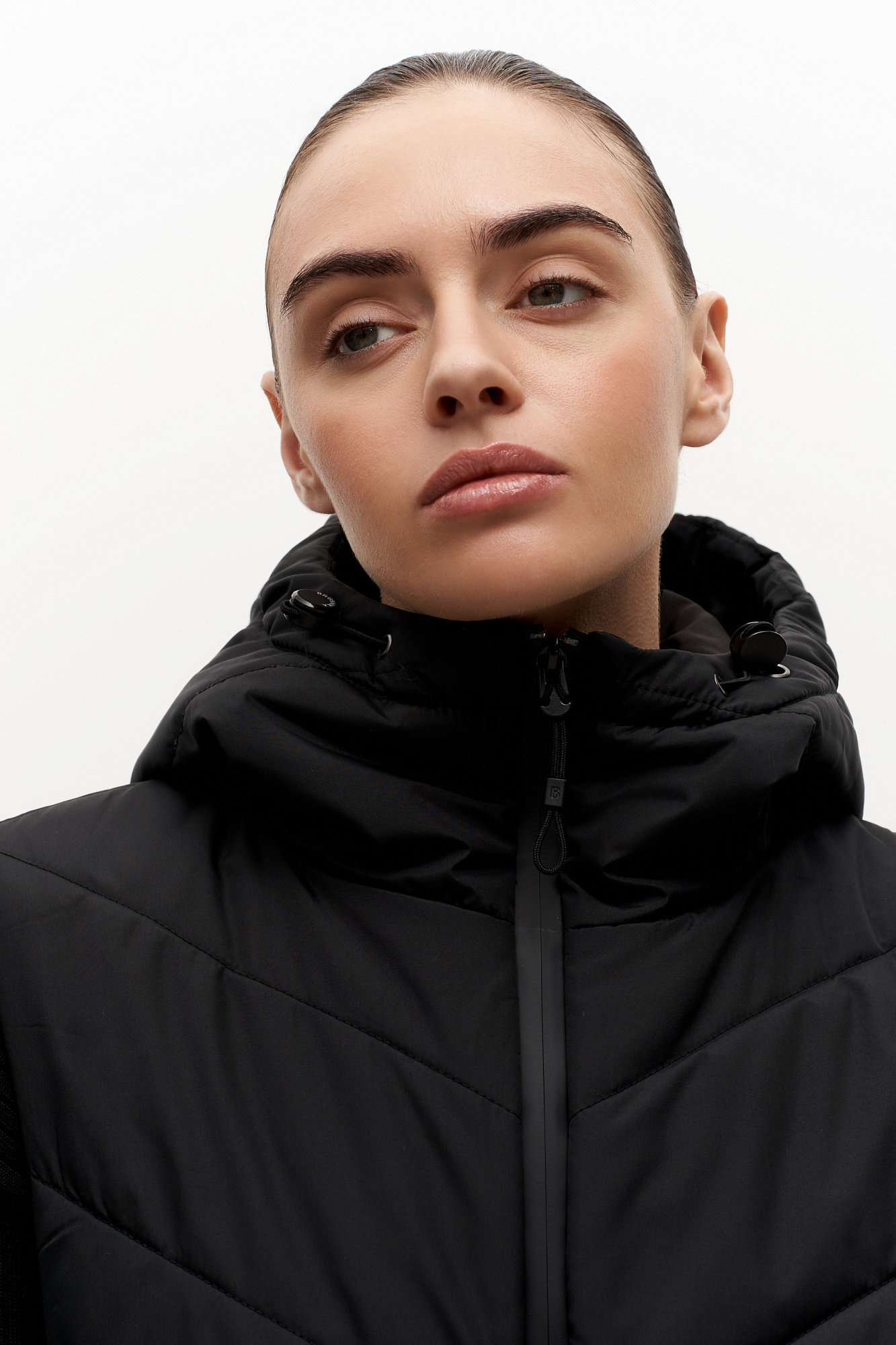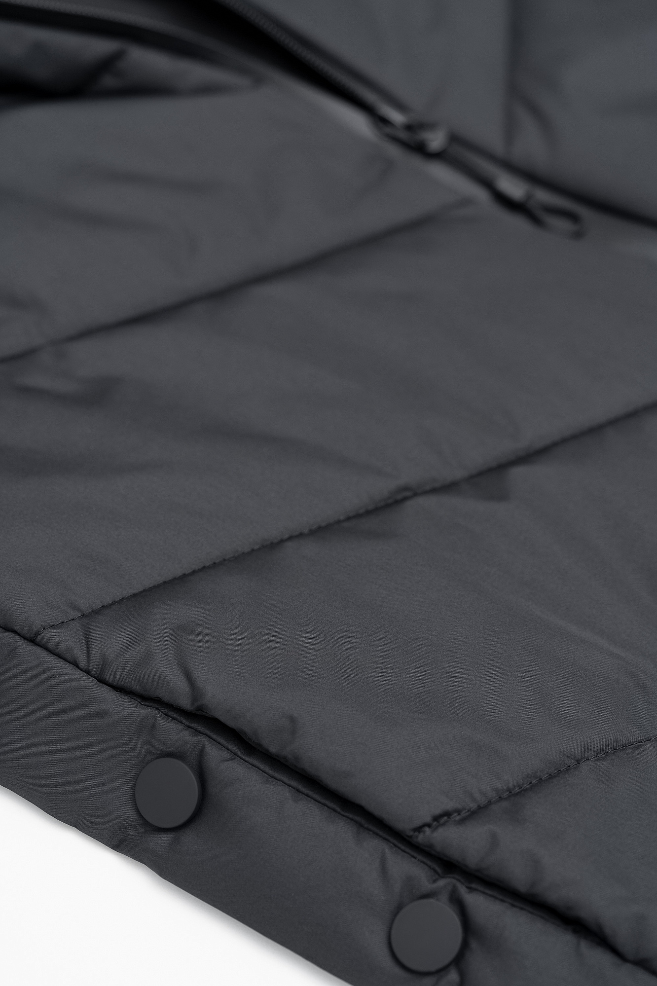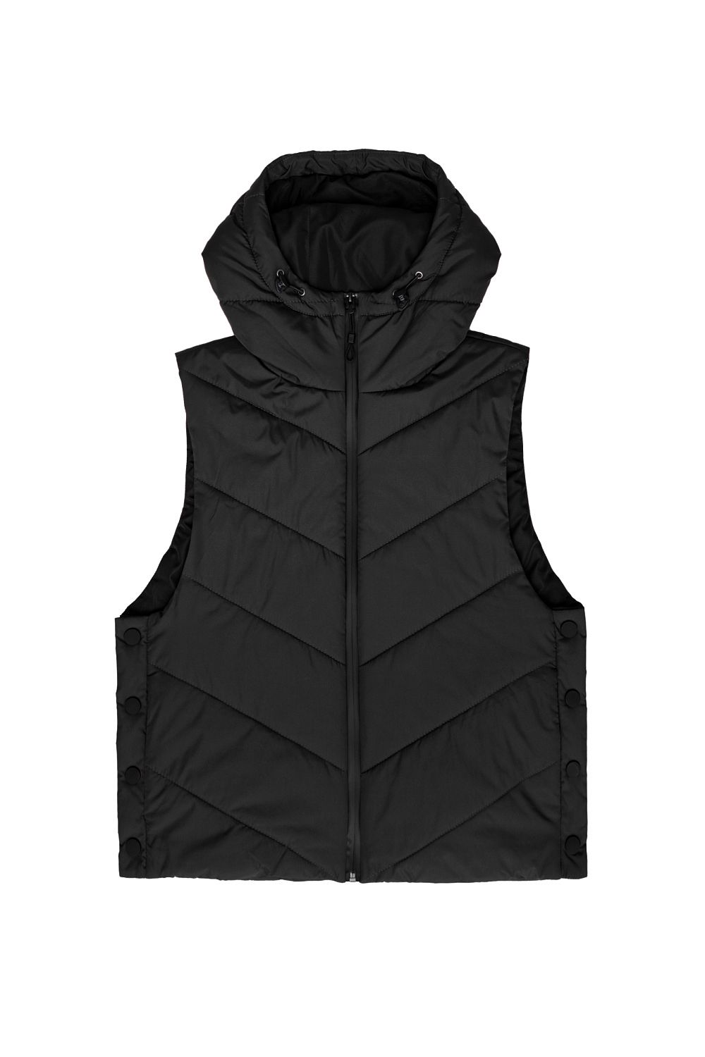 Oversize жилет на синтепоне с капюшоном. Модель свободного силуэта с застежками на кнопки по бокам и молнию.