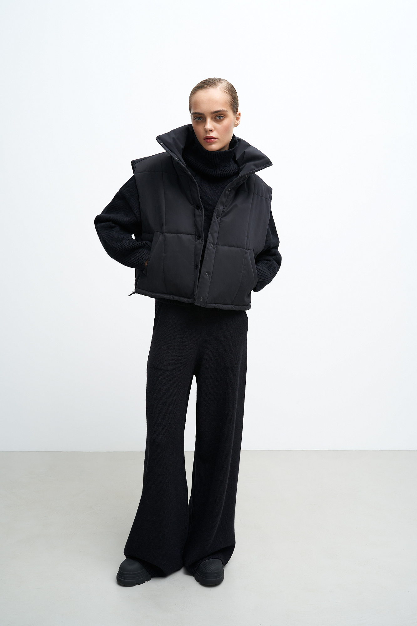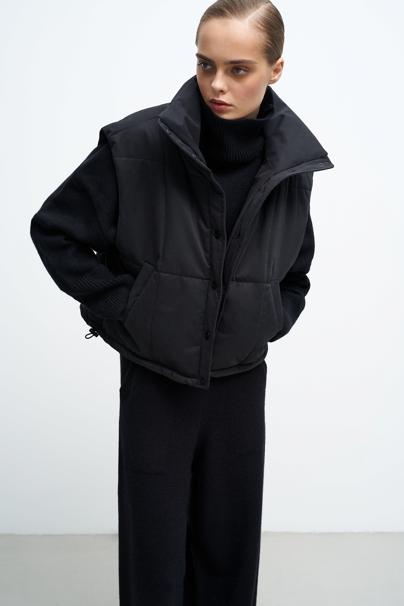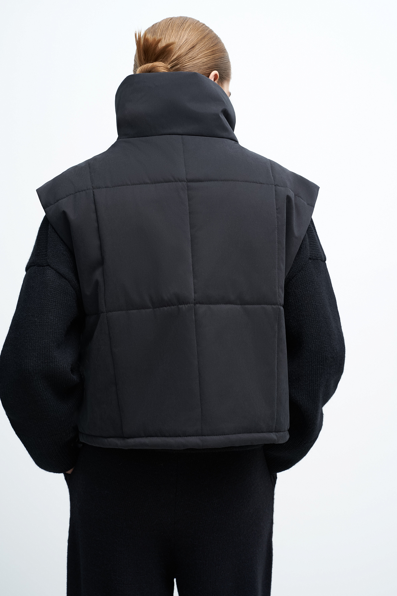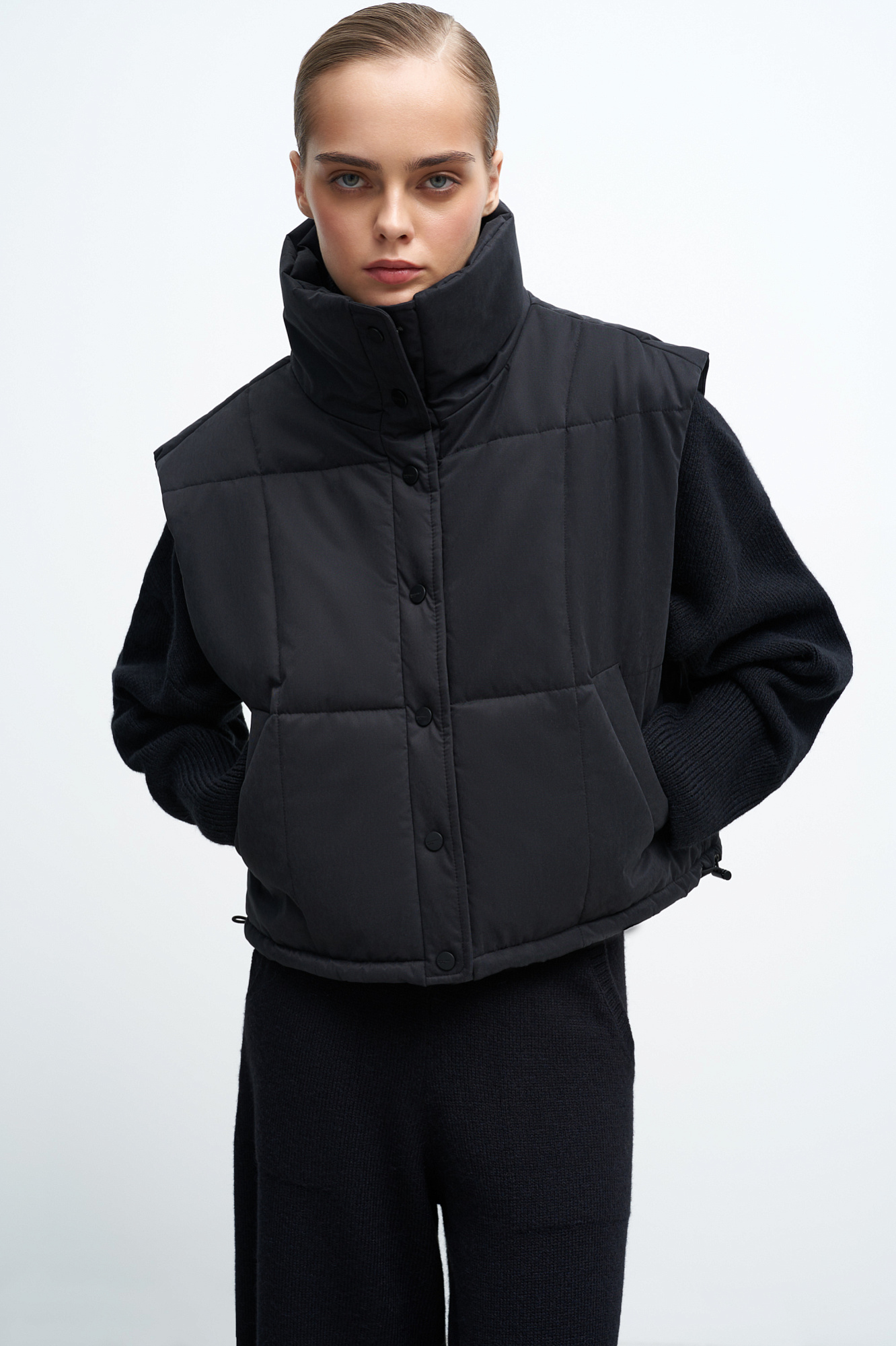 Утепленный жилет с воротником-стойкой. Модель приталенного силуэта с застежкой на кнопки.