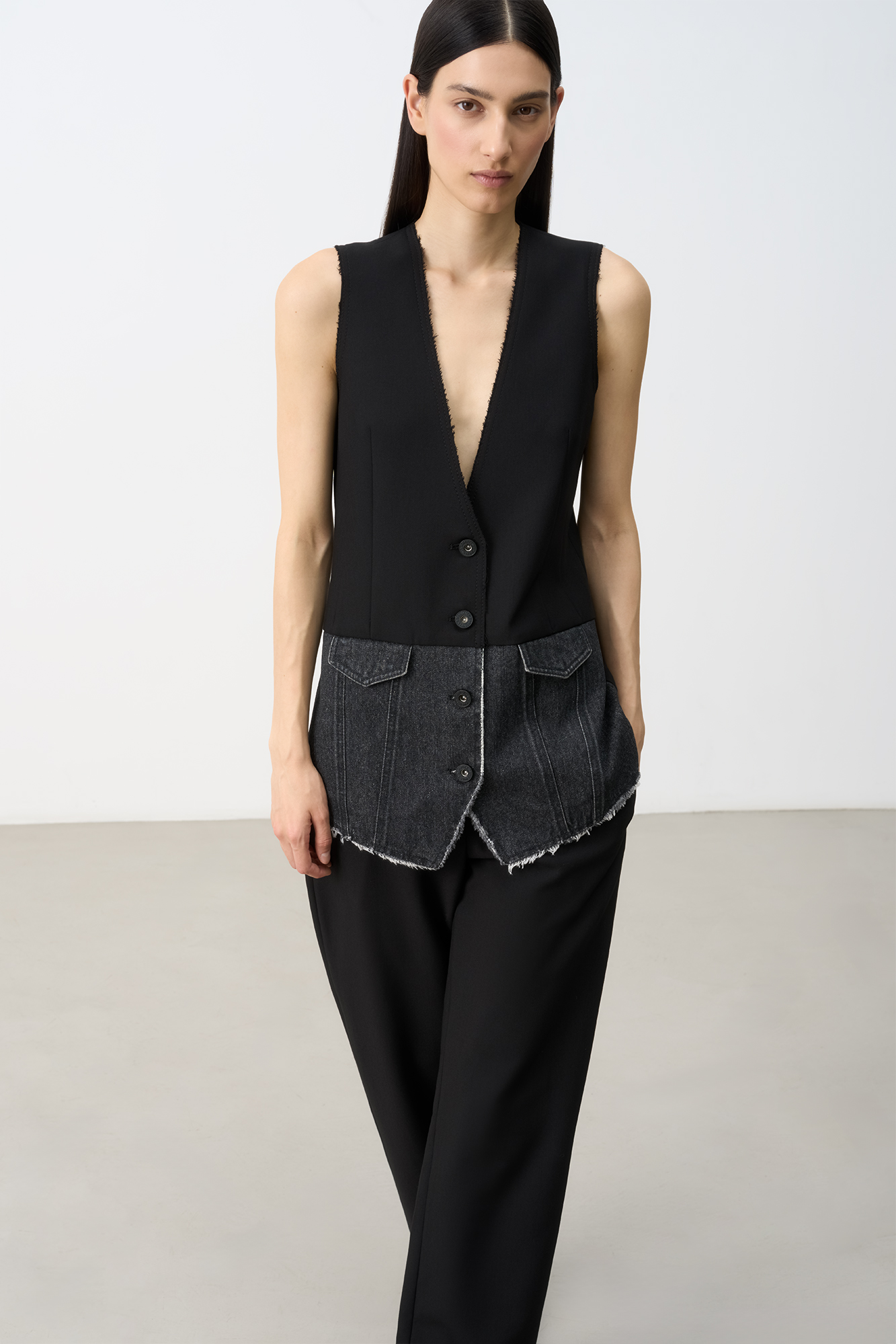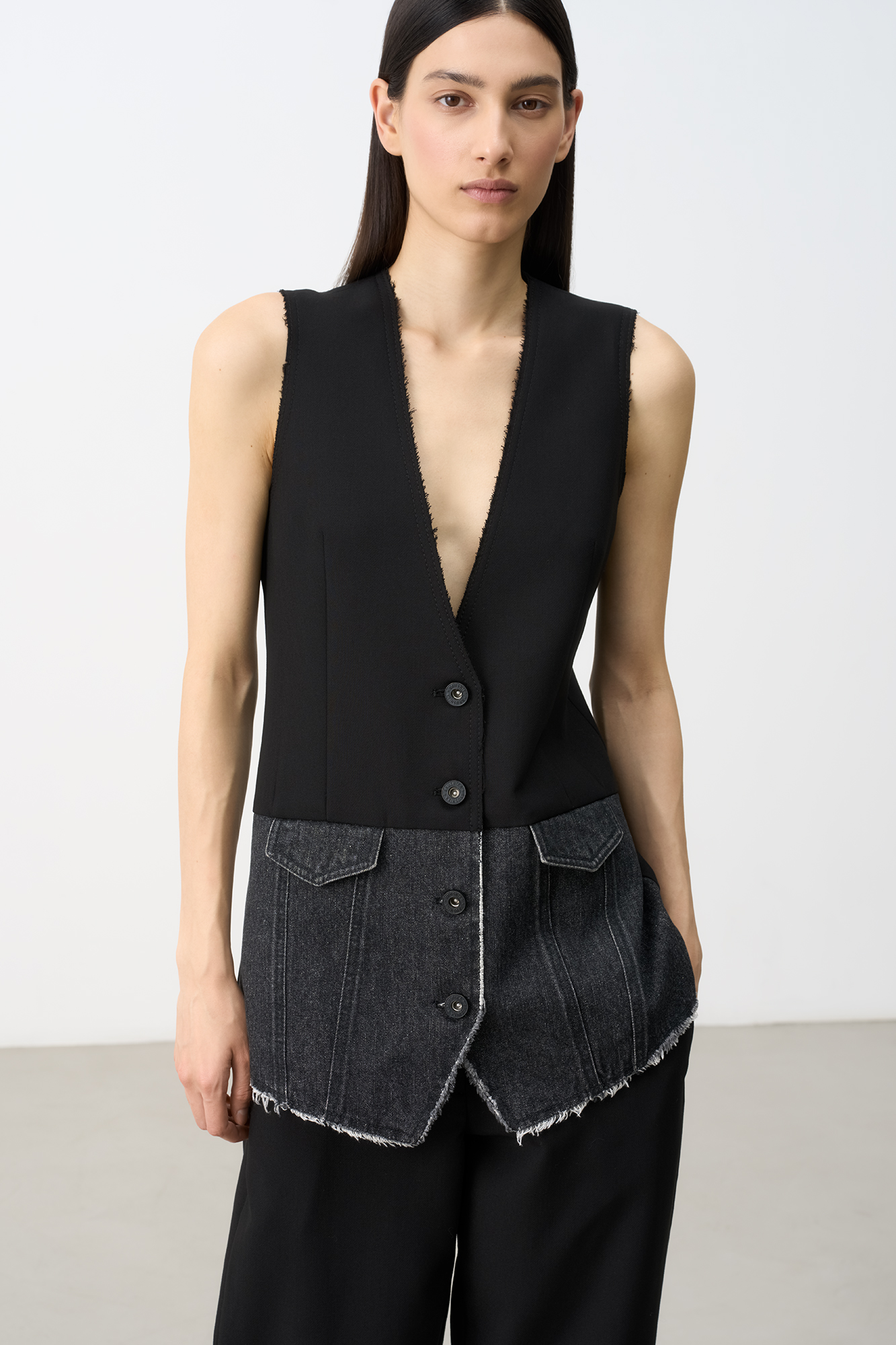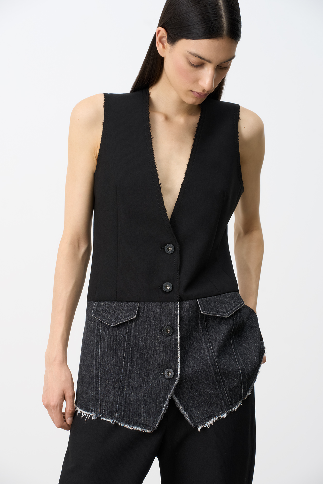 Жилет с имитацией карманов. Модель свободного силуэта выполнена из комбинированой ткани. Застежка на пуговицы. На подкладке.
