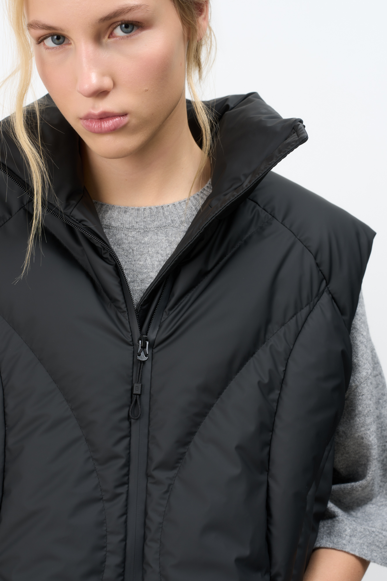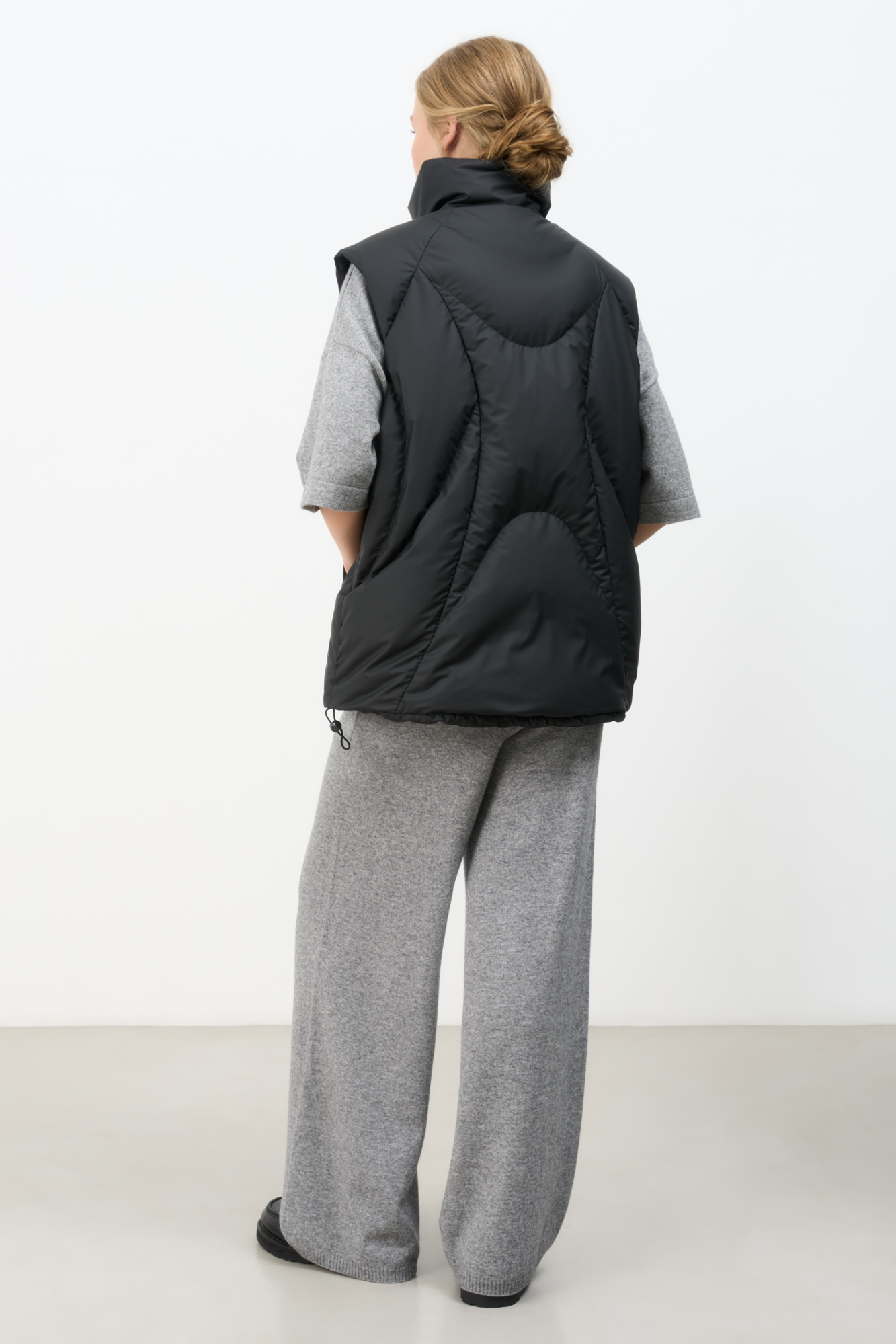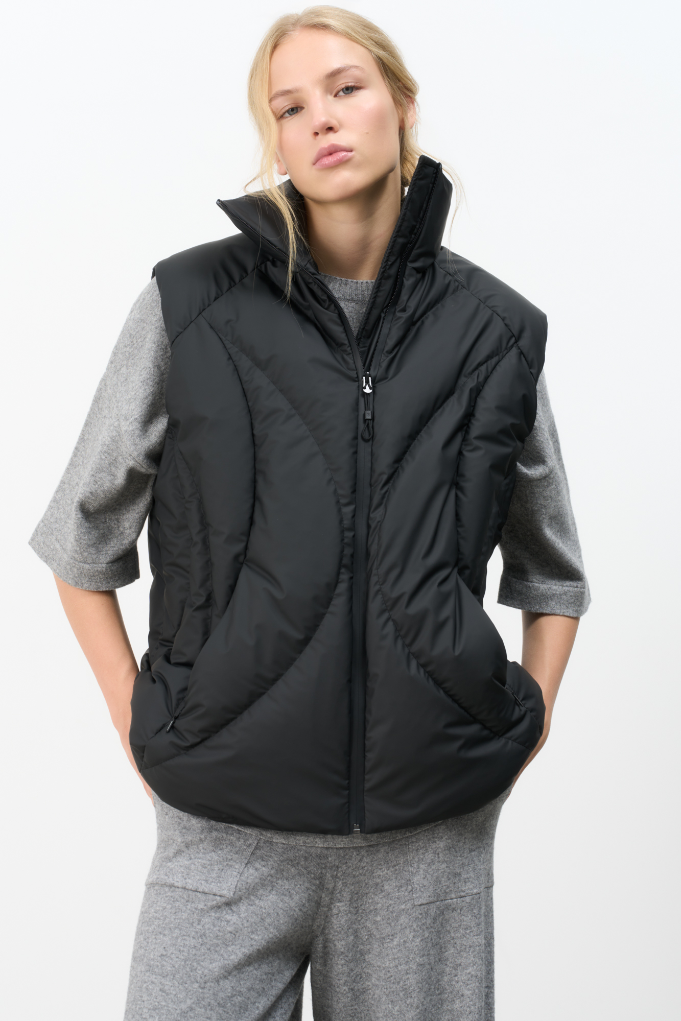 Стеганый жилет на пуху с регулируемой кулиской по краям. Модель свободного силуэта с воротником-стойкой и застежкой на молнию.
