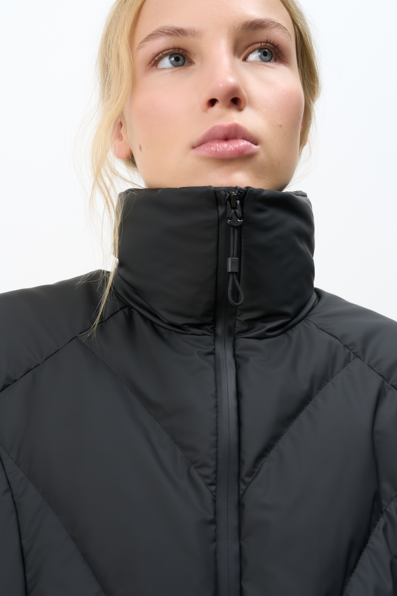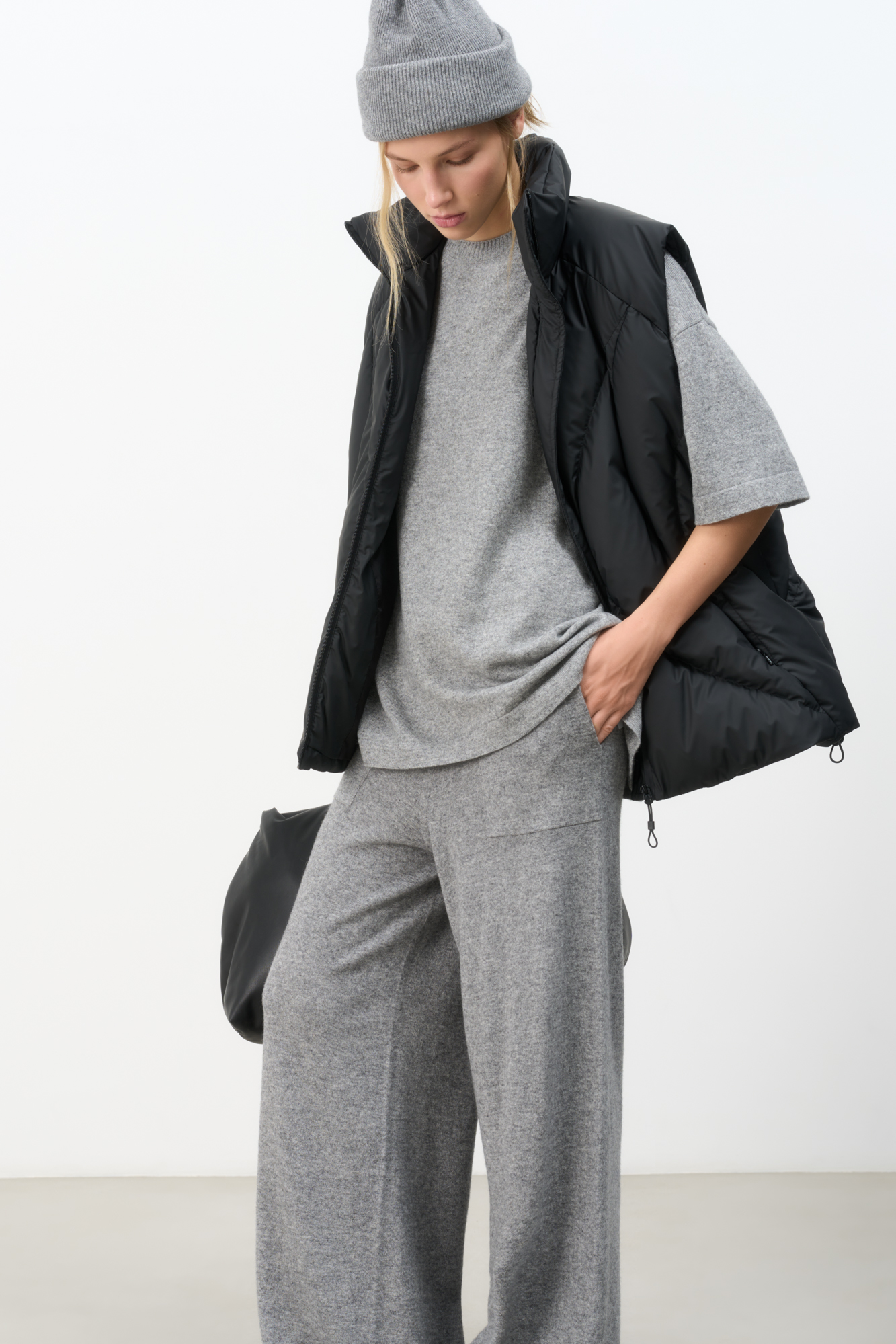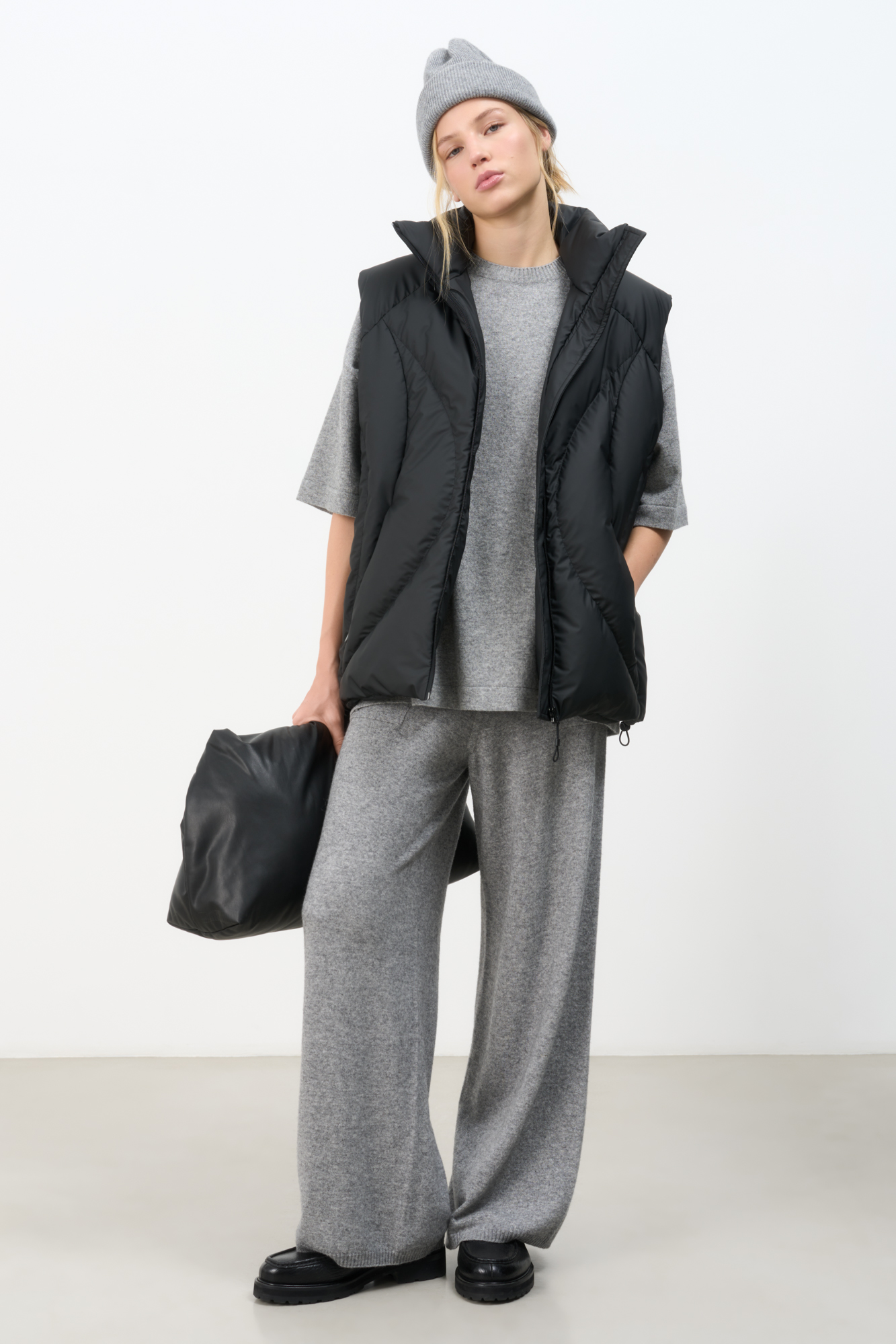 Стеганый жилет на пуху с регулируемой кулиской по краям. Модель свободного силуэта с воротником-стойкой и застежкой на молнию.