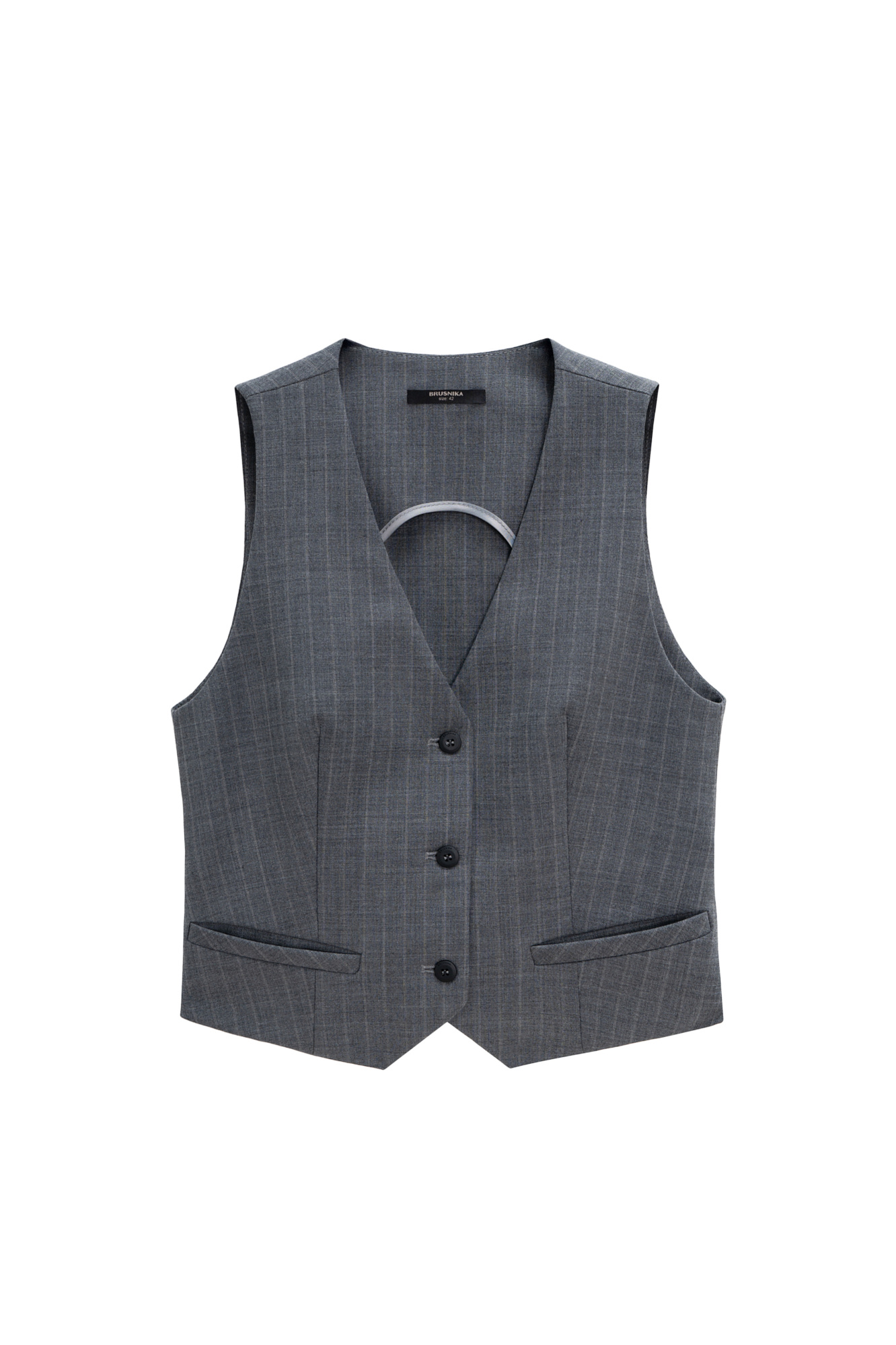 Классический жилет из шерсти. Модель прямого кроя с имитацией карманов и V-образным вырезом. Застежка на три пуговицы. Изделие без подкладки.