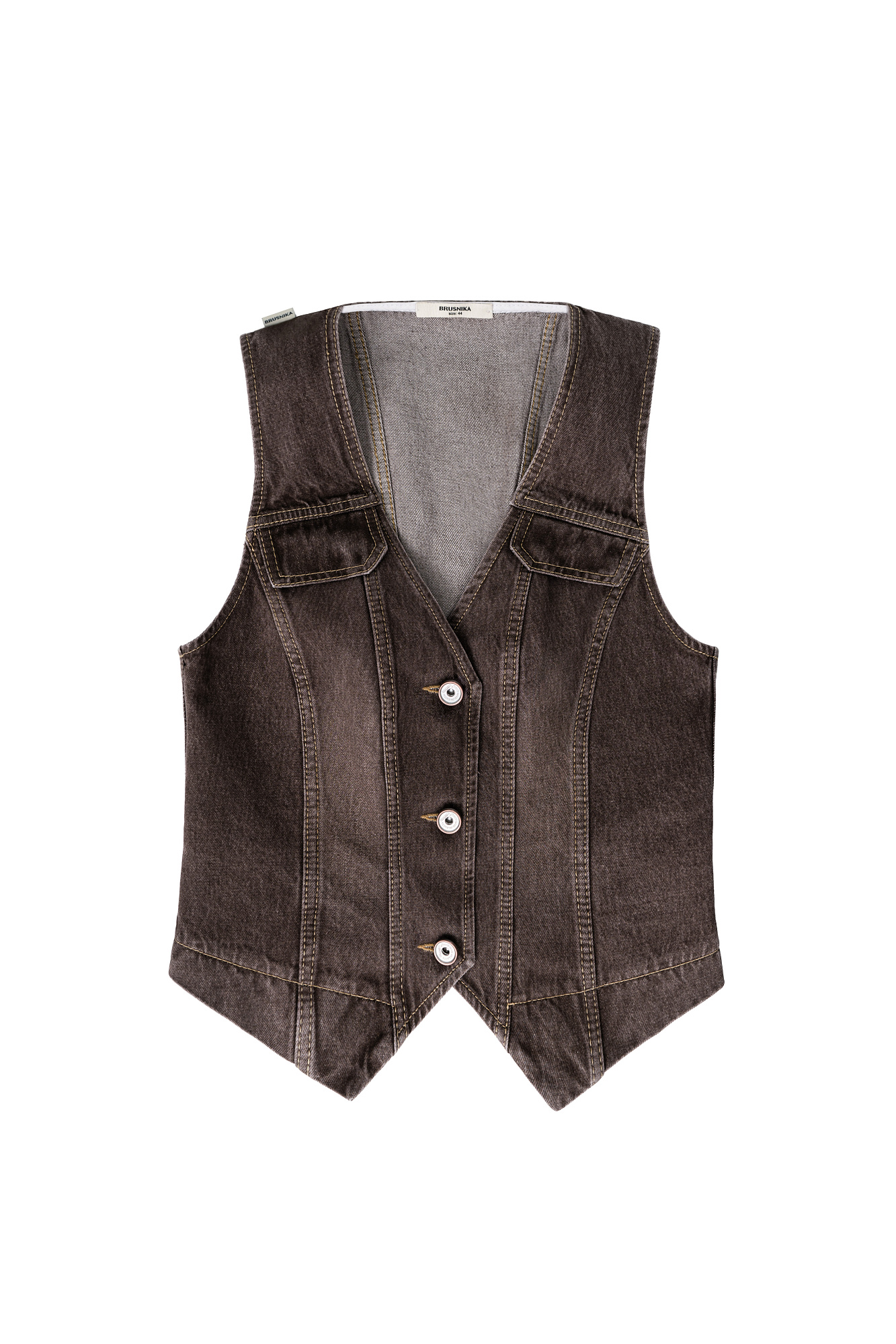 Джинсовый жилет из 100% хлопка. Модель прямого кроя с V-образным вырезом горловины и объемными вертикальными швами. Застежка на три металлические кнопки. Изделие без подкладки.