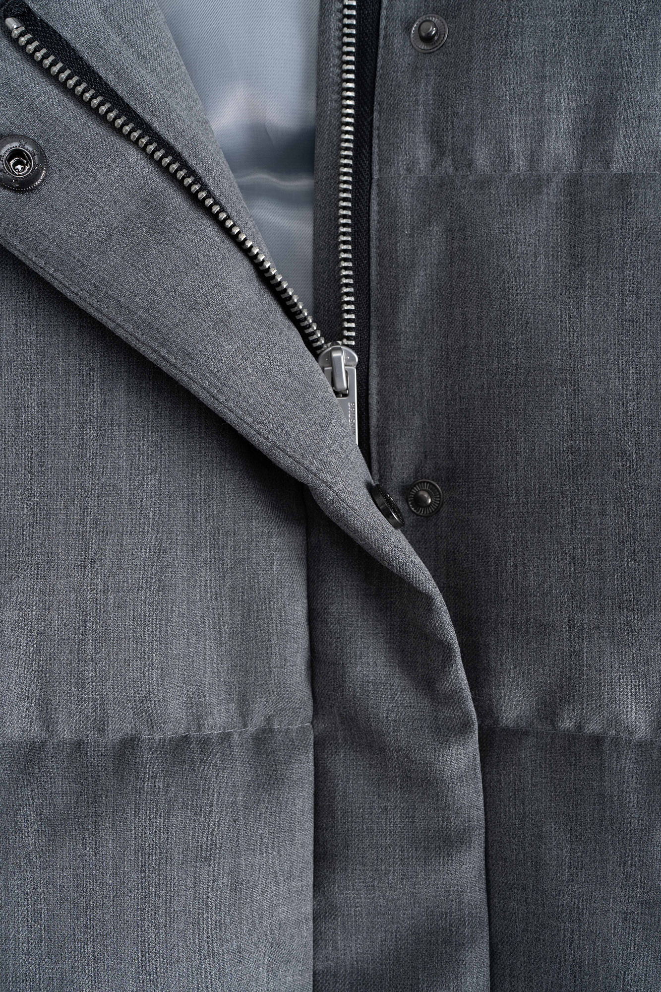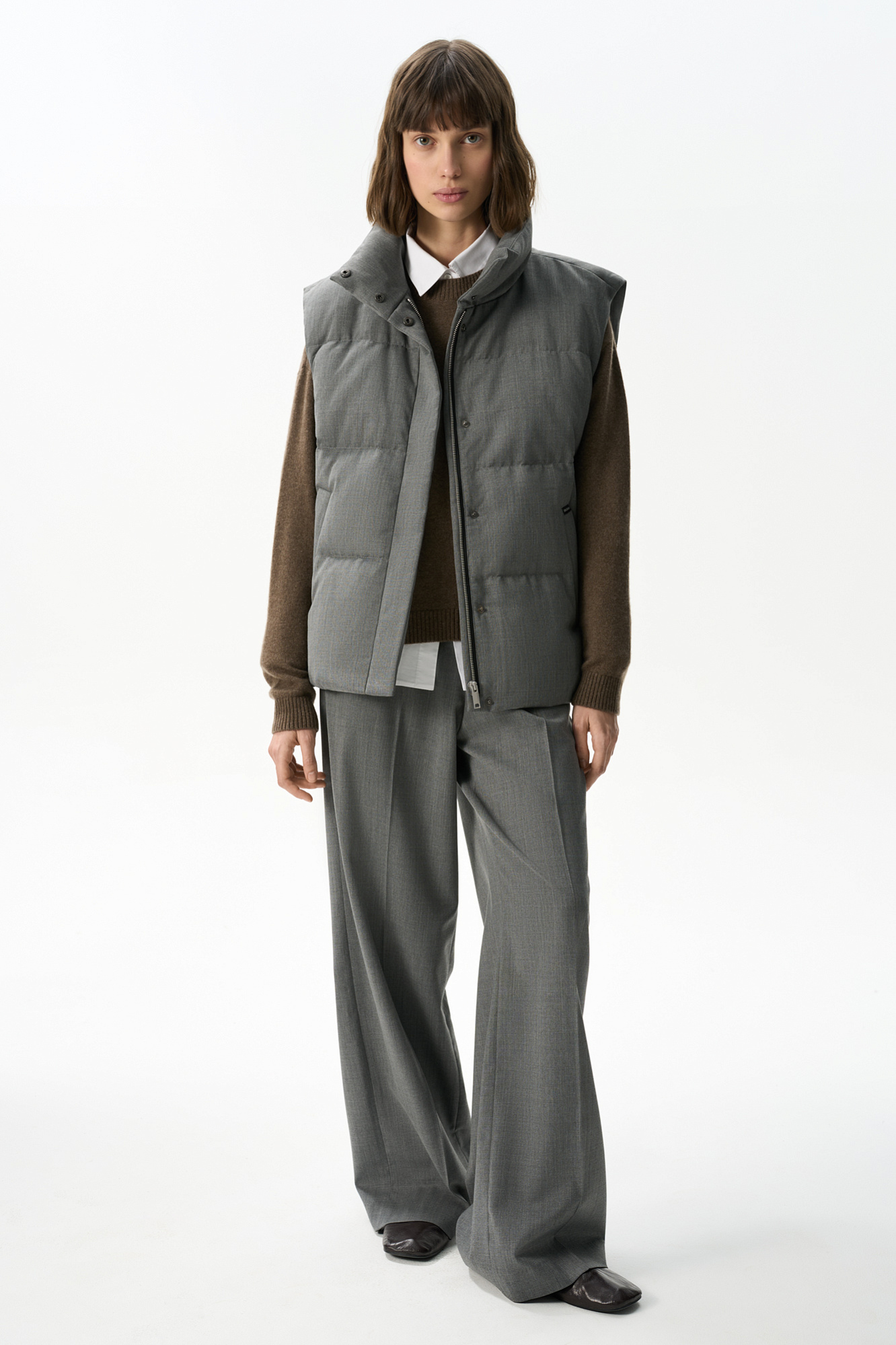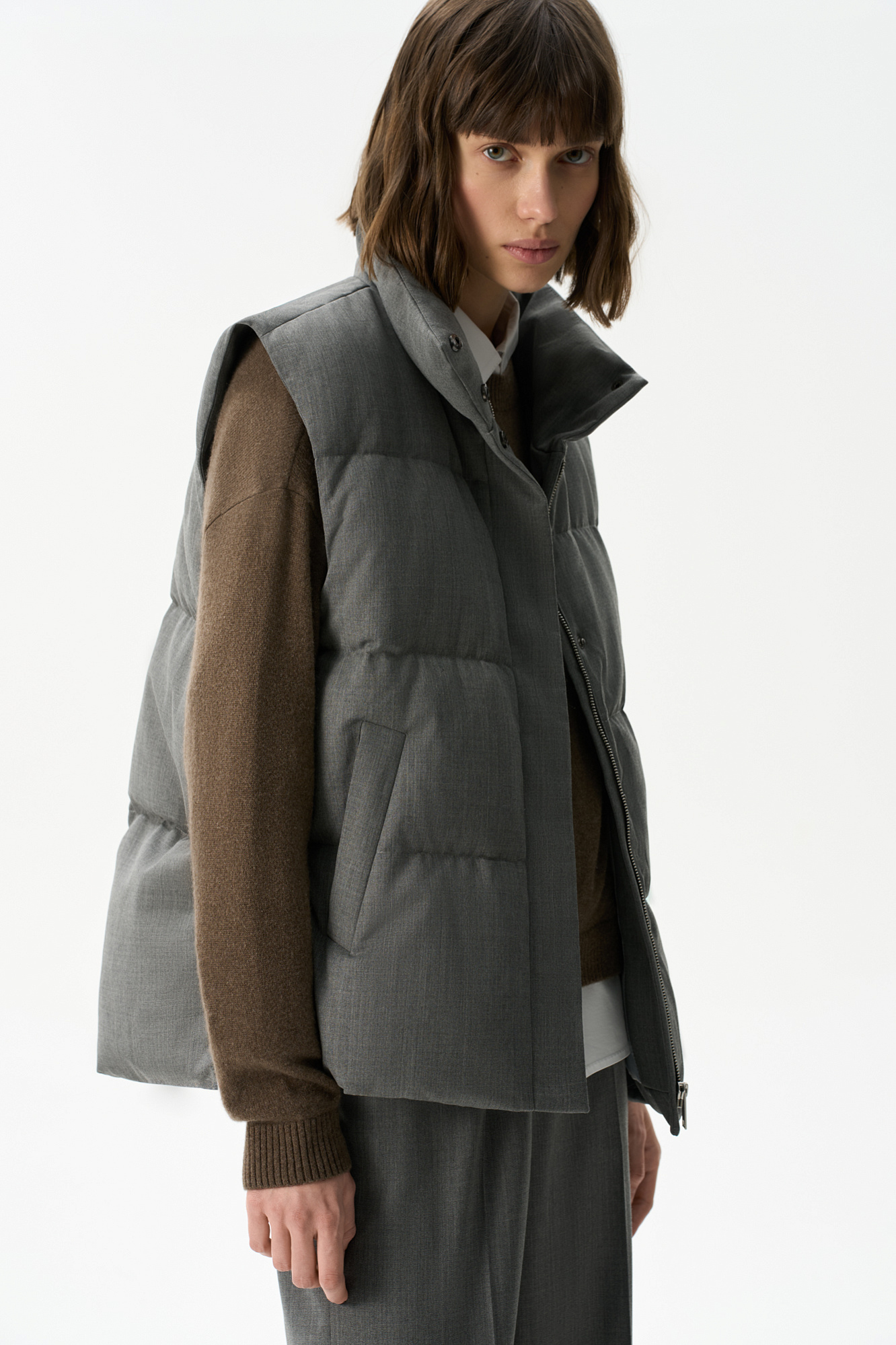Жилет на пуху с воротником-стойкой. Верх изделия выполнен из смесовой шерсти. Модель свободного силуэта с двумя боковыми карманами. Застежка на молнию и кнопки под планкой. На подкладке.