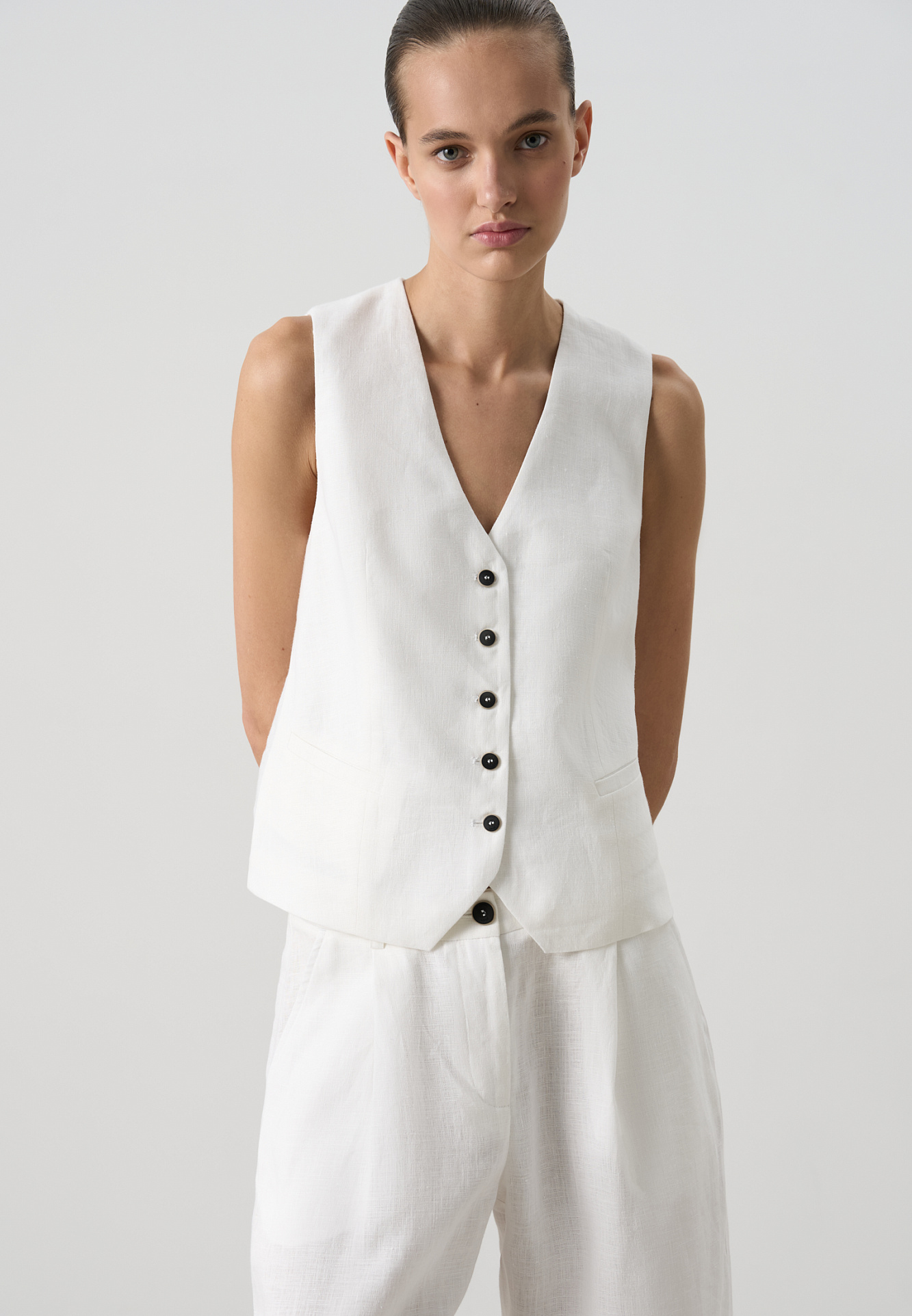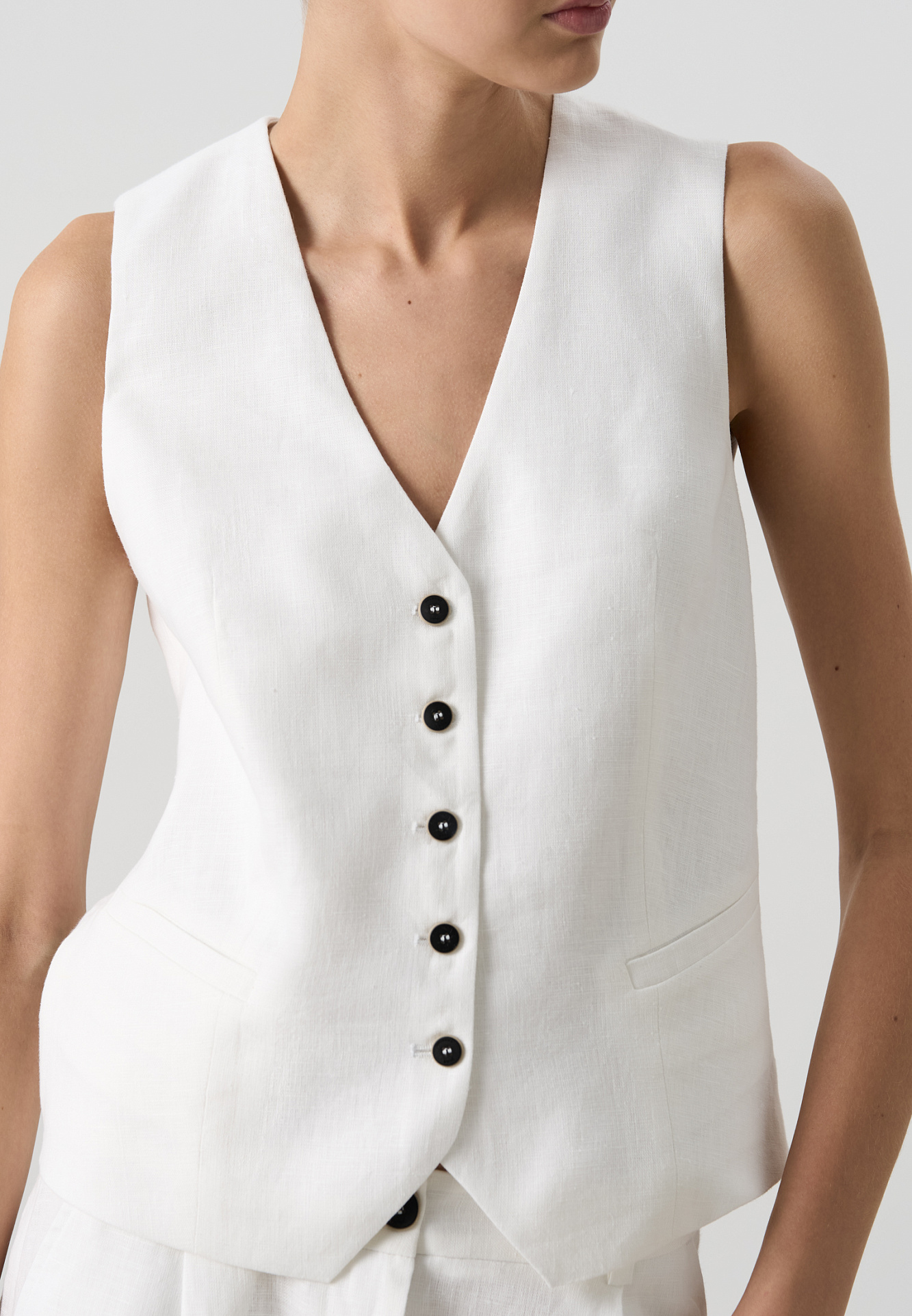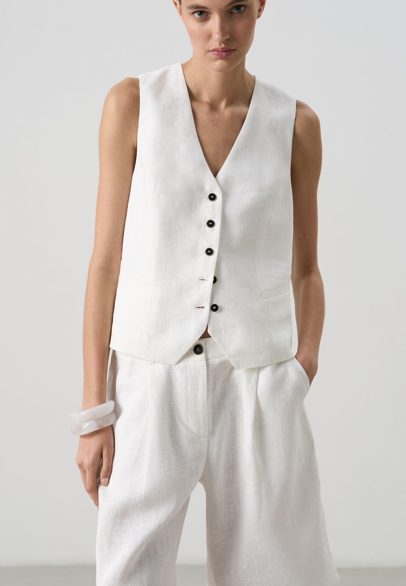 Классический жилет из 100% льна. Модель прямого кроя, с V-образным вырезом, карманами и застежкой на пуговицы.