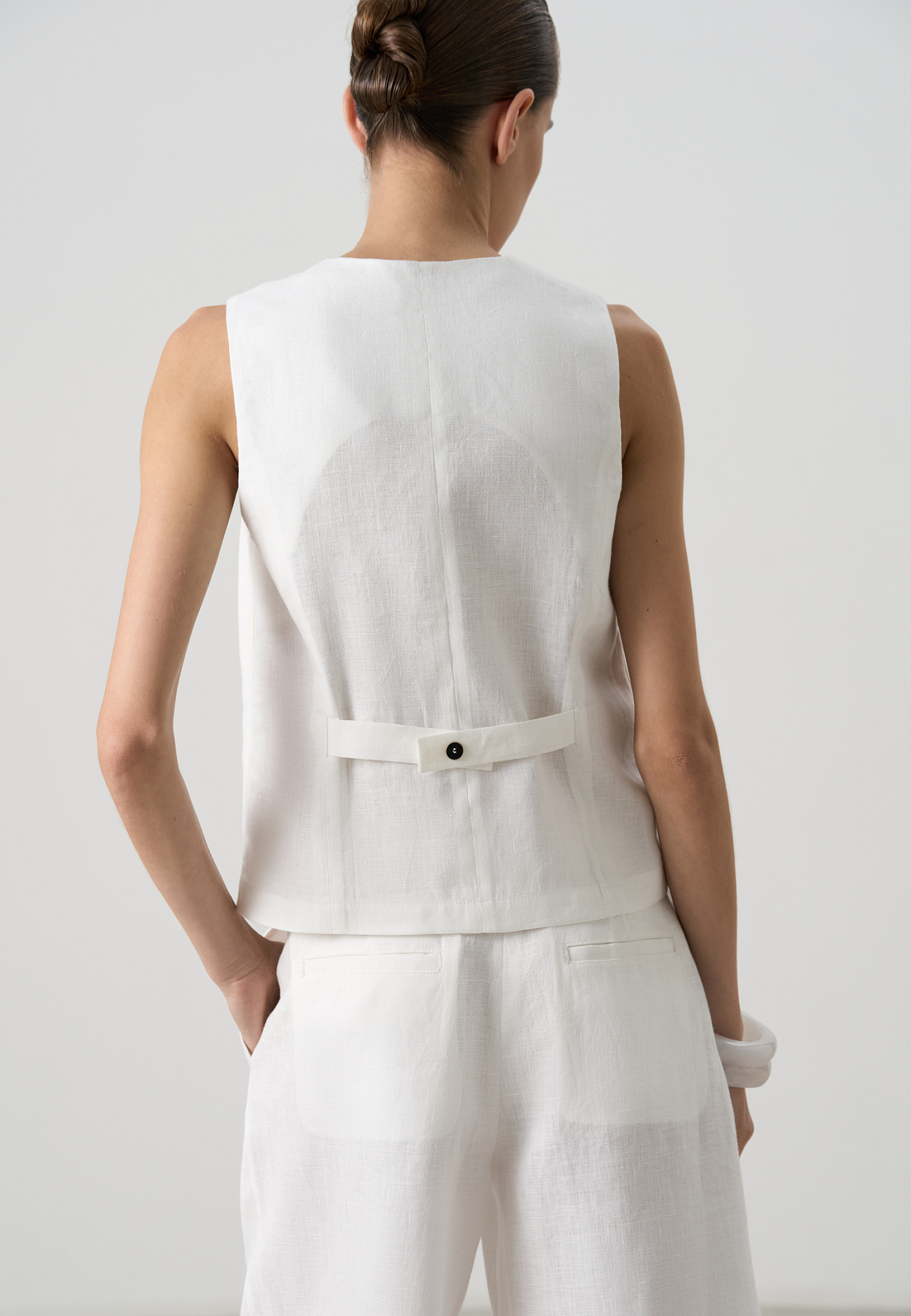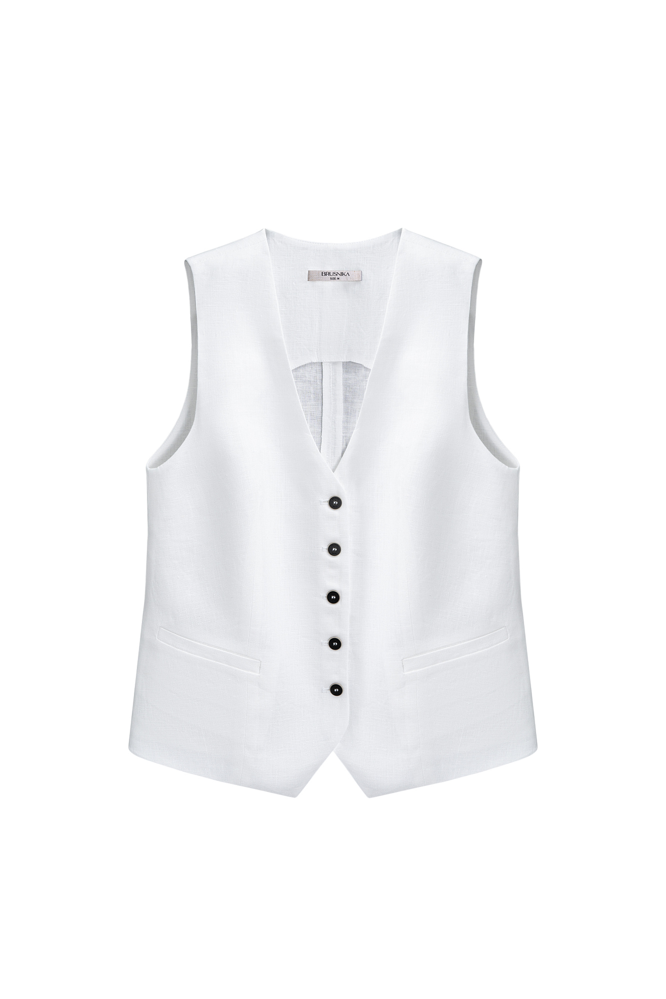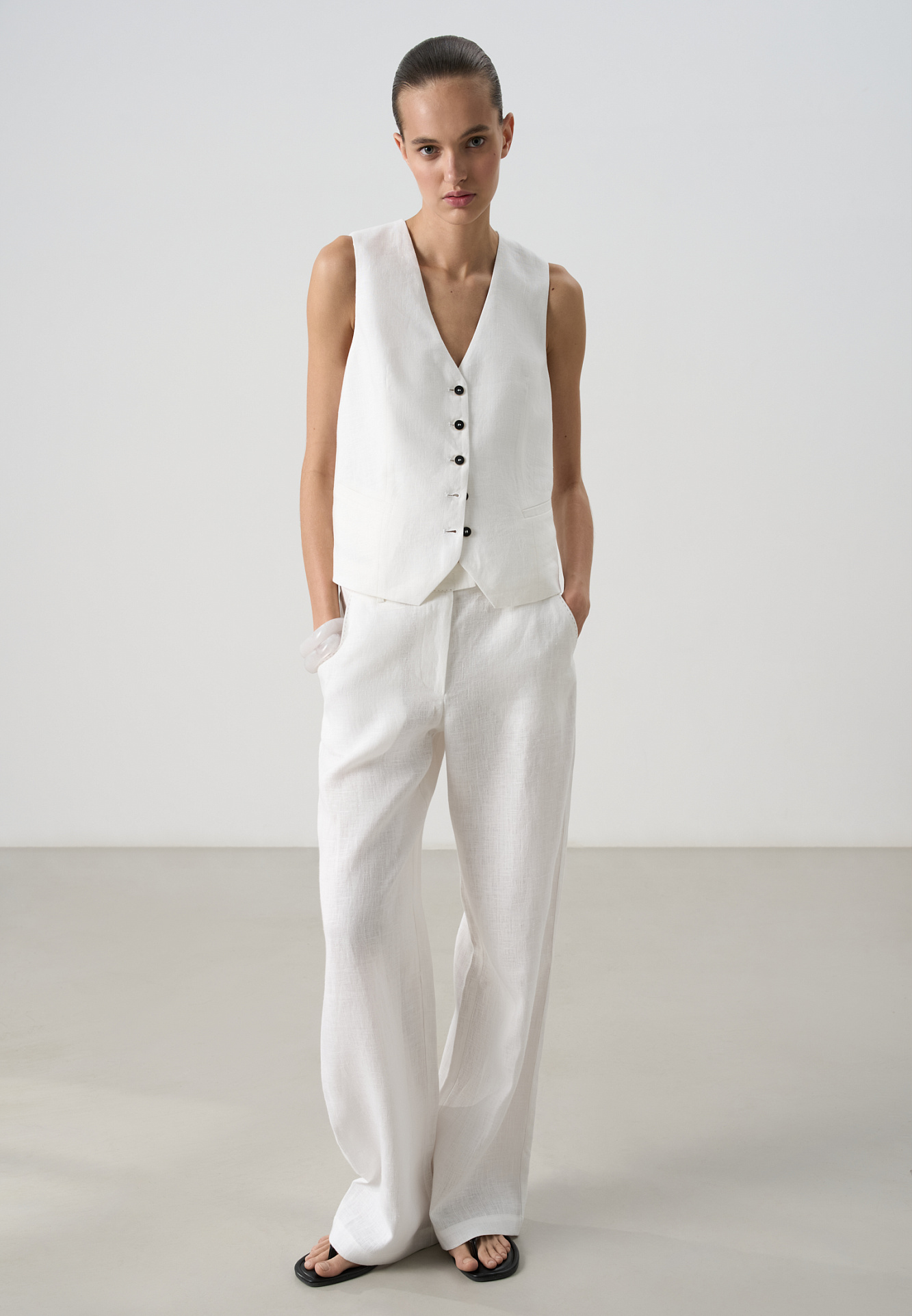 Классический жилет из 100% льна. Модель прямого кроя, с V-образным вырезом, карманами и застежкой на пуговицы.